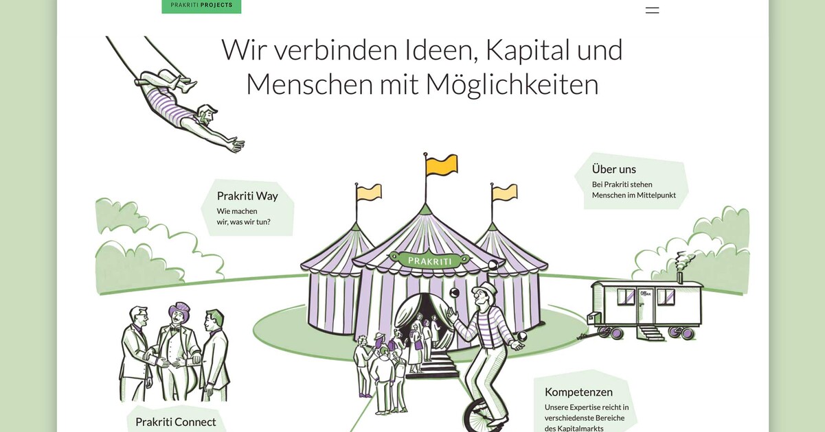 Ein interaktives Keyvisual setzt die Kernthemen visuell klar und eingängig in Szene: Die Metapher des Zirkus verleiht den abstrakten Themen eine lebendige, erlebbare Gestalt. Dieses inspirierende Gestaltungskonzept spiegelt Prakritis Rolle wider – als Brückenbauer zwischen ambitionierten Projekten und Investoren. Pikka arbeitet eng mit dem Kunden zusammen um die zentralen Botschaften herauszuarbeiten, entwirft das Screendesign, zeichnet detailreich von Hand und animiert die Illustrationen. So entsteht eine Website mit maßgeschneiderten Bildwelten, einem konsequent markenkonformen Stil und einer hohen Differenzierung in der Branche.
