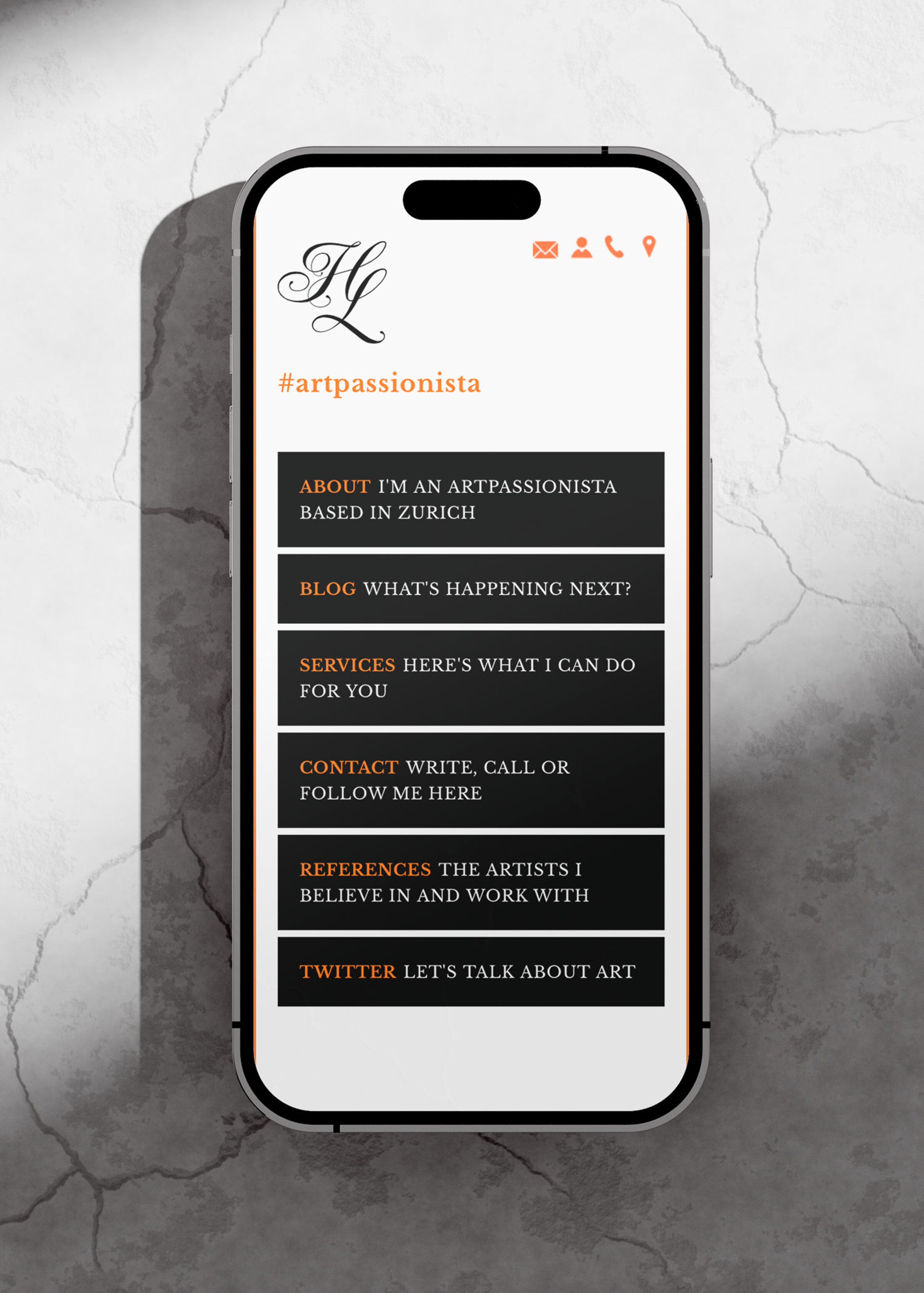 Gemeinsam mit Helena Lundin planten wir das Erscheinungsbild bis ins Detail. Besonders auffällig sind die neon-orange gesprayten Formatränder der Briefschaft und die geprägten Initialbuchstaben. Diese Details verleihen dem Design eine charmante und hochwertige Ausstrahlung, die wir auf der Webseite fortführten. Das Neon-Orange als Erkennungsmerkmal schafft einen starken visuellen Auftritt, der sowohl in der Kunstszene als auch in der Kunstberatung einen bleibenden Eindruck hinterlässt.
