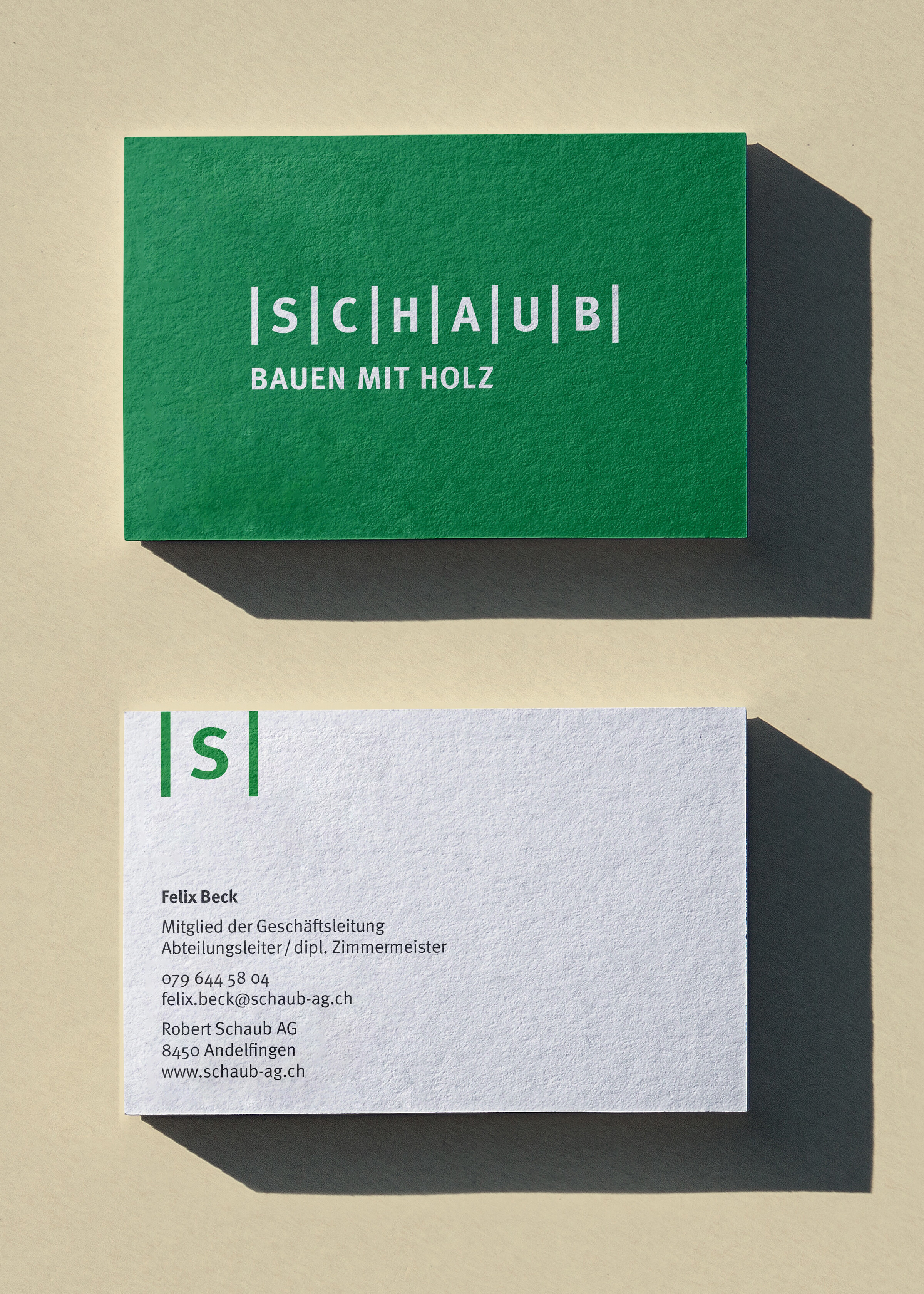 Mit einem Mix aus Bestehendem und Neuem haben wir für die Robert Schaub AG einen prägnanten Markenauftritt mit grosser Wiedererkennung entwickelt, der sich flexibel über verschiedene Medien und Kanäle anwenden lässt. Selbst im Kontext einer unruhigen Baustellen-Situation wirkt die Marke selbstsicher und stark. Das charakteristische Grün kommt konsequent zum Einsatz und bildet mit den vertikalen Strichen aus dem Logo eines der wichtigsten Elemente für das Erscheinungsbild.