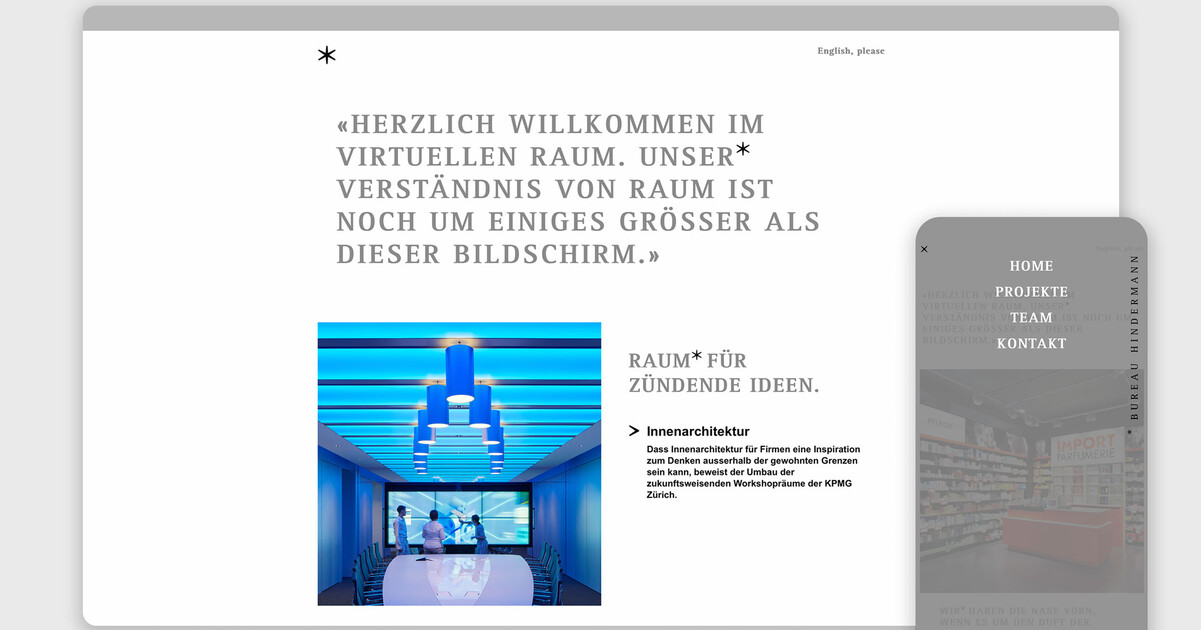 Das reduzierte Design der frisch konzipierten Portfolio-Webseite bildet die Bühne für die kreativen Projekte im Bereich Innenarchitektur. Ganz im Sinne der Philosophie von Bureau Hindermann dürfen ein paar unkonventionelle Gestaltungsideen nicht fehlen. Das Screendesign fügt sich perfekt in die übrige Erlebniskette von Bureau Hindermann ein.