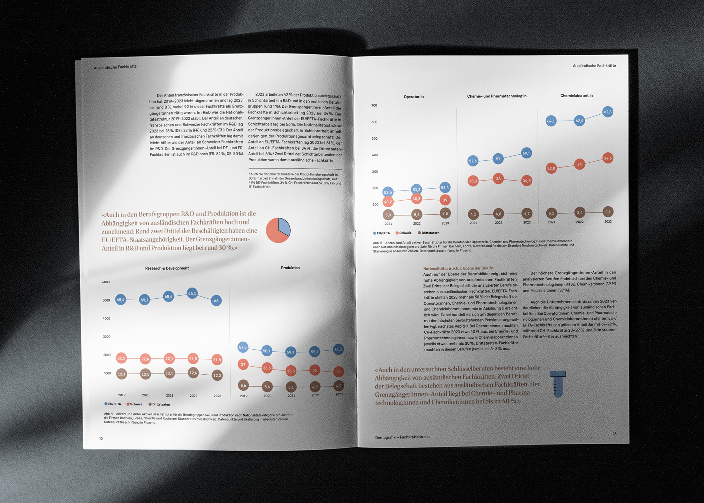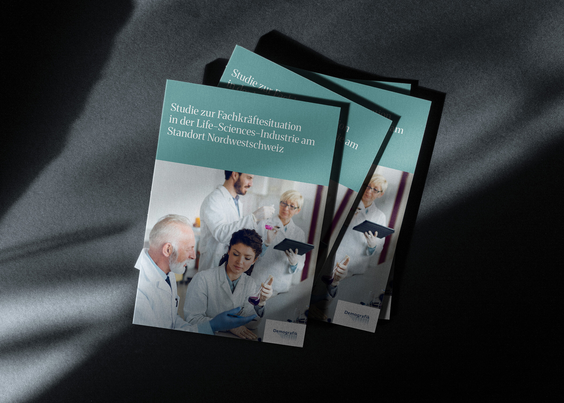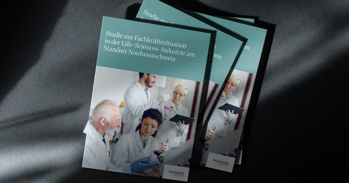 Die Publikation von Demografik untersucht die Belegschaftsdaten von vier führenden Life-Sciences-Unternehmen im Zeitraum 2019–2023. Sie beleuchtet die Gesamtbelegschaft sowie definierte Schlüsselberufsgruppen und zeigt auf, wo Engpässe bestehen und weshalb die Region Nordwestschweiz auf internationale Fachkräfte angewiesen ist. Wir bereiteten das Thema visuell und strukturell so auf, dass die wichtigsten Erkenntnisse schnell erfassbar werden. Grafiken und Icons veranschaulichen die Entwicklungen.