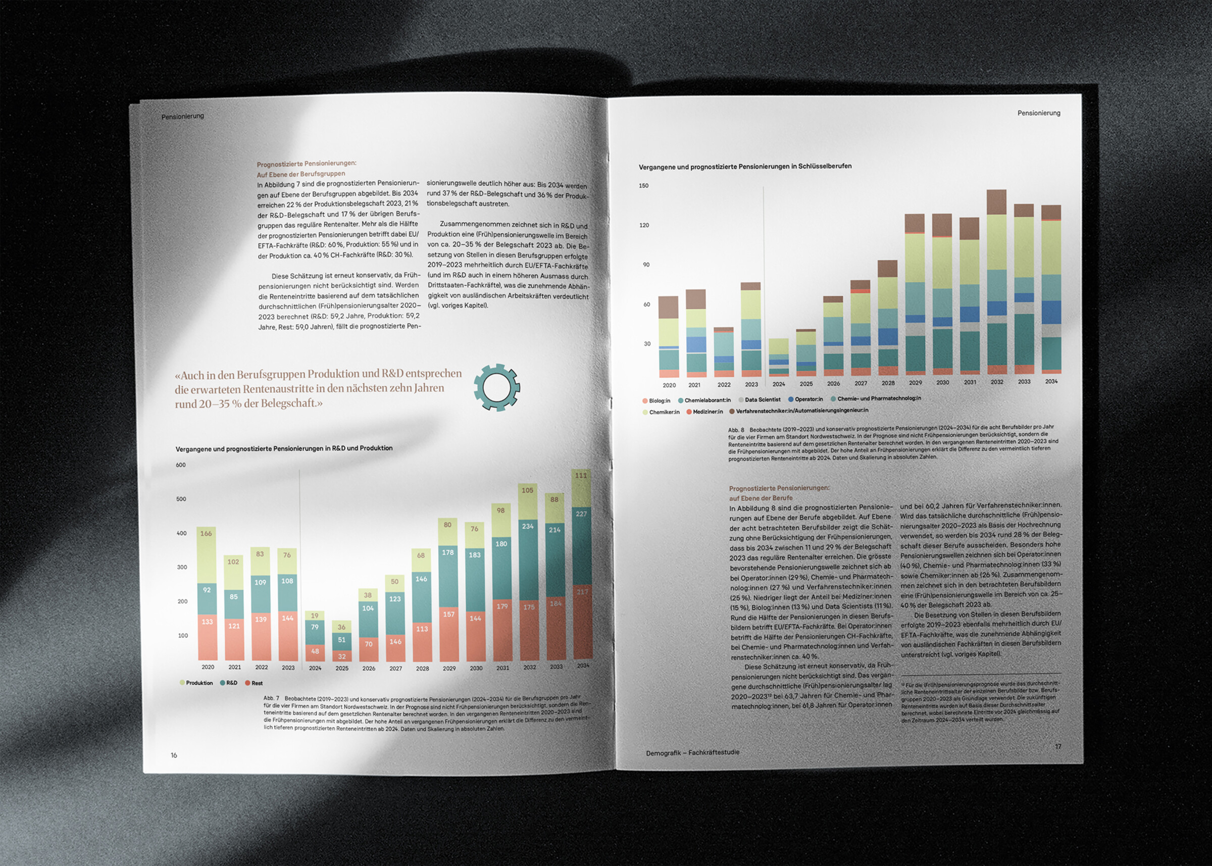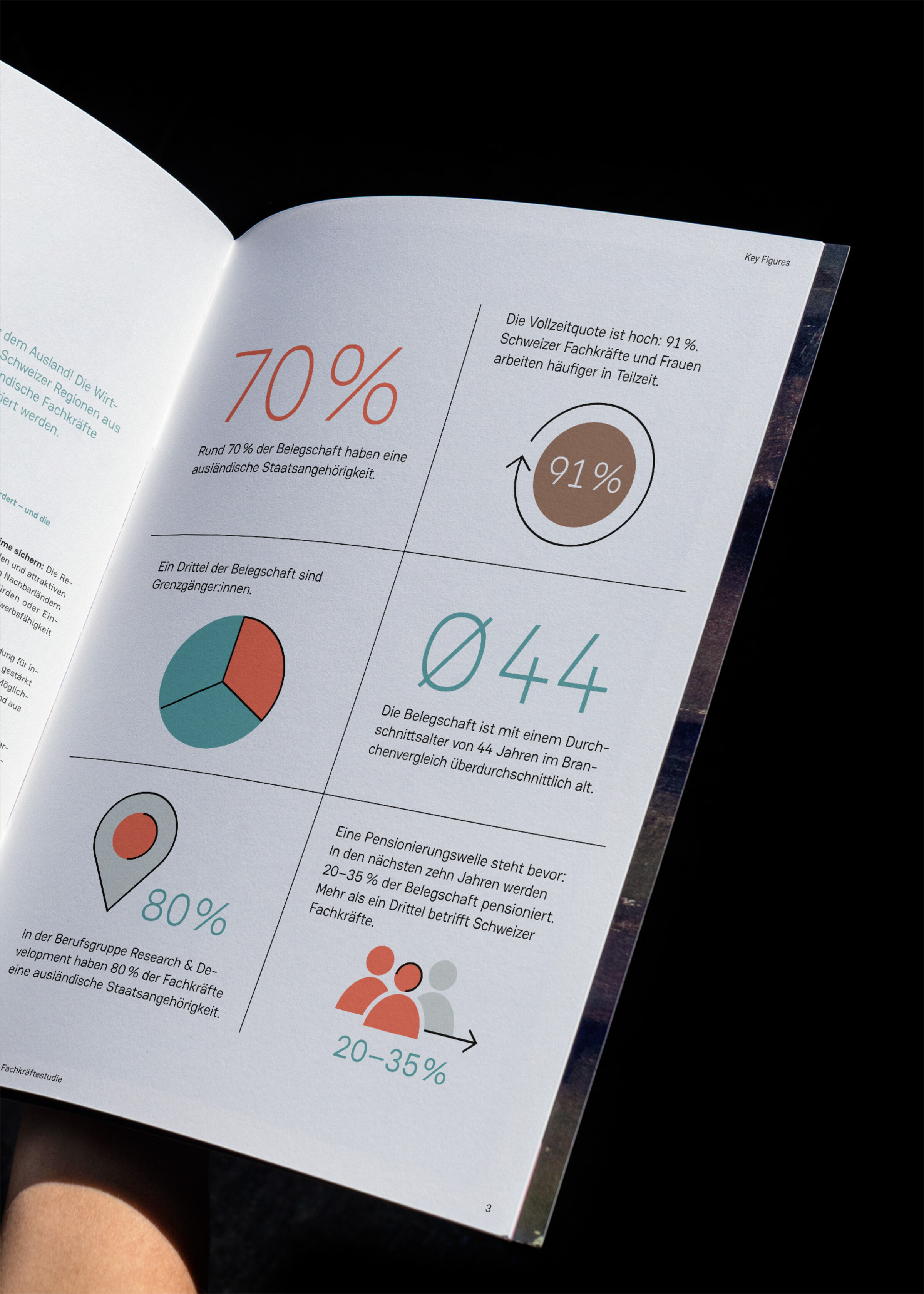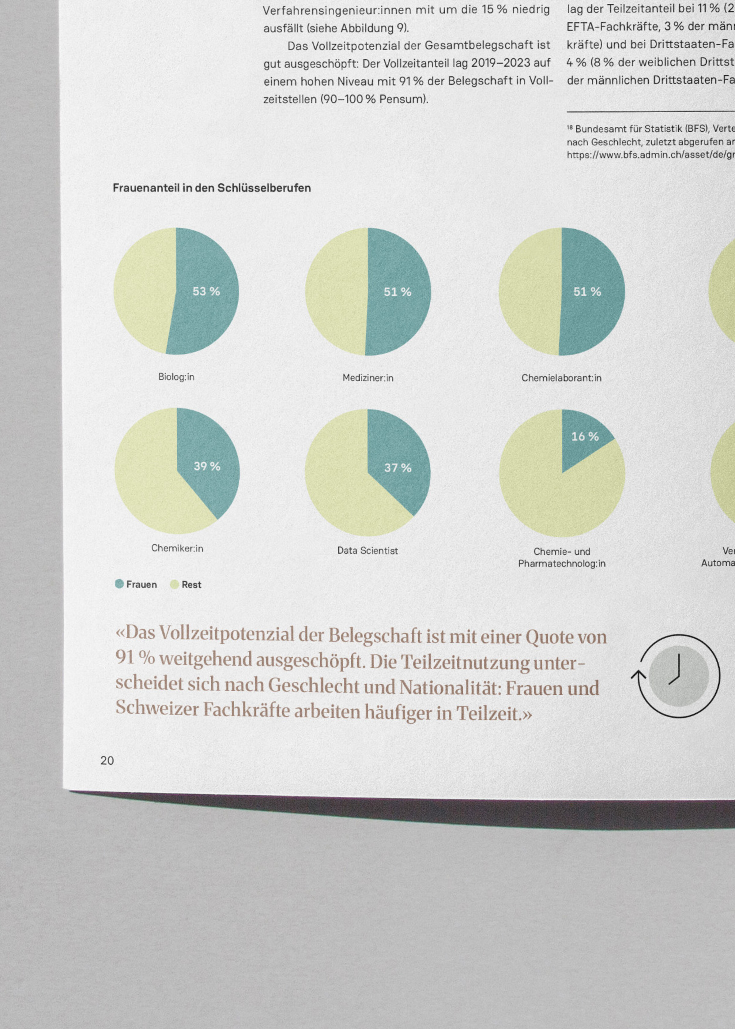 Die Publikation von Demografik untersucht die Belegschaftsdaten von vier führenden Life-Sciences-Unternehmen im Zeitraum 2019–2023. Sie beleuchtet die Gesamtbelegschaft sowie definierte Schlüsselberufsgruppen und zeigt auf, wo Engpässe bestehen und weshalb die Region Nordwestschweiz auf internationale Fachkräfte angewiesen ist. Wir bereiteten das Thema visuell und strukturell so auf, dass die wichtigsten Erkenntnisse schnell erfassbar werden. Grafiken und Icons veranschaulichen die Entwicklungen.