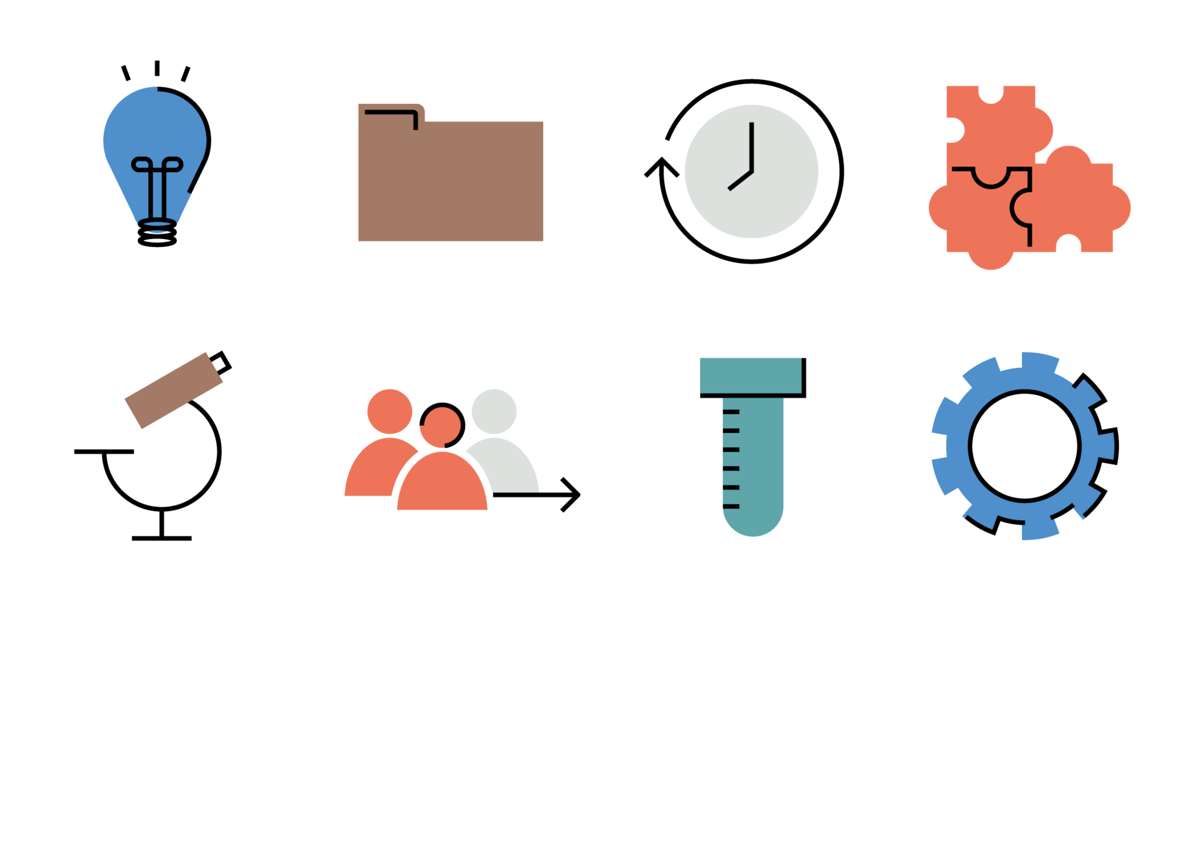 Flächige Icons mit punktuellen Outline-Details schaffen eine klare und prägnante Bildsprache. Die Kombination aus reduzierten Formen und feinen linearen Akzenten verleiht der Iconsprache eine eigenständige, ruhige Charakteristik. Sie ergänzen die Kernaussagen in der Broschüre.