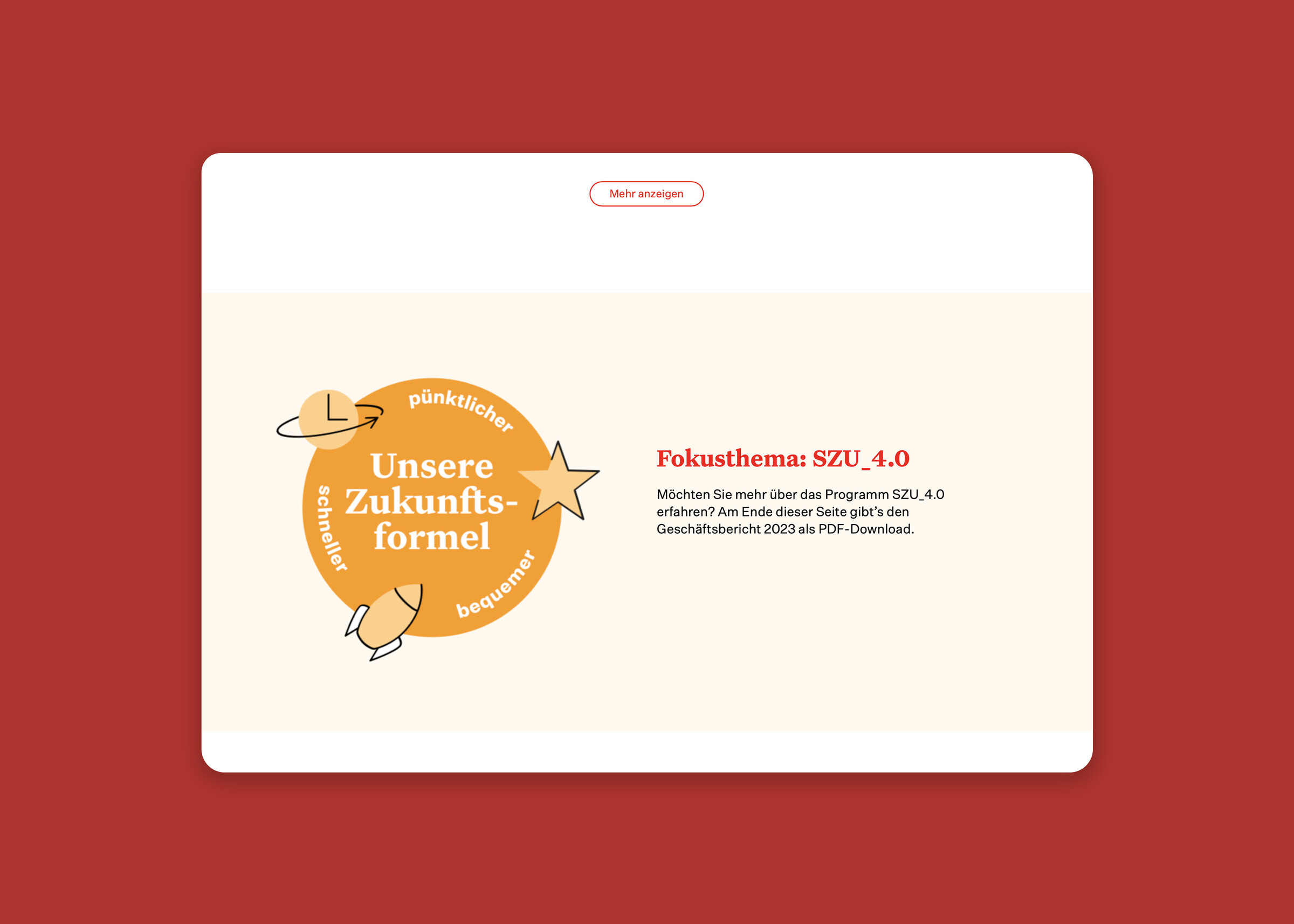 Neben den üblichen Ressort- und Finanzberichten beleuchtet der neu designte SZU-Geschäftsbericht auch das Thema «Modernisierungsprogramm». Im digitalen Geschäftsbericht erfahren die Leser:innen mehr über die Highlights des letzten Jahres.
