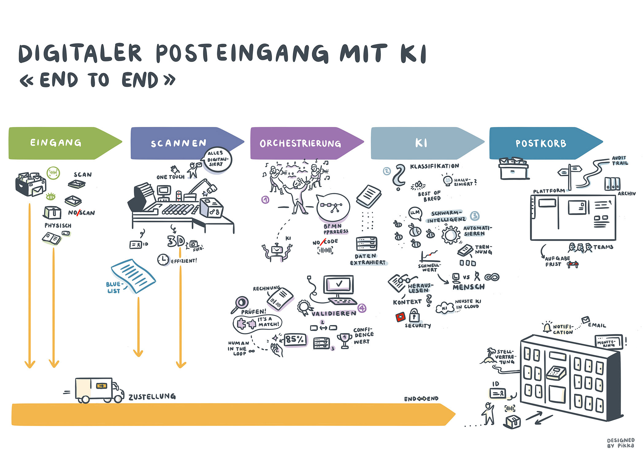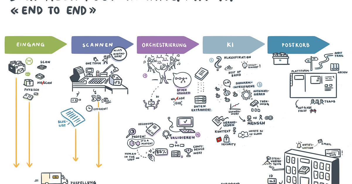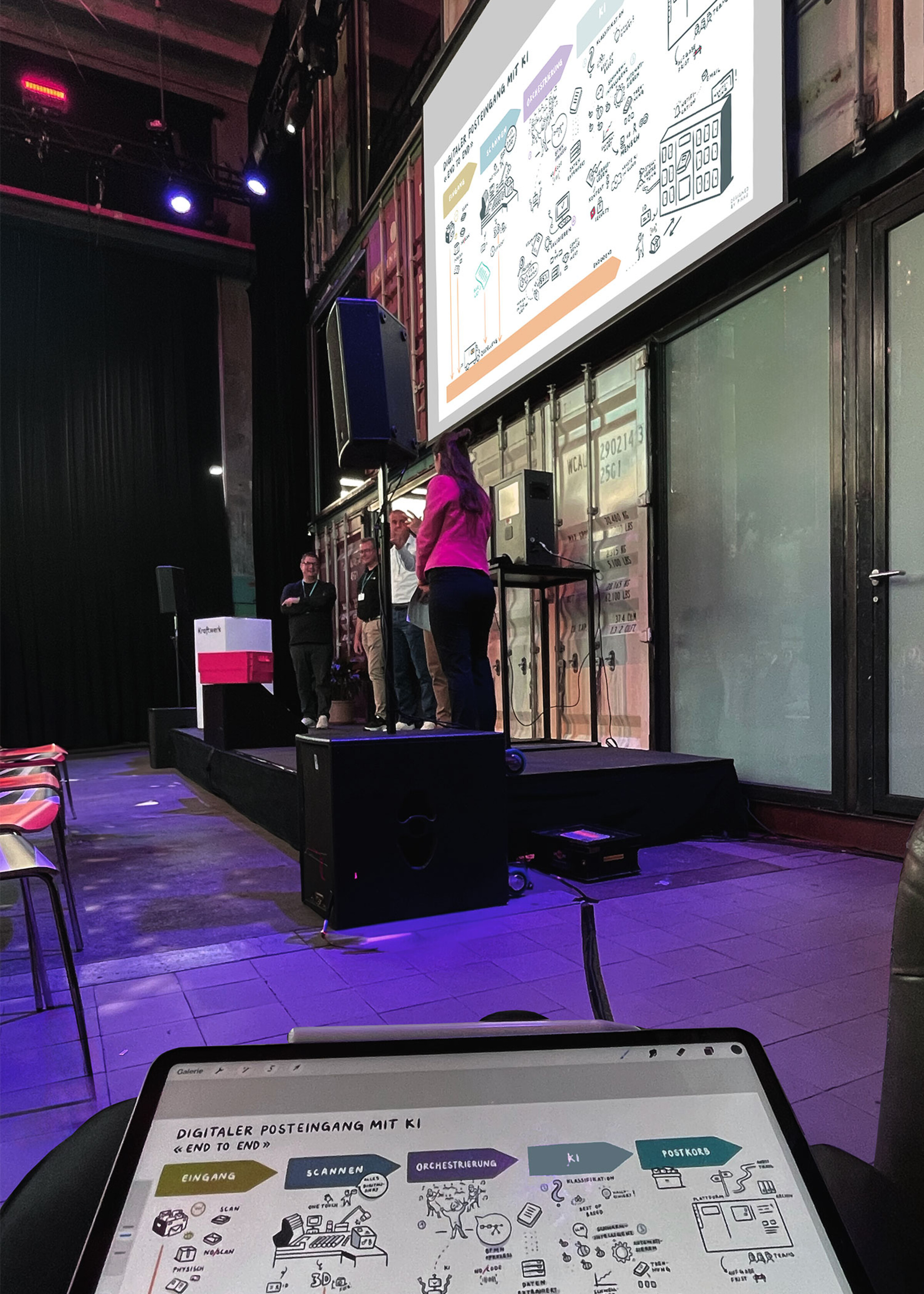 Digitalisieren, automatisieren, archivieren - dies sind drei wichtige Begriffe, die während des Netzwerktreffens des Digitalsierungsunternehmens Arcplace vermehrt diskutiert werden. Vier Stimmen erläutern verschiedene Prozesse, während live im Hintergrund ein Visual entsteht: Ganz im Sinne davon, den Präsentationsmodus aufzulockern und ein visuelles Protokoll der Veranstaltung zu bieten.