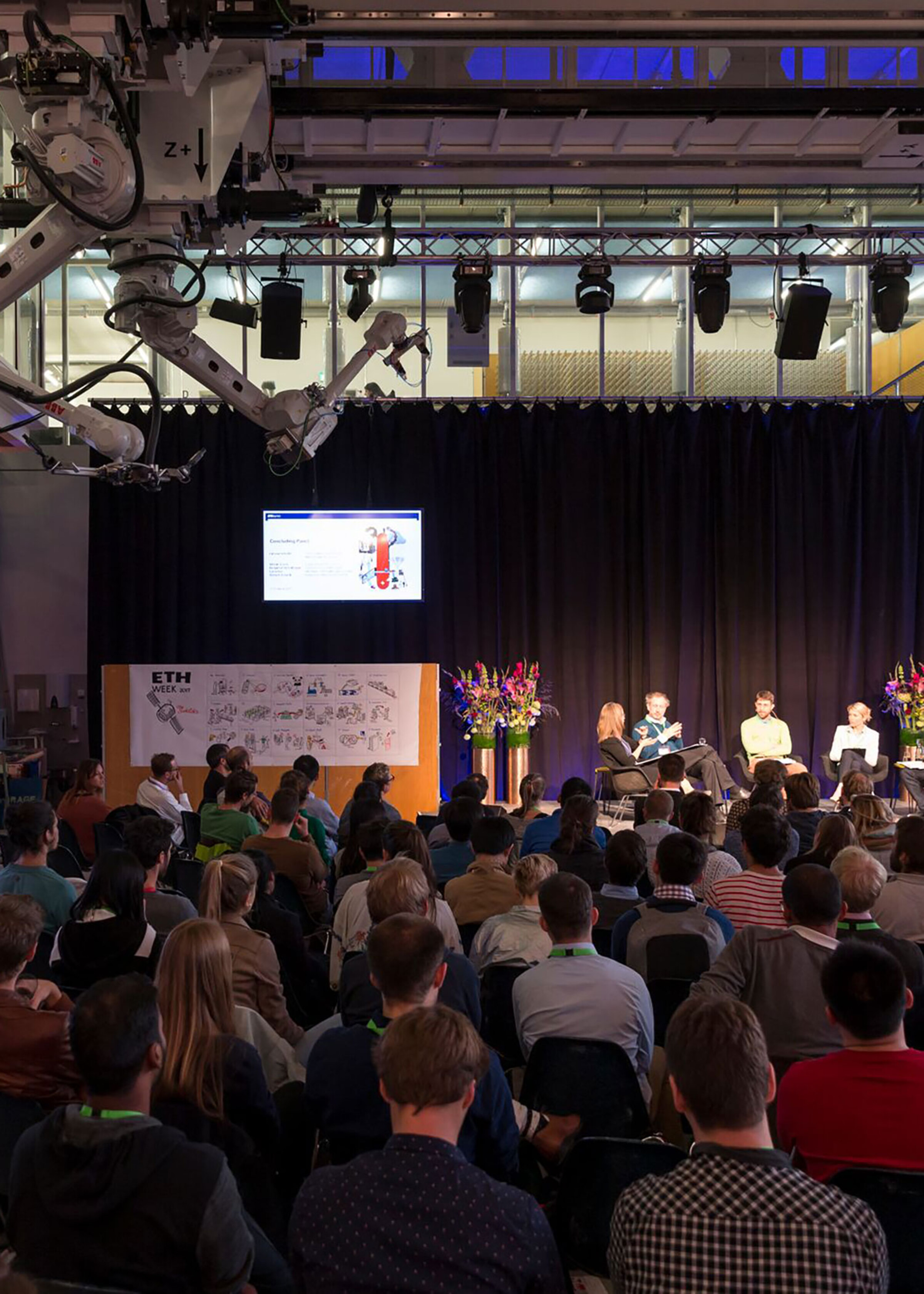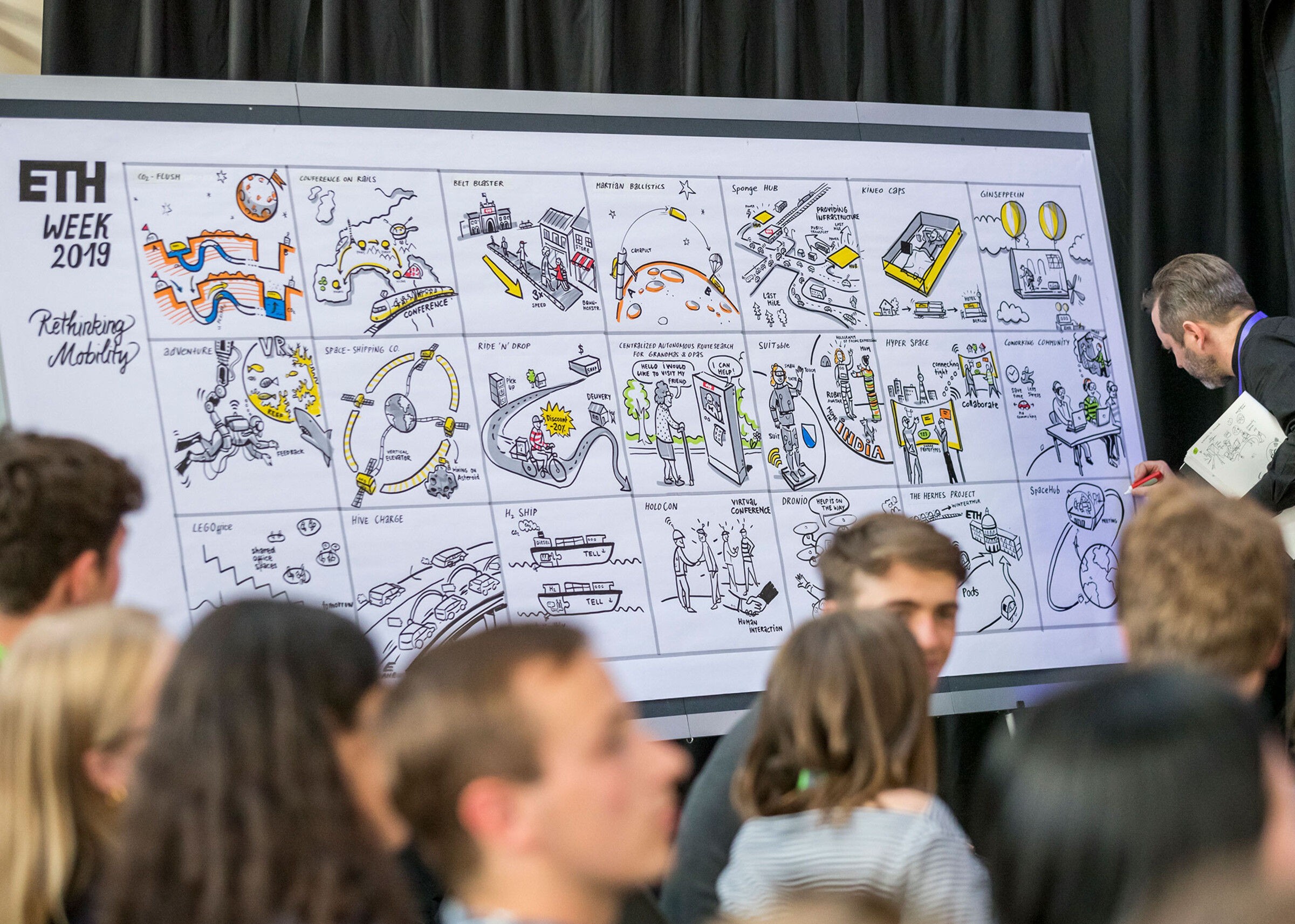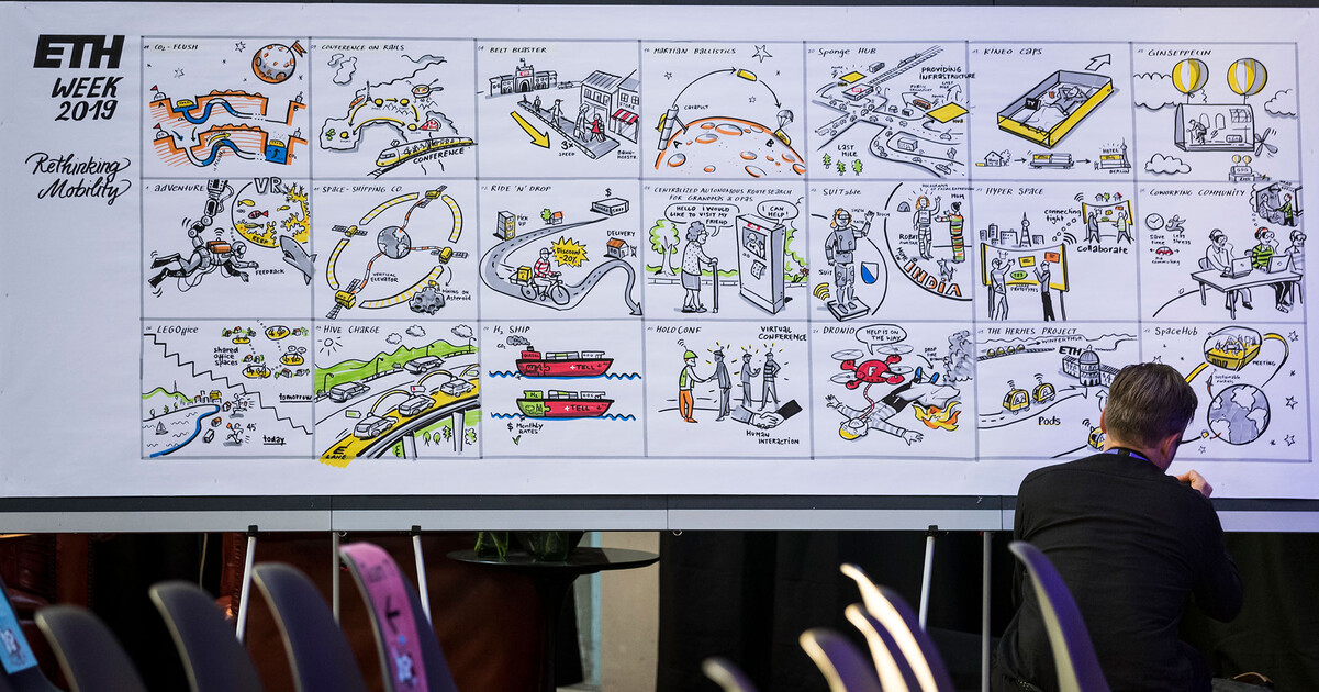 Im Rahmen der ETH Weeks widmen sich jeweil rund 200 Studierende mehrere Tage lang Themen wie «Rethinking Mobility» und «Manufacturing the Future». Über mehrere Jahre dokumentierten wir mit Graphic Recordings die Lösungen, die die Teams zu Herausforderungen der Zukunft erarbeiteten. Im Plenum präsentierten die Studierenden dann ihre von uns visualisierten Lösungsansätze.