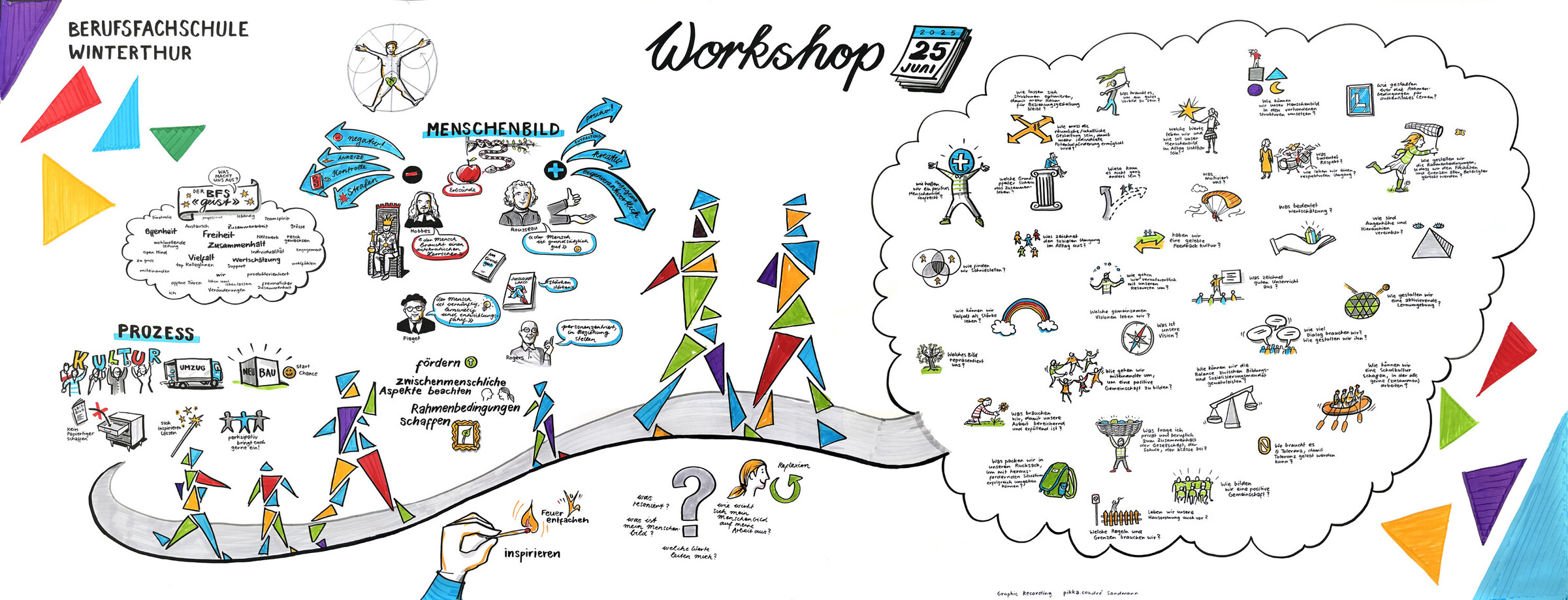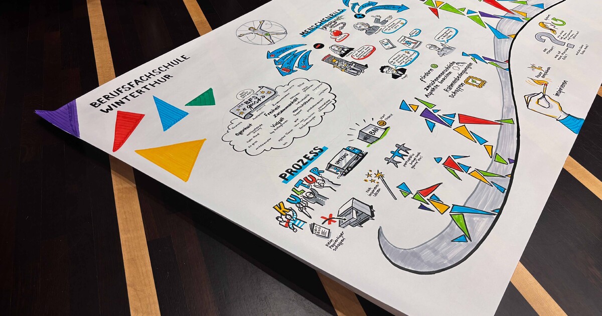 Wir hielten die Ergebnisse der Workshops und die wichtigsten Impulse in einem Graphic Recording fest. Das visuelle Protokoll stiess auf grosse Resonanz: Lehrpersonen fotografierten das Bild, nutzten es als Gesprächsanlass und sorgten so dafür, dass die Fragen und Ideen weitergetragen werden.