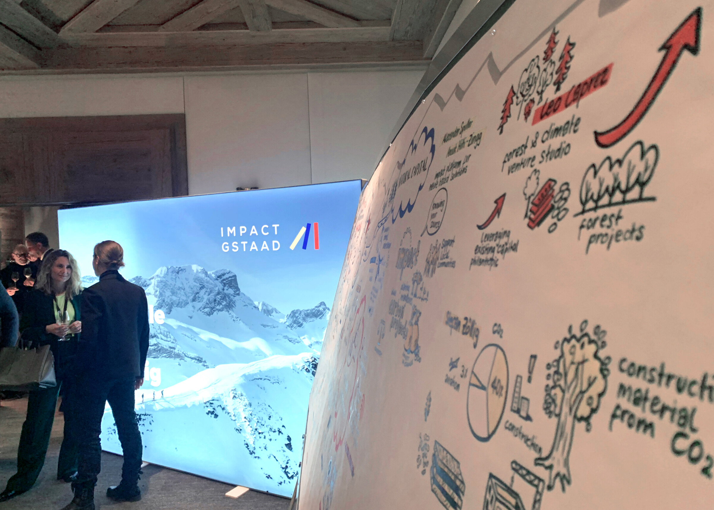 Beim ersten Impact Circle Event im Hotel The Alpina Gstaad kamen prominente Investoren, Start-ups und Unternehmer:innen zusammen, um sich in Kurzvorträgen über nachhaltige Zukunftsprojekte auszutauschen. Wir dokumentierten die gesamte Veranstaltung neben der Bühne mit Stift und Papier. Besonders in Erinnerung bleibt die Zusammenarbeit mit Moderatorin Miriam Rickli, mit der wir am Ende der Veranstaltung anhand der Illustration den Tag für die Teilnehmenden Revue passieren liessen.