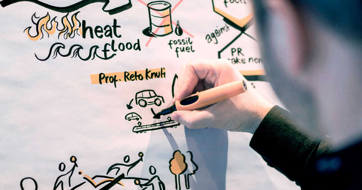 Vor dem Bild fand der Event in Gstaad seinen Abschluss (Video: Moderatorin Melanie Rickli mit Board-Member André Hoffmann). Die grosse Illustration machte den Teilnehmenden bewusst, wie viele Inputs sie im Verlaufe des Tages aufgenommen hatten. Nach dem Event bereiteten wir das handgezeichnete Plakat interaktiv auf und ergänzten es mit den Videos der Vorträge.