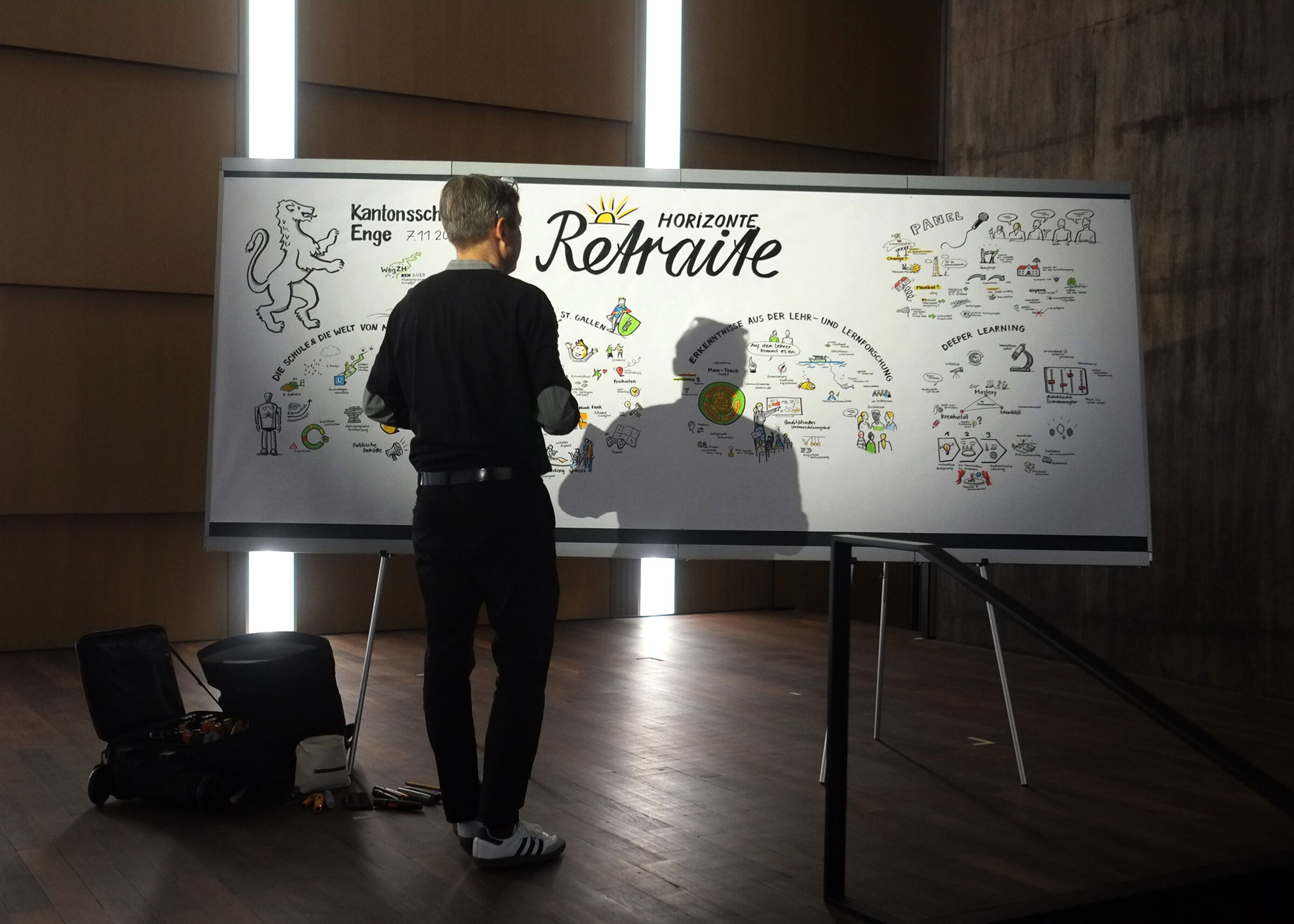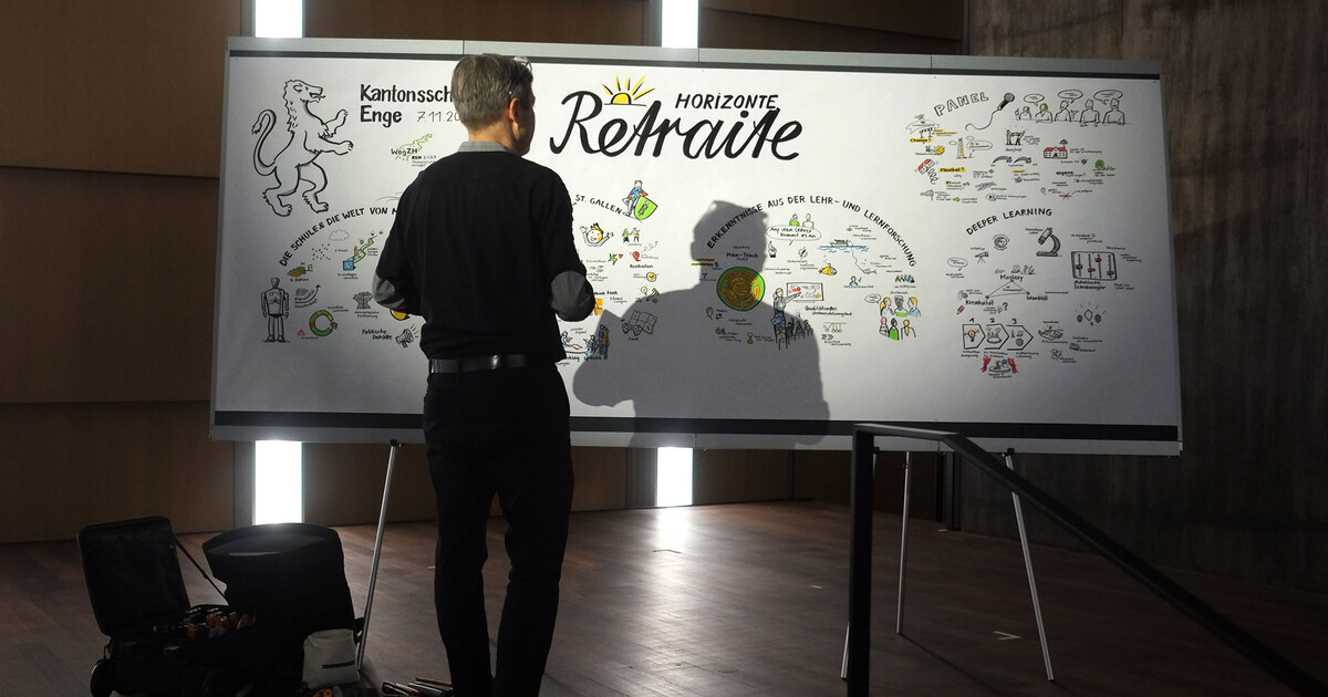 Der Vormittag vermittelte Inspiration, Informationen und Einblicke, die durch ein Graphic Recording des Illustrators von pikka begleitet wurden, der die Inputreferate und die Diskussionsrunde in der Aula live vor Publikum zeichnete – etwas, das von den Lehrpersonen sehr geschätzt wurde. Die entstandenen Zeichnungen wurden am Nachmittag während der World-Café-Session als Hintergrundbilder genutzt. Auf diese Weise flossen die Aspekte des Vormittags sichtbar und wirksam in die Diskussionsrunden des Nachmittags ein.