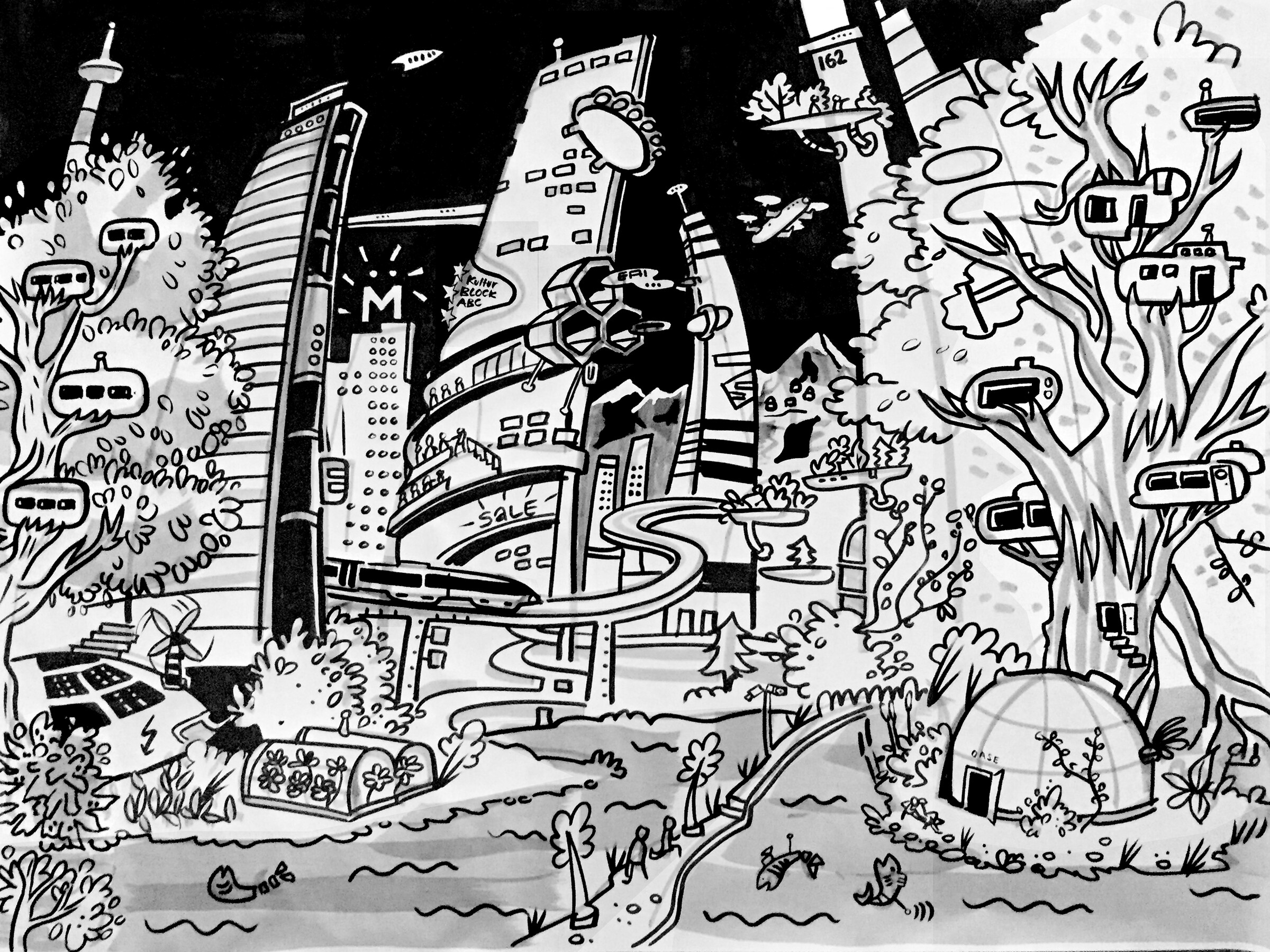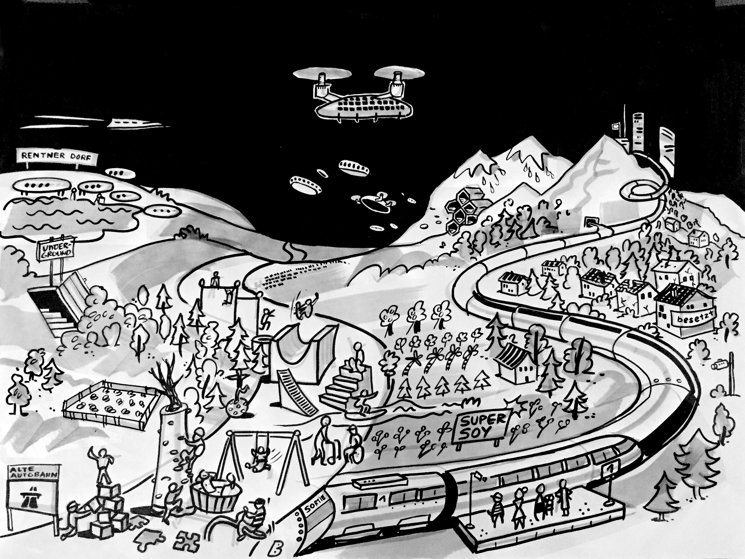 Wie sieht die Schweiz im Jahre 2050 aus? Am ersten nationalen Landschaftskongress an der Messe Luzern setzten sich die Teilnehmenden unter anderem mit dieser abstrakten Frage auseinander. Wir dokumentierten die gesammelten Ideen auf einer Graphic Wall. Dann wurden diese in drei Illustrationen zusammengefasst und ausgestellt.