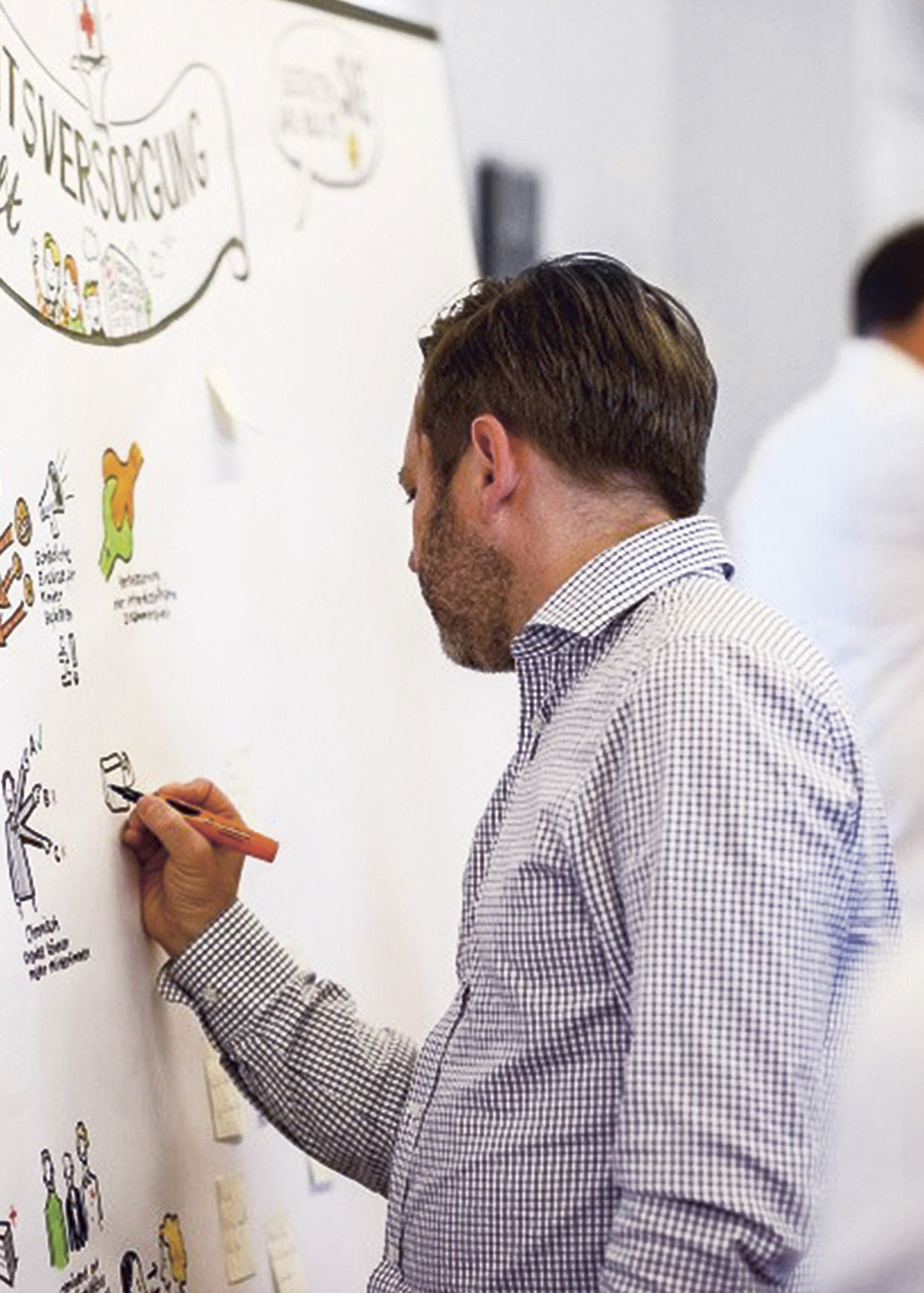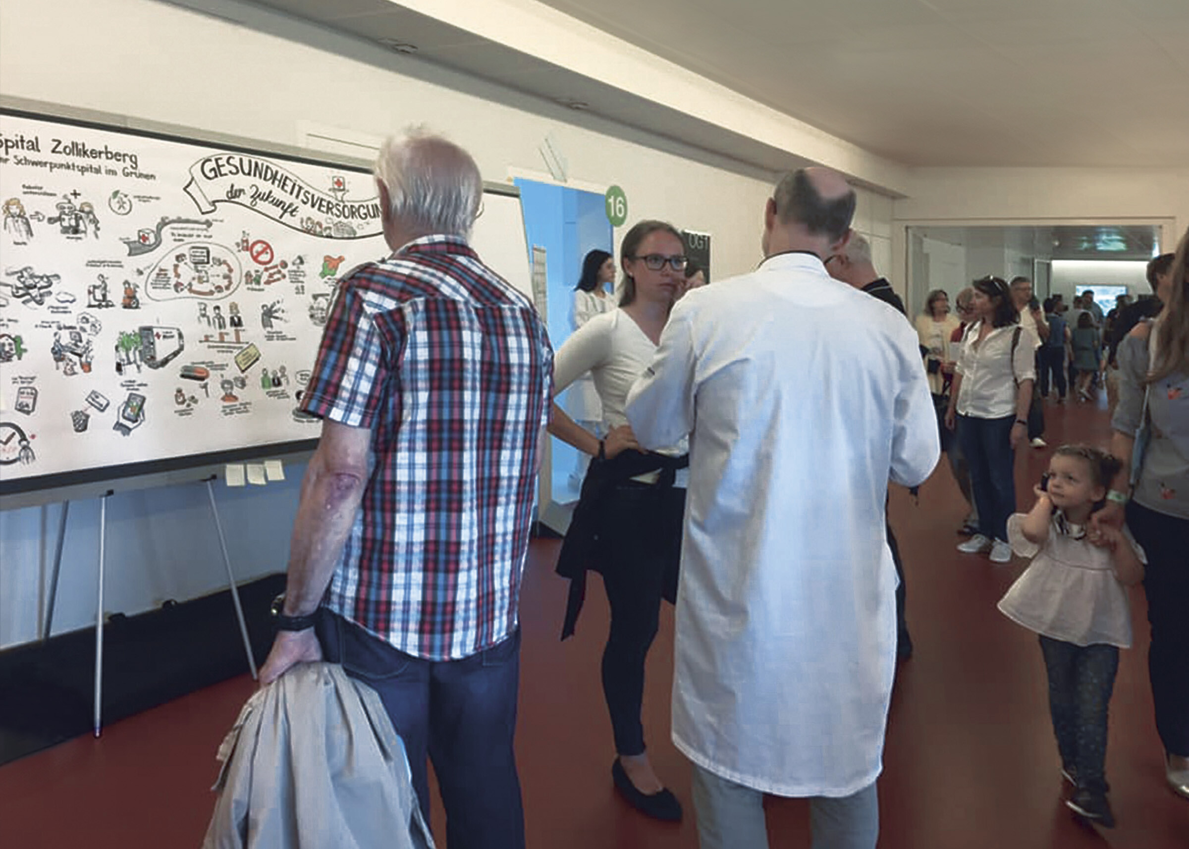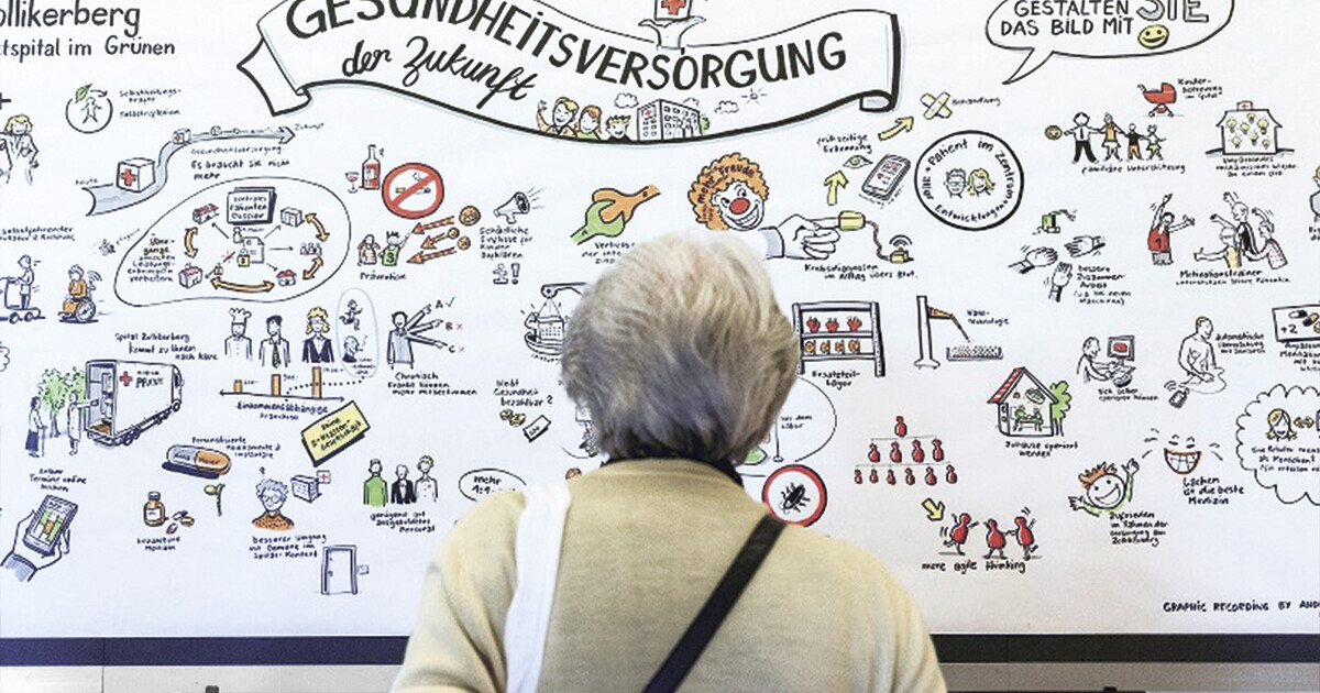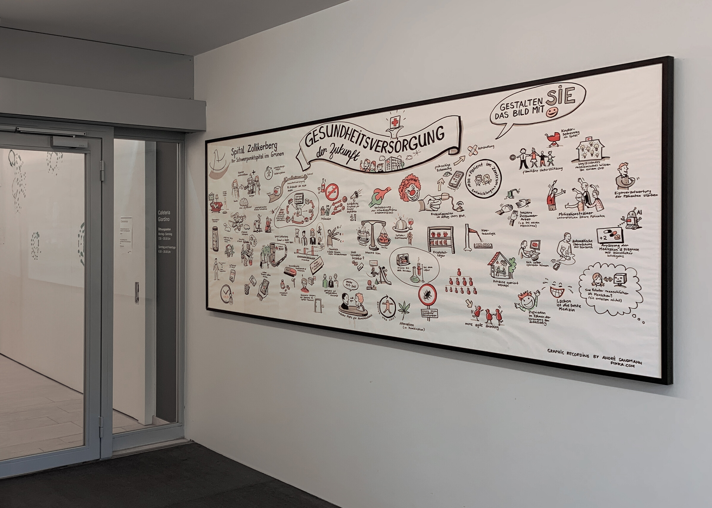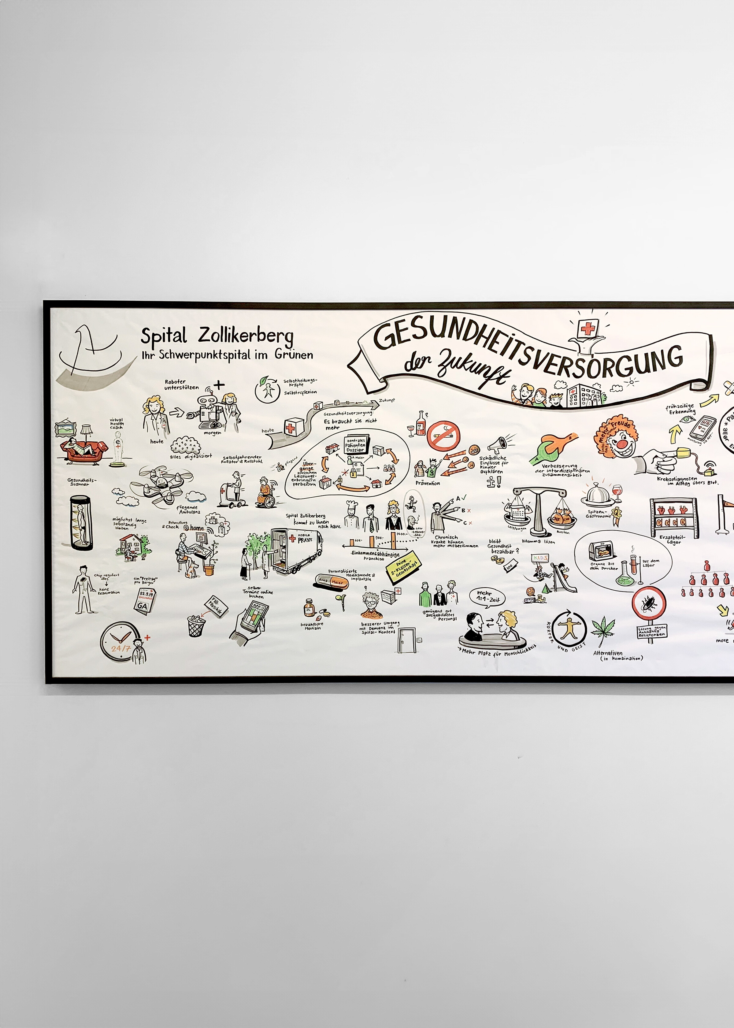 Gemeinsam mit einer Ärztin zeichneten wir im Dialog mit den Besucher:innen dieses Bild und speicherten so die ganz unterschiedliche Ideen und Wünsche auf der langen Papierbahn ab. Das Graphic Recording hängt heute schön gerahmt im Eingangsbereich des Spitals in Zürich.
