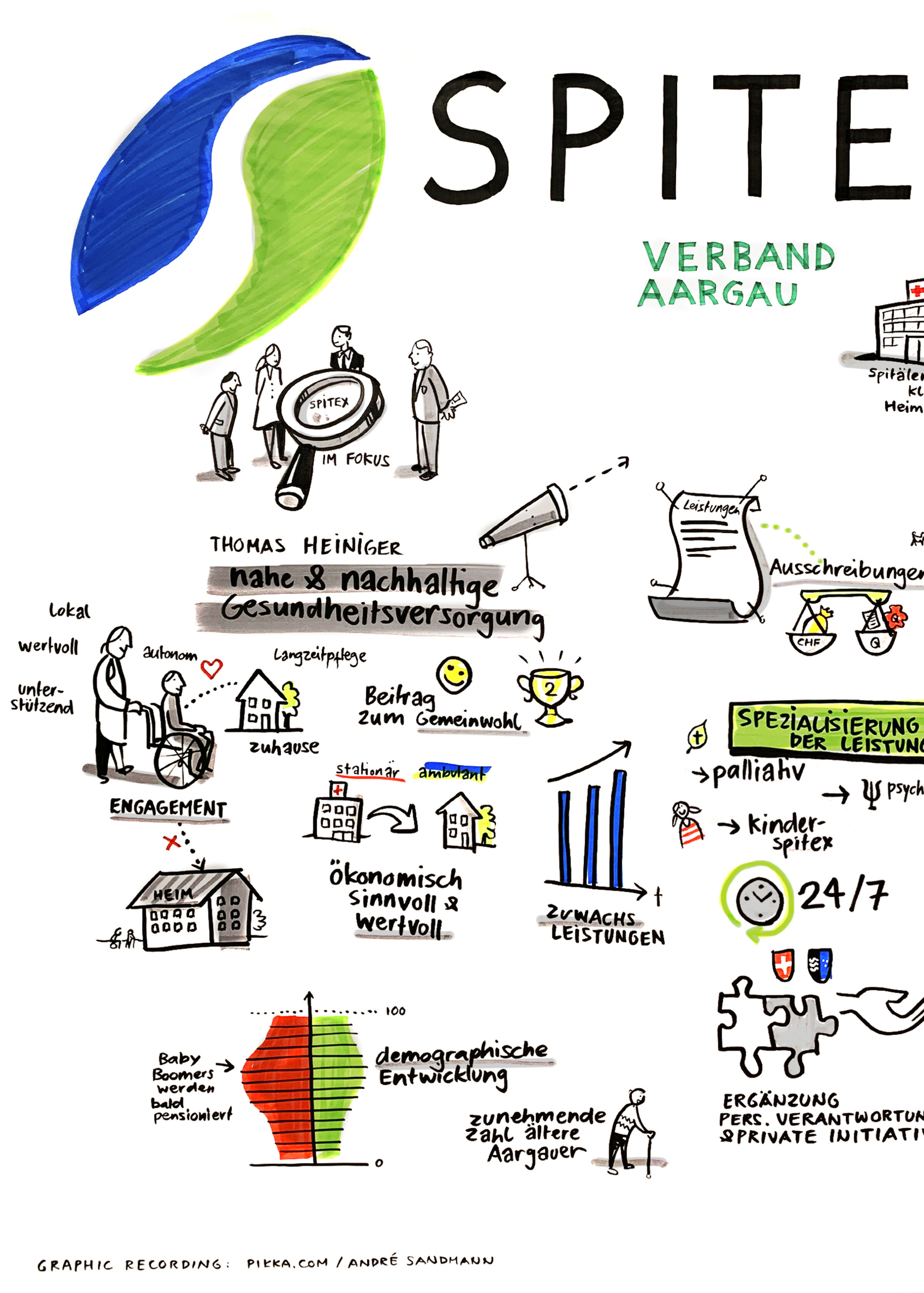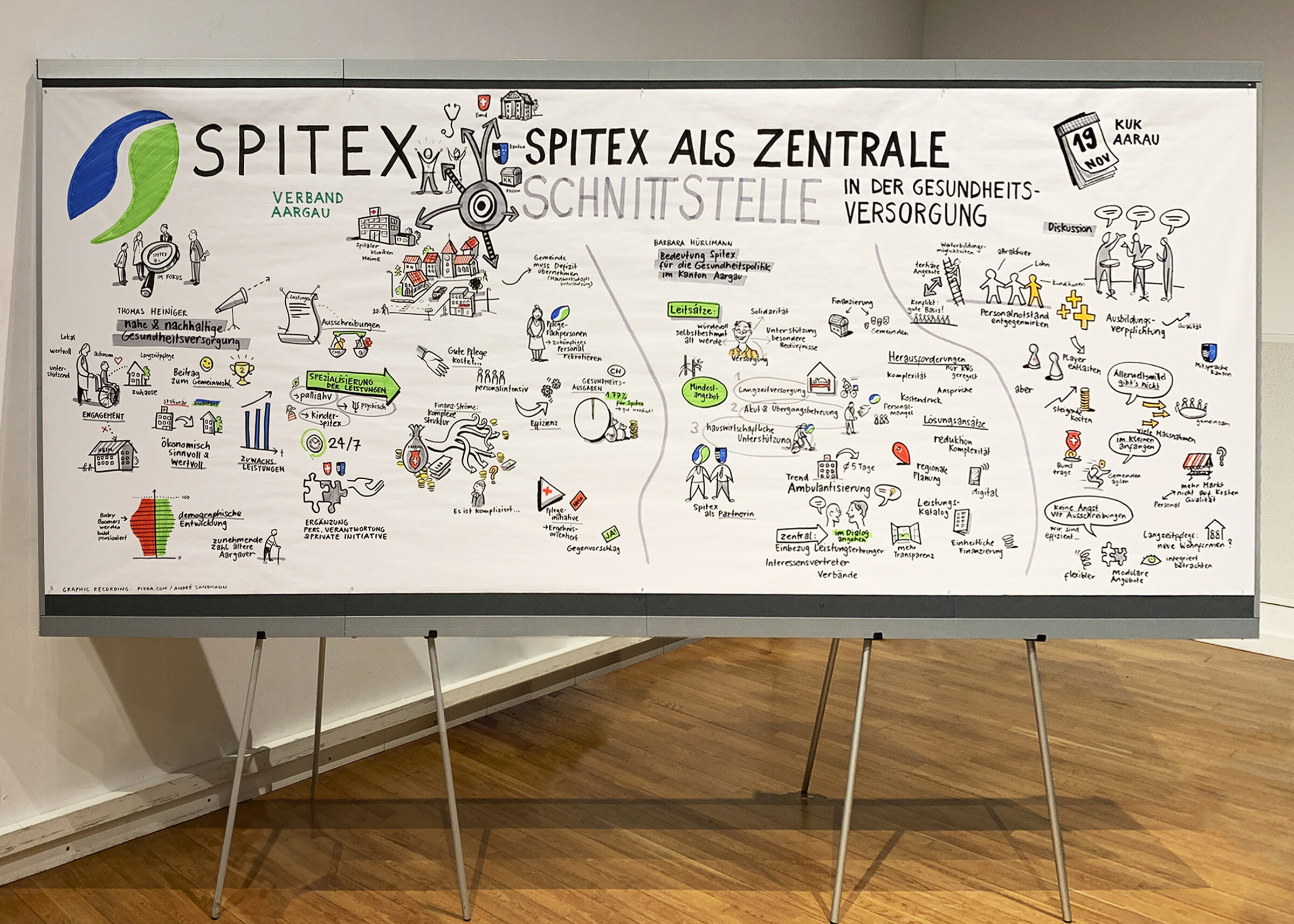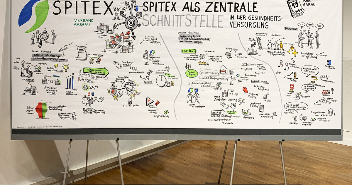 Mehr als 130 Vertreter:innen aus kommunalen Behörden und der Spitex im Kanton Aargau trafen sich im Kultur- und Kongresshaus Aarau. «Wir brauchen Einfachheit, Klarheit und Transparenz», betonte Barbara Hürlimann gegenüber den Politiker:innen. Während der Veranstaltung hielten wir die Aussagen und Inputreferate visuell fest. Das Endergebnis: eine klare und übersichtliche Zusammenfassung.