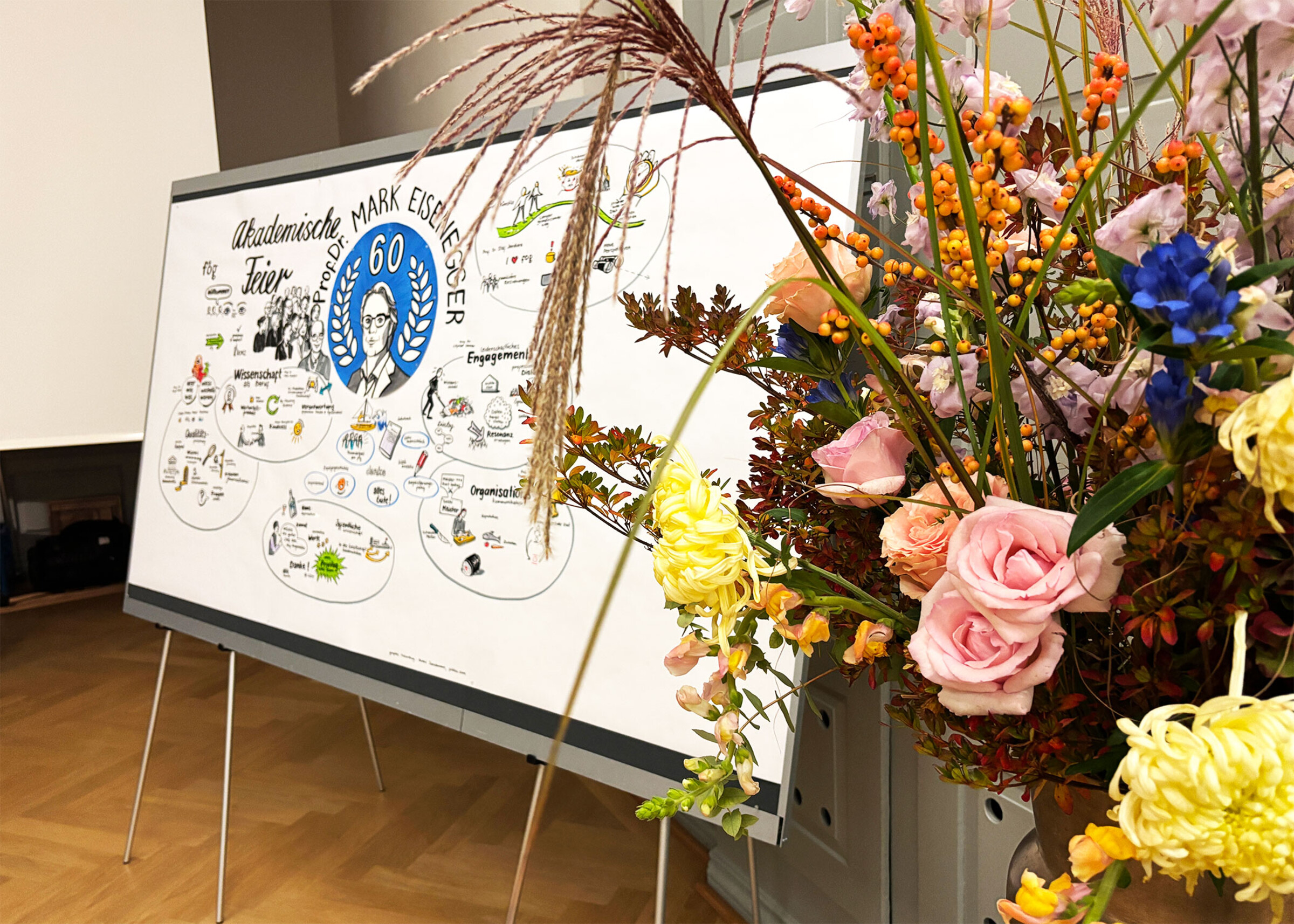 Am 7. November 2025 fand die akademische Feier anlässlich des 60. Geburtstags von Prof. Dr. Mark Eisenegger statt. Dabei wurden seine Verdienste in Kommunikationswissenschaft und Medienforschung durch verschiedene Beiträge gewürdigt. Neben Ansprachen von Prof. Dr. Mike Schäfer, Prof. Dr. Swaran Sandhu, Prof. Dr. Birgit Stark und Prof. Dr. Otfried Jarren kamen verschiedene Weggefährtinnen und Weggefährten zu Wort. Ihre Beiträge und Annekdoten fassten wir vor Publikum in einem grossformatigen, live gezeichneten Bild zusammen, das Mark Eisenegger im Anschluss als Geschenk und bleibende Erinnerung an den gelungenen Abend überreicht wurde.