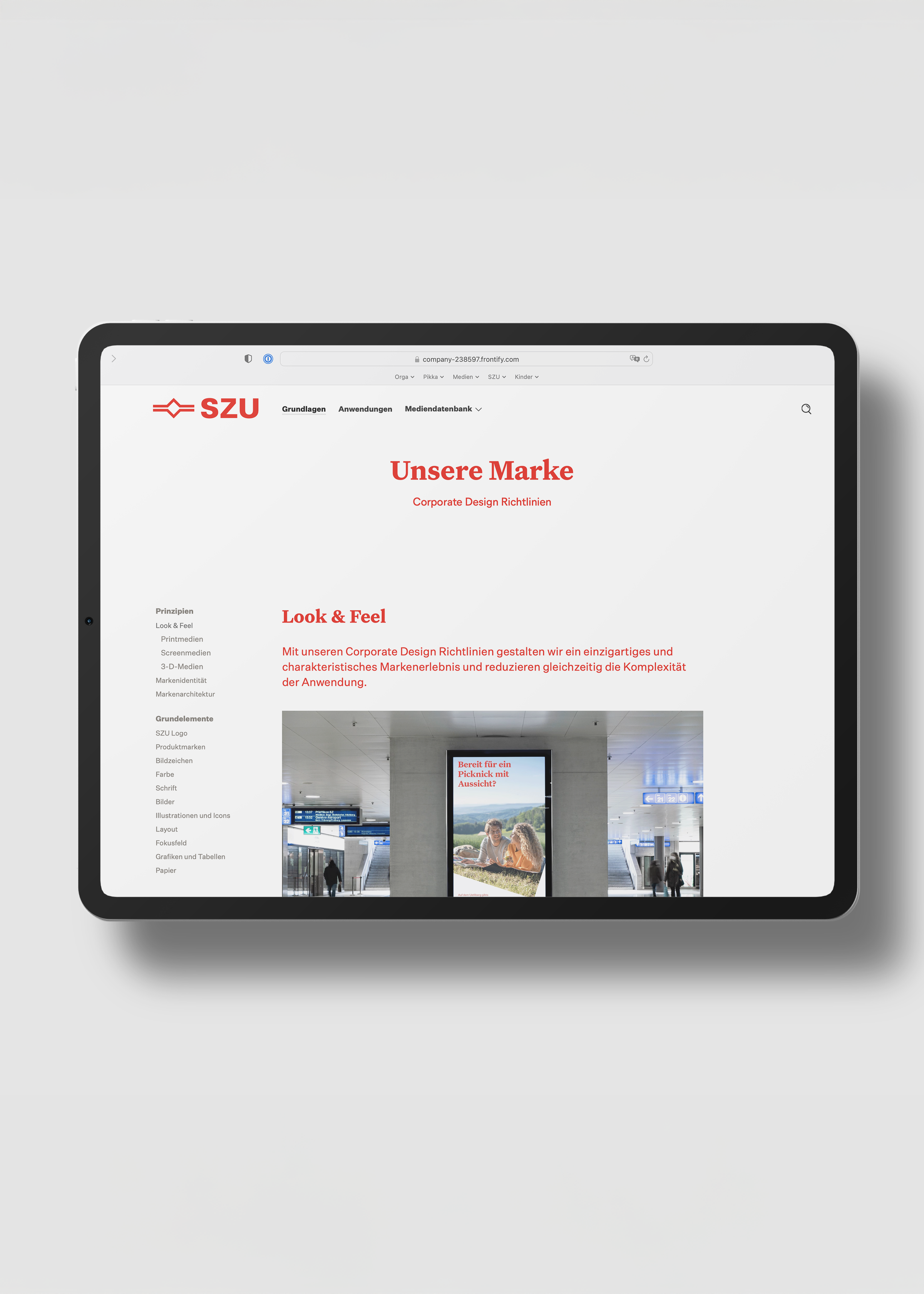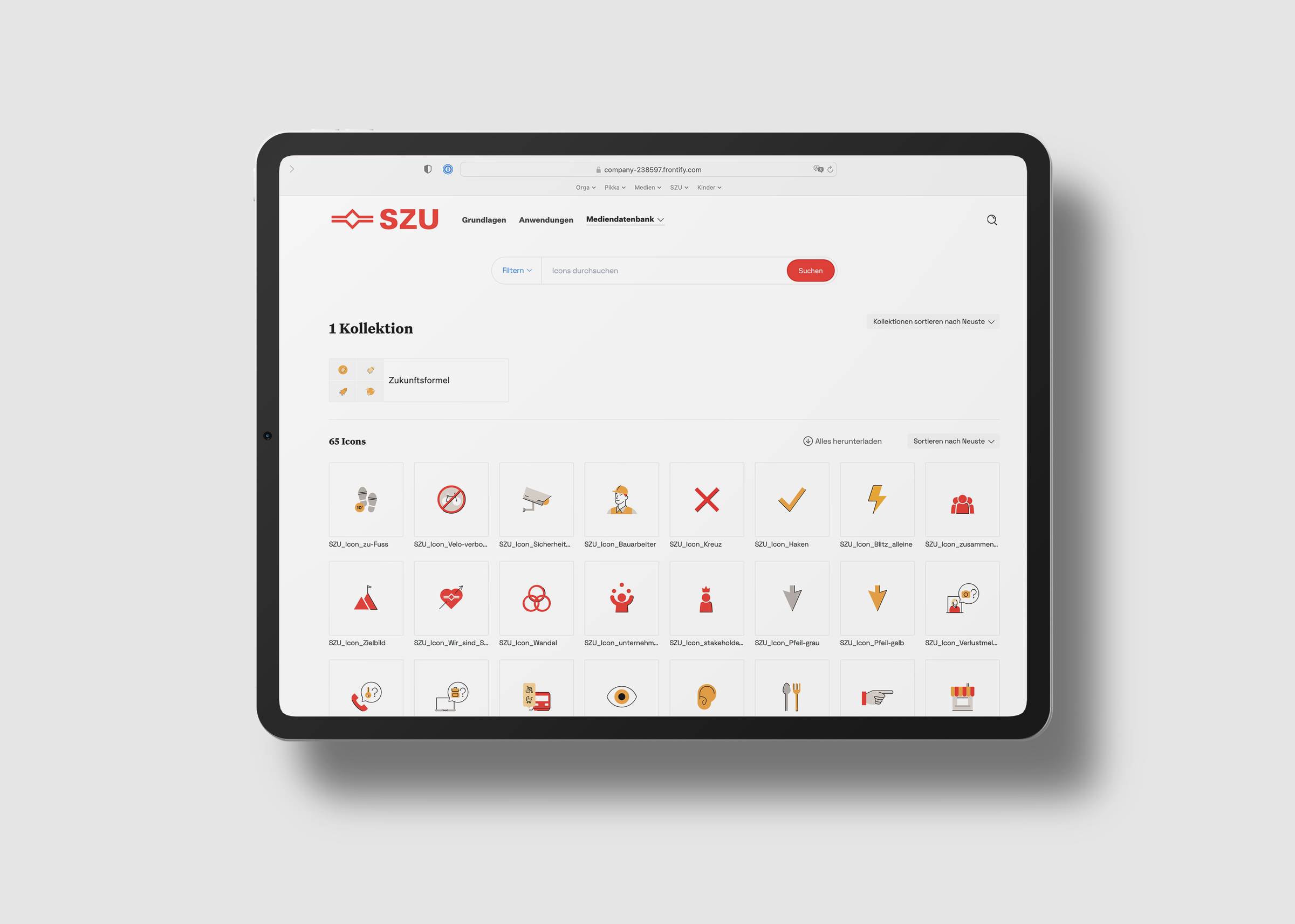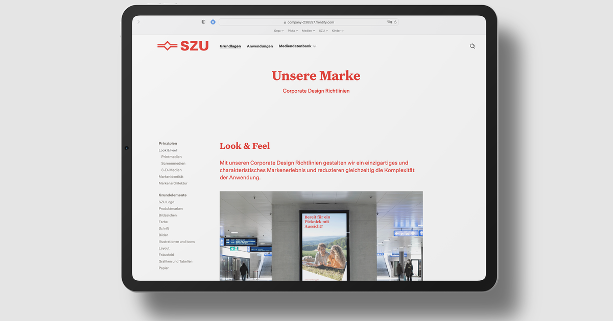 Die Landingpage der Markenplattform lädt mit einem Imagefilm zu einem emotionalen Einstieg in die Markenwelt der SZU ein. Markenidentität, Designelemente und Anwendungen sind ansprechend und leicht verständlich dargestellt. Assets und Templates stehen ebenso zum Download bereit wie die Bilder und Illustrationen auf der Mediendatenbank. So vereinfacht die mit Frontify realisierte Markenplattform das Brand Management und gewährleistet, dass der Designauftritt der SZU über alle Touchpoints hinweg konsistent angewendet wird.