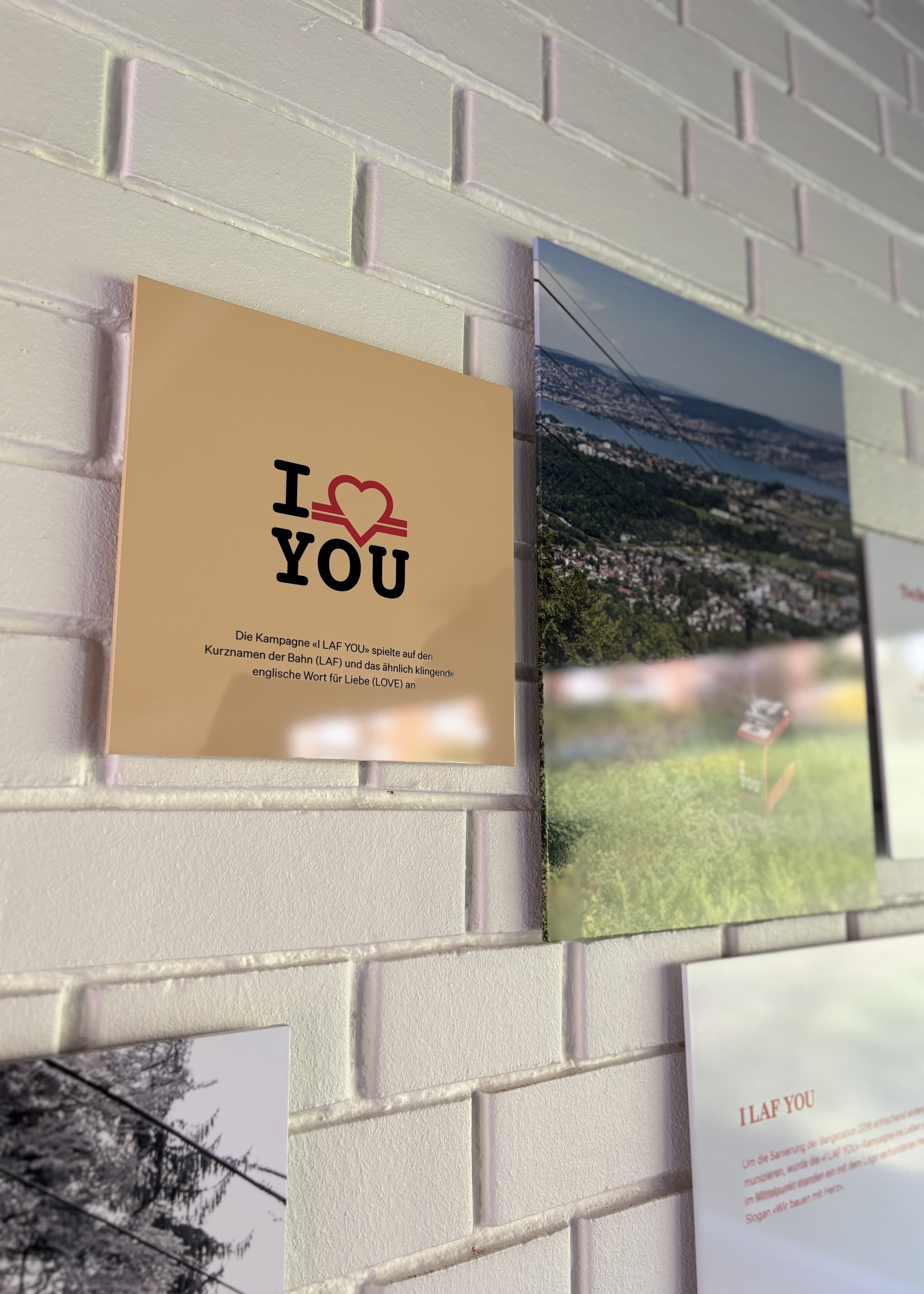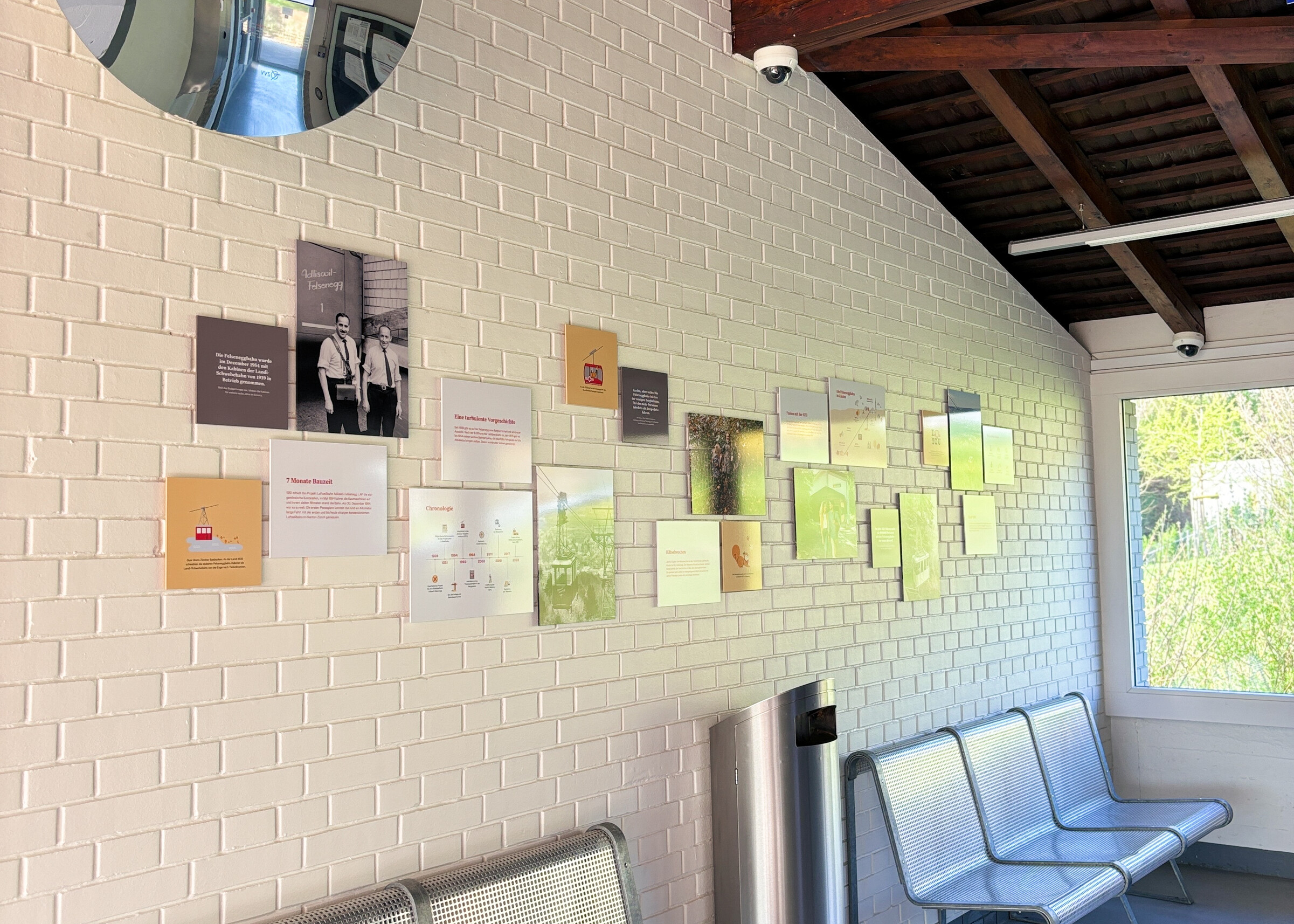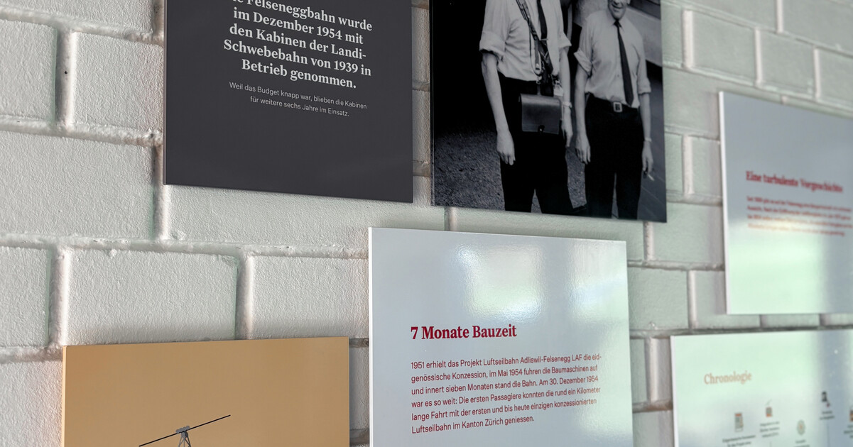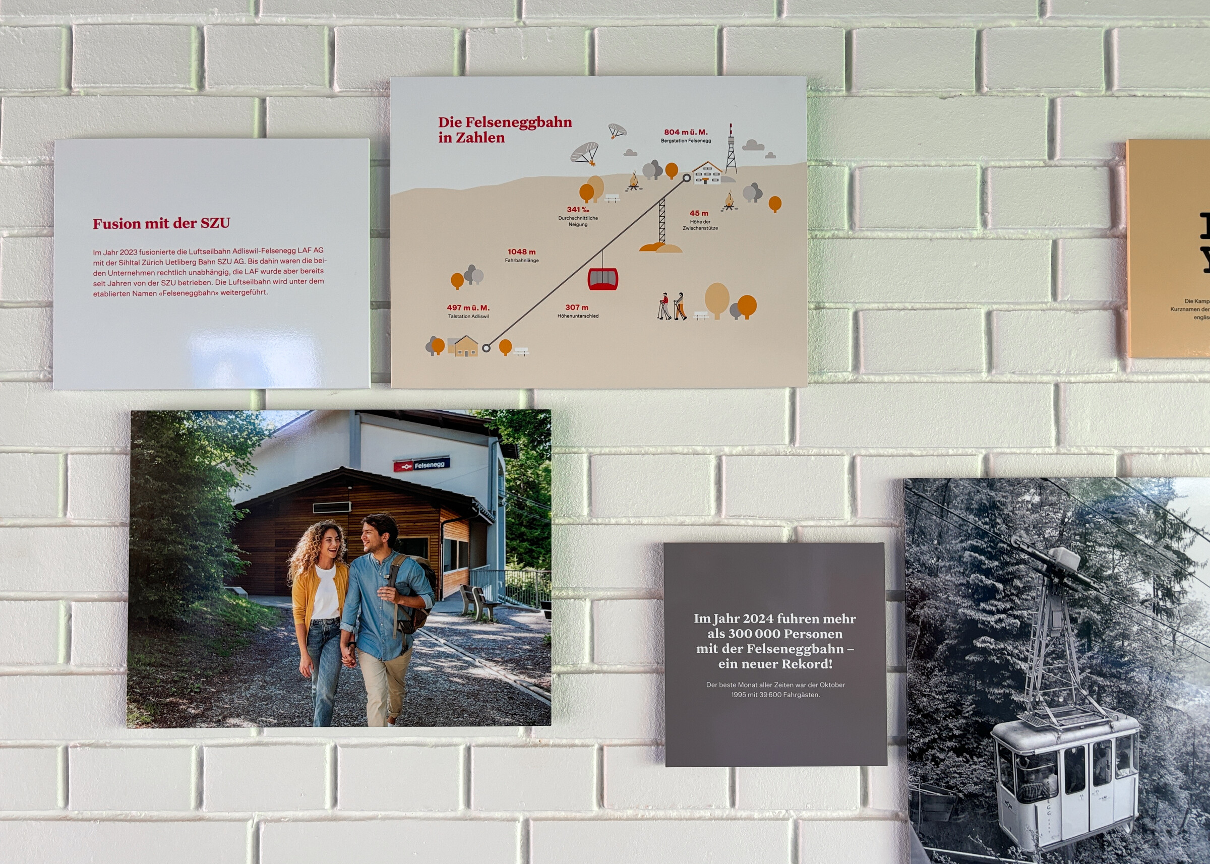 Die Petersburger Hängung ist eine Technik, bei der viele Bilder dicht nebeneinander an der Wand aufgehängt werden. Die einzelnen Tafeln zeigen bedeutende Ereignisse, Fun Facts, Infografiken, Geschichtliches und werden ergänzt um atmosphärische Fotos und Illustrationen. So können Kunden der Felseneggbahn in die Geschichte der SZU von der Gründung bis heute eintauchen.