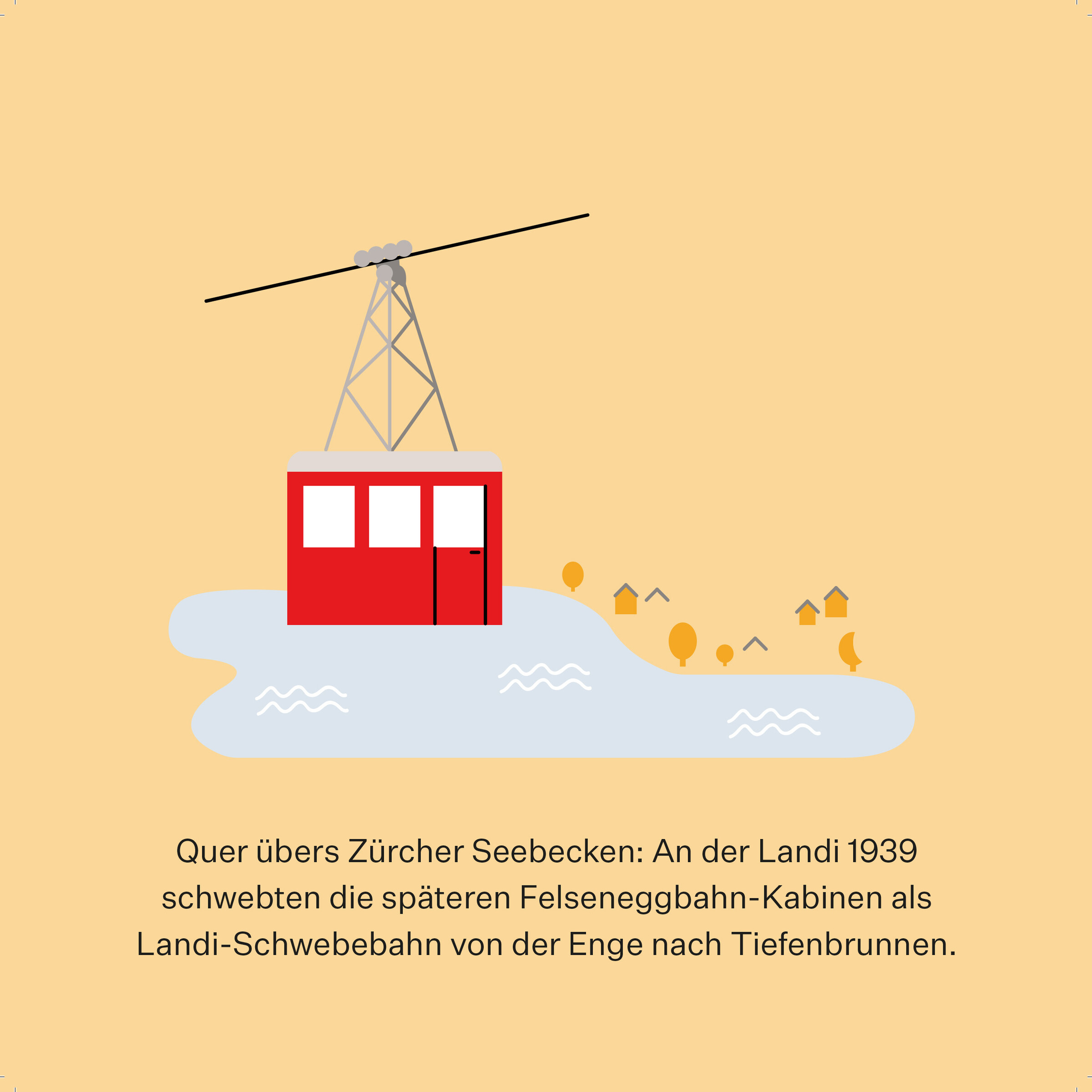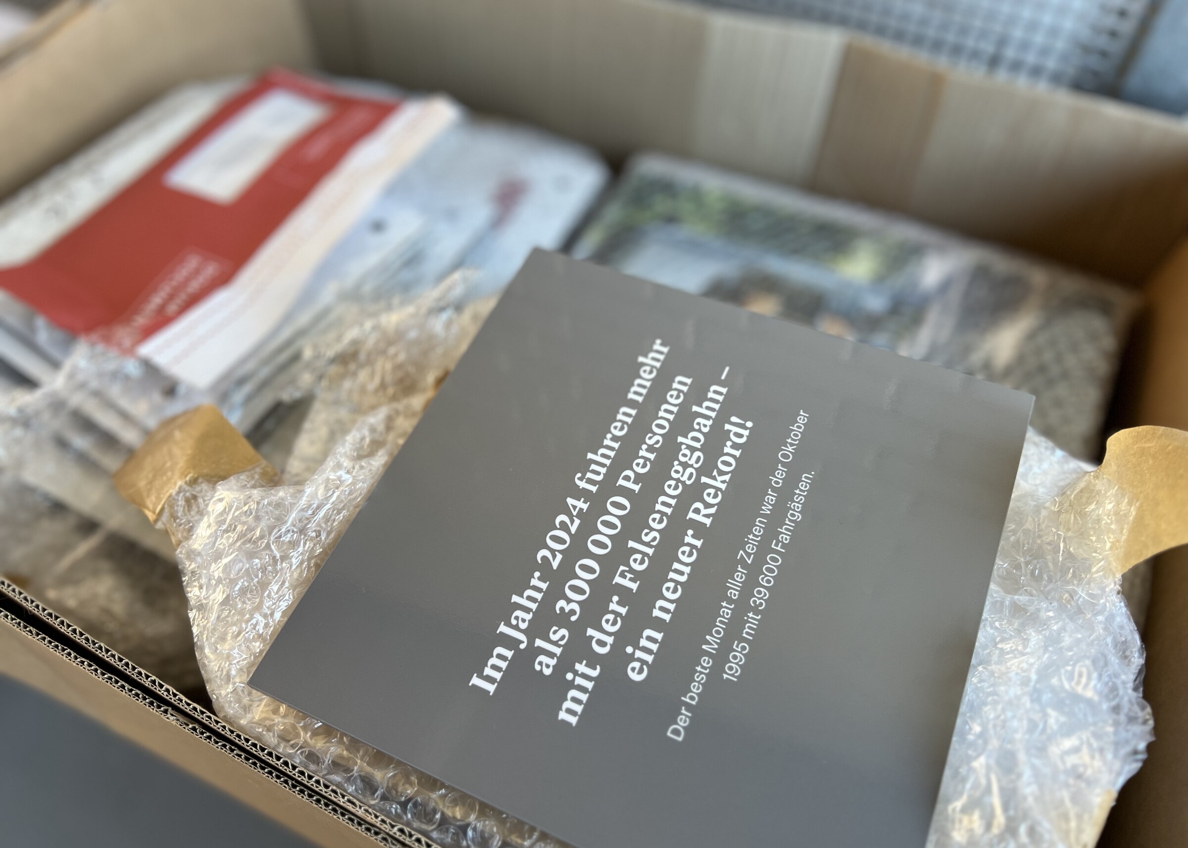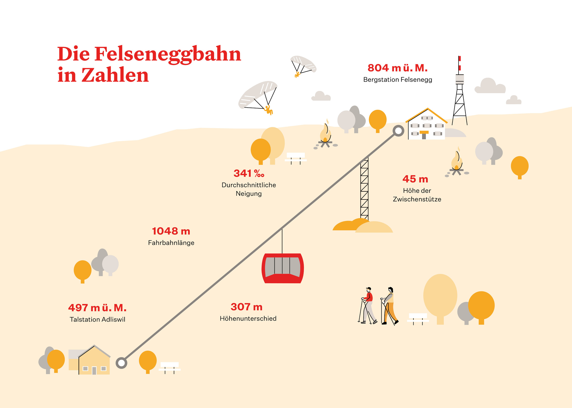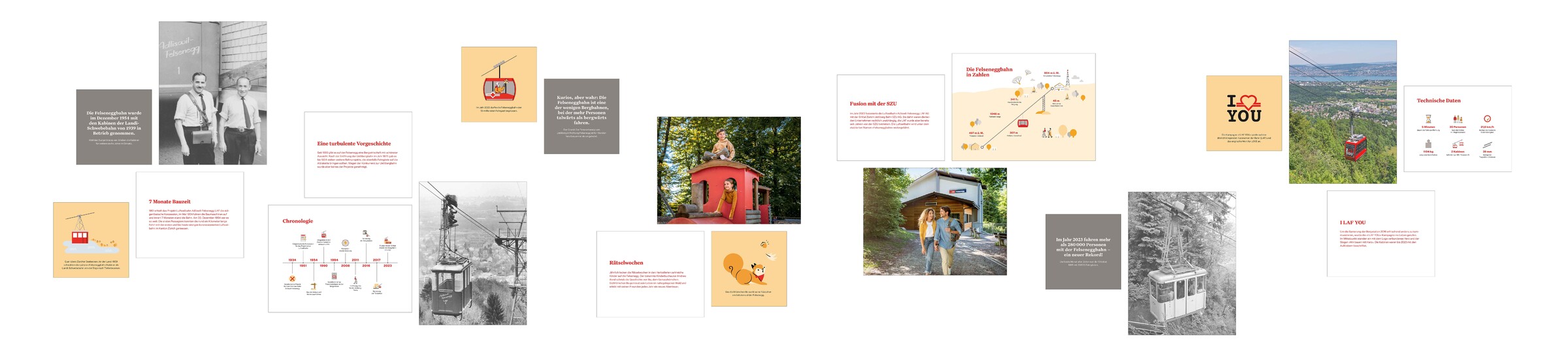 Die Petersburger Hängung ist eine Technik, bei der viele Bilder dicht nebeneinander an der Wand aufgehängt werden. Die einzelnen Tafeln zeigen bedeutende Ereignisse, Fun Facts, Infografiken, Geschichtliches und werden ergänzt um atmosphärische Fotos und Illustrationen. So können Kunden der Felseneggbahn in die Geschichte der SZU von der Gründung bis heute eintauchen.