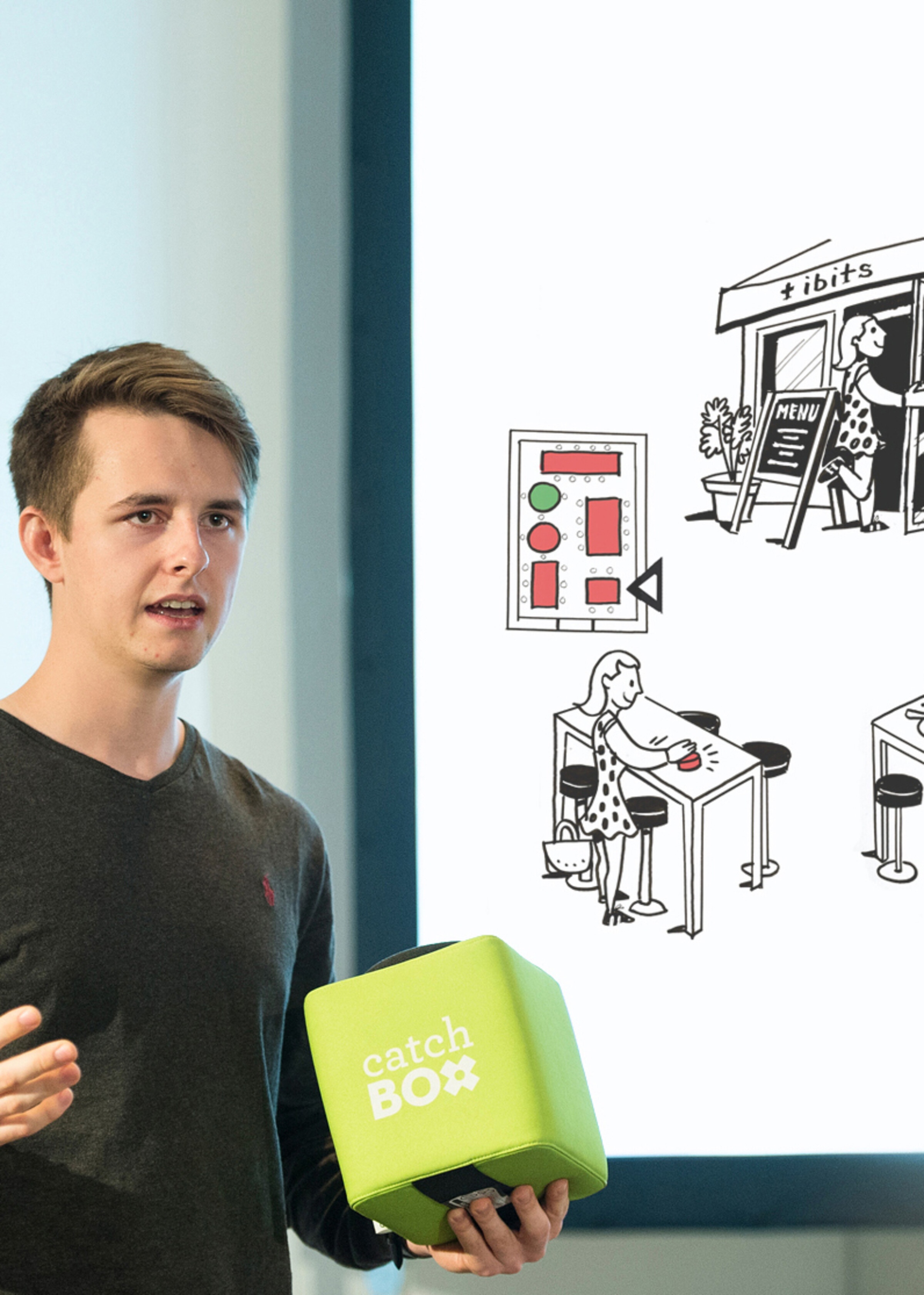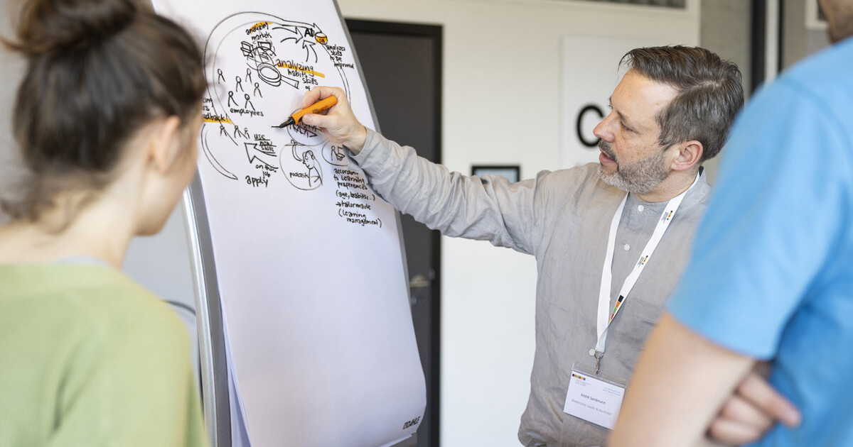 Zum Abschluss stellt uns jedes Team seinen Lösungsansatz vor. Wir entwickeln am Flipchart eine passende Skizze und überprüfen gleich, ob unsere Darstellung ihrer Vorstellung entspricht.