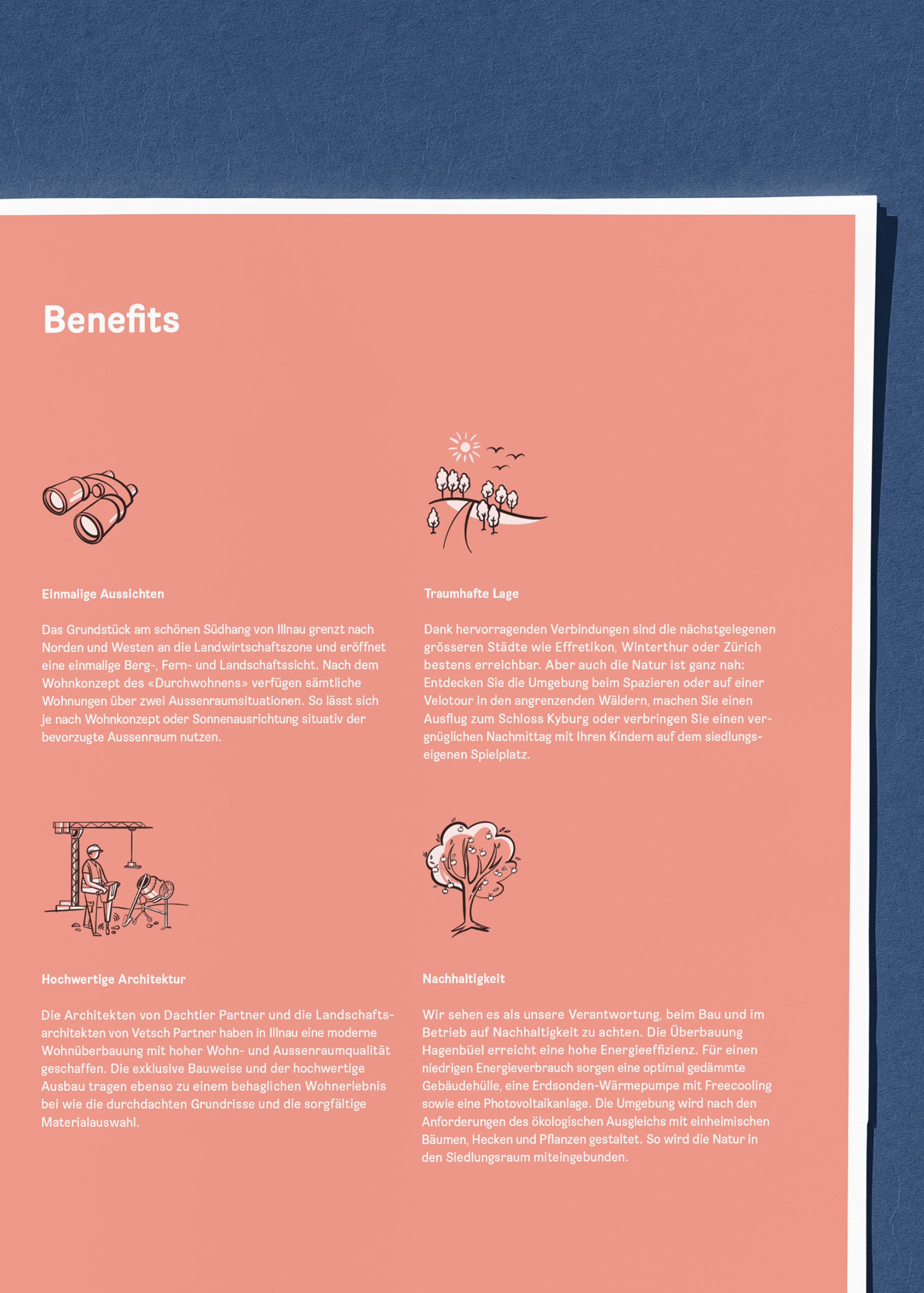 Ein durchgängiges Erscheinungsbild von der Webseite über Inserate und Baubeschrieb-Broschüren bis hin zum Einzugsgeschenk unterstützt die Einzigartigkeit des Projektes in Illnau. Als zentrale Informationsplattform für potenzielle Interessent:innen präsentiert die Website relevante Eckdaten mit ansprechenden Grafiken und einer virtuellen Entdeckungstour. Illustrationen verleihen dem Gesamtbild einen persönlichen, lebendigen Charakter und fassen gleichzeitig die Vorteile der Lage prägnant zusammen.