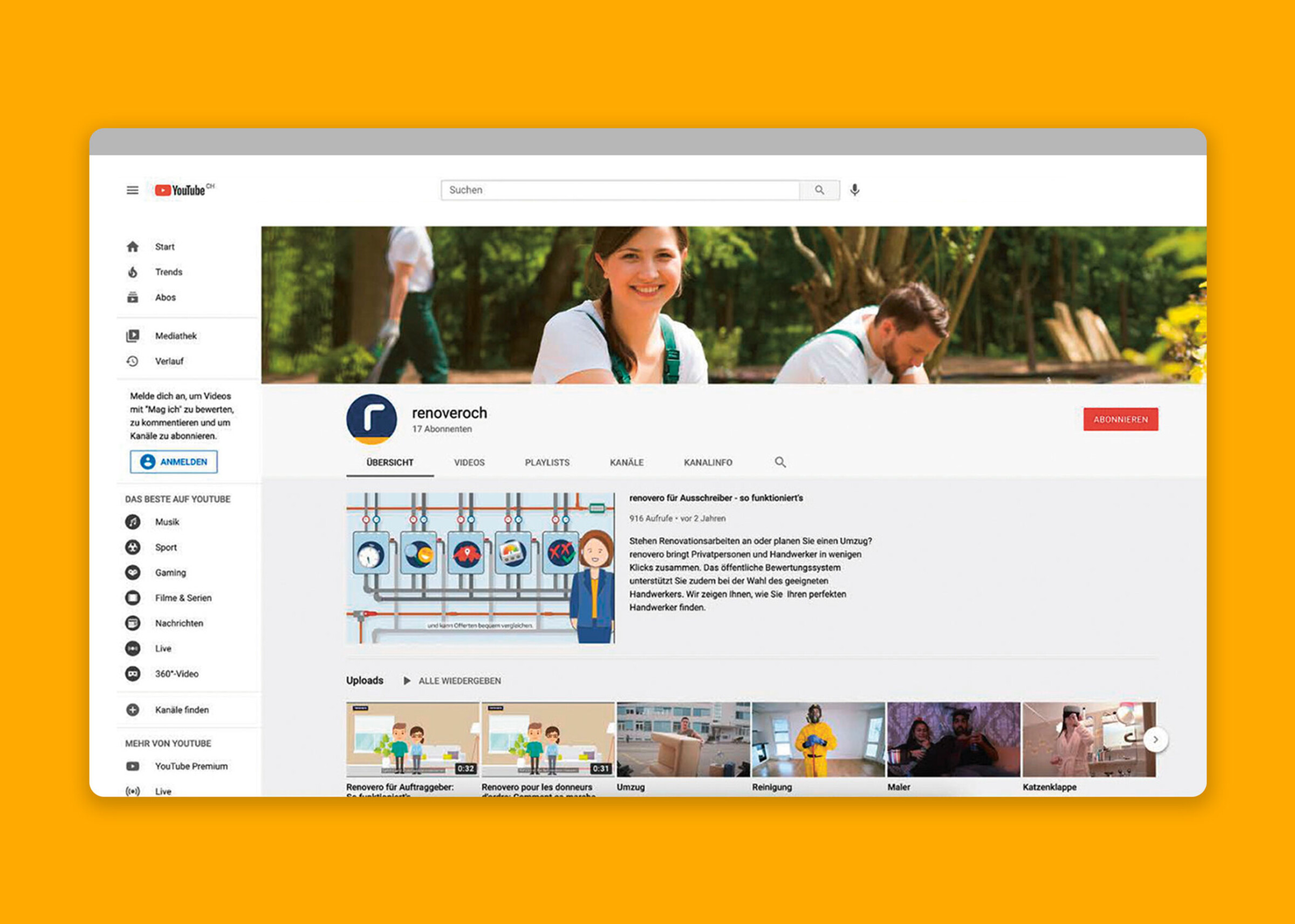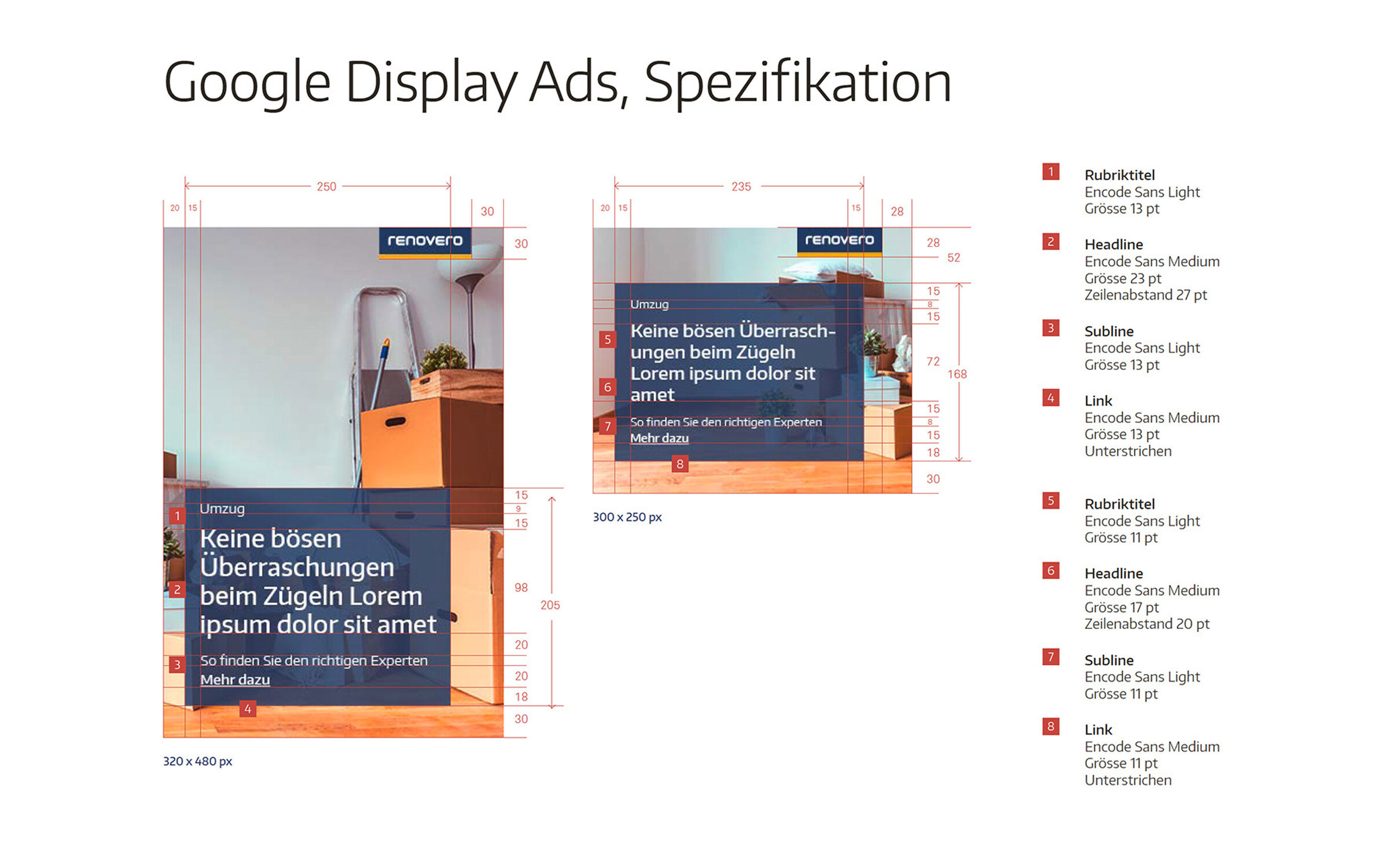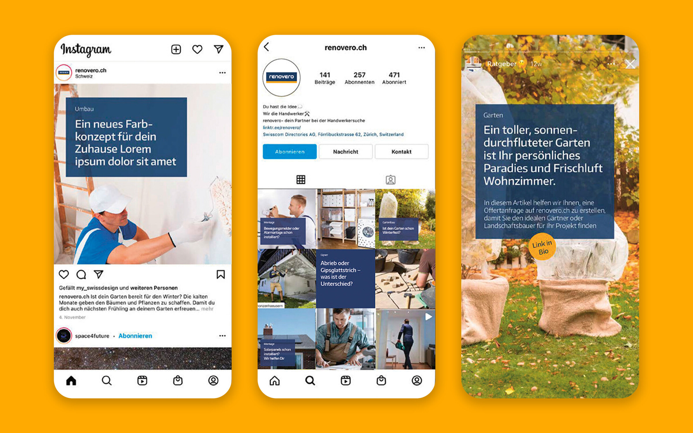 Für die Adaption des Markenauftritts von renovero auf verschiedene digitale Kanäle erstellten wir Spezifikationen für digitale Ads und Newsletter sowie Templates für Social-Media-Kanäle wie Facebook, Instagram und YouTube. Egal ob es um die Gewinnung von Neukunden mit Google-Ads oder die Präsentation aktueller Angebote und Projekte in regelmässigen Social-Media-Posts geht – Ziel ist eine durchgängig professionelle und moderne Online-Präsentation, die renovero auf allen Plattformen konsistent stärkt.