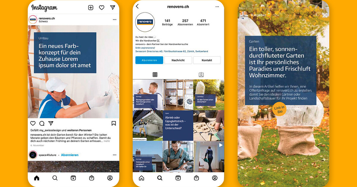 Von digitalen Ads über Newsletter bis hin zu Social-Media-Kanälen: renovero punktet mit einem konsistenten und ansprechenden Online-Auftritt.