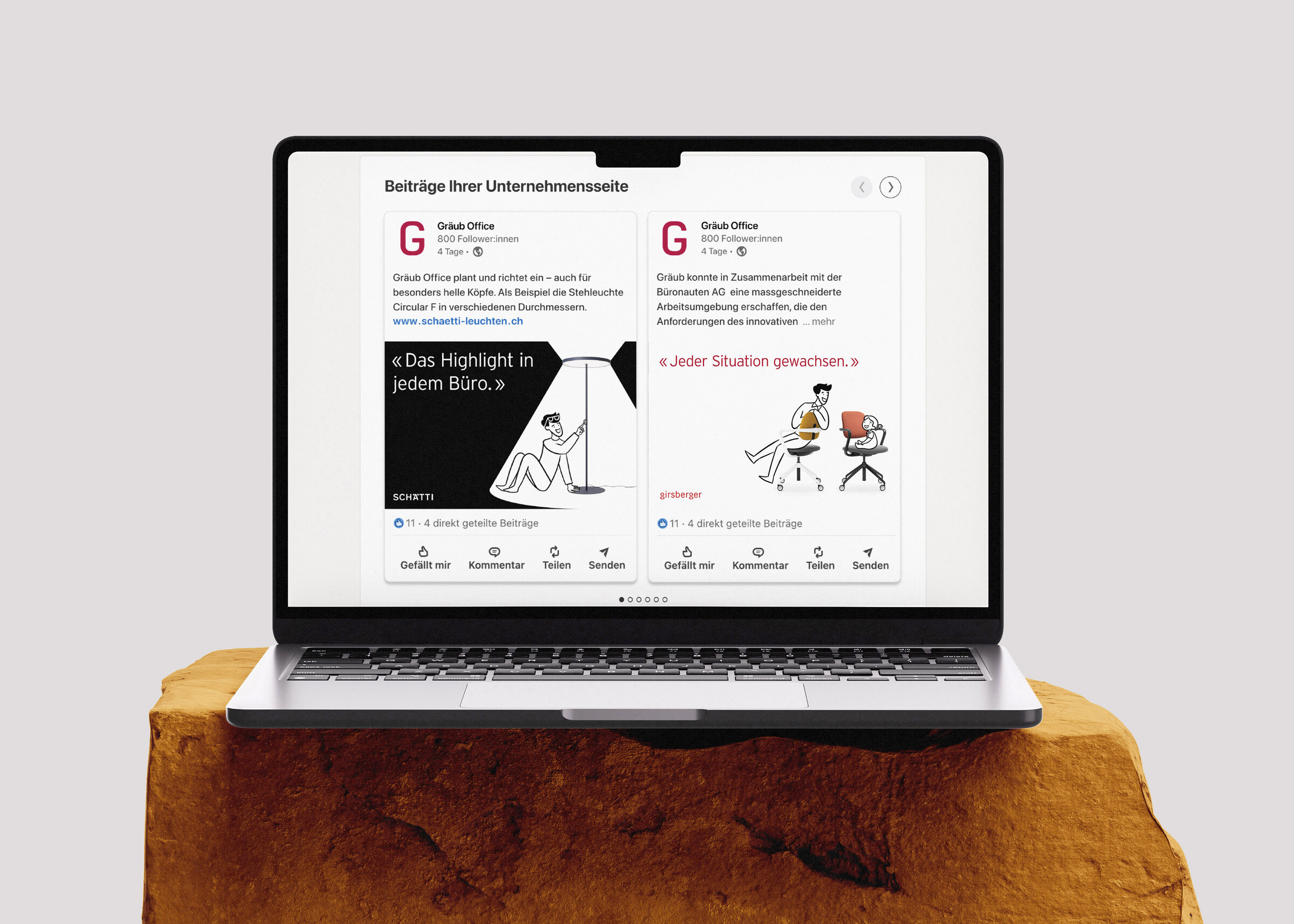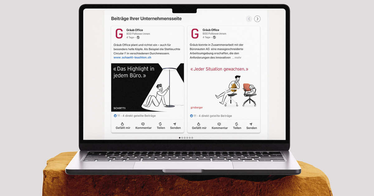 Ob auf Anzeigen in der Fachzeitschrift Hochparterre, auf animierten Webbannern oder in Social-Media-Posts: «Gräubli» taucht in verschiedensten Kommunikationsmitteln und Medien auf. Der sympathische Markenbotschafter macht aus den generischen Produktbildern der Hersteller eine für Gräub Office typische Bildwelt – und das ohne hohe Kosten für eigene Fotoshootings.