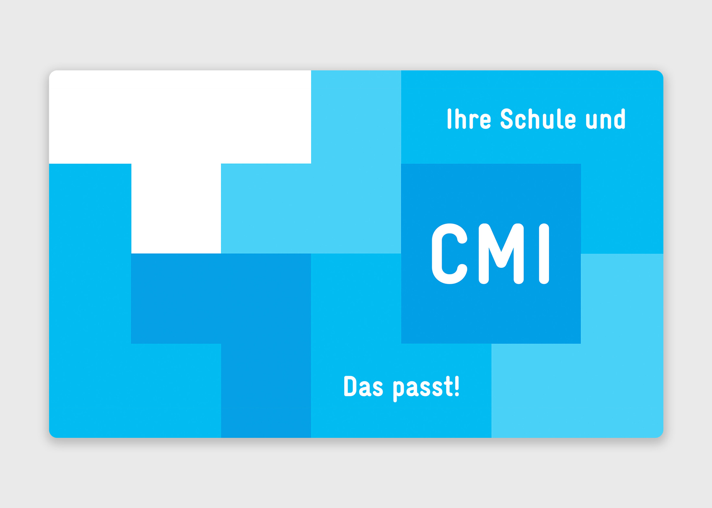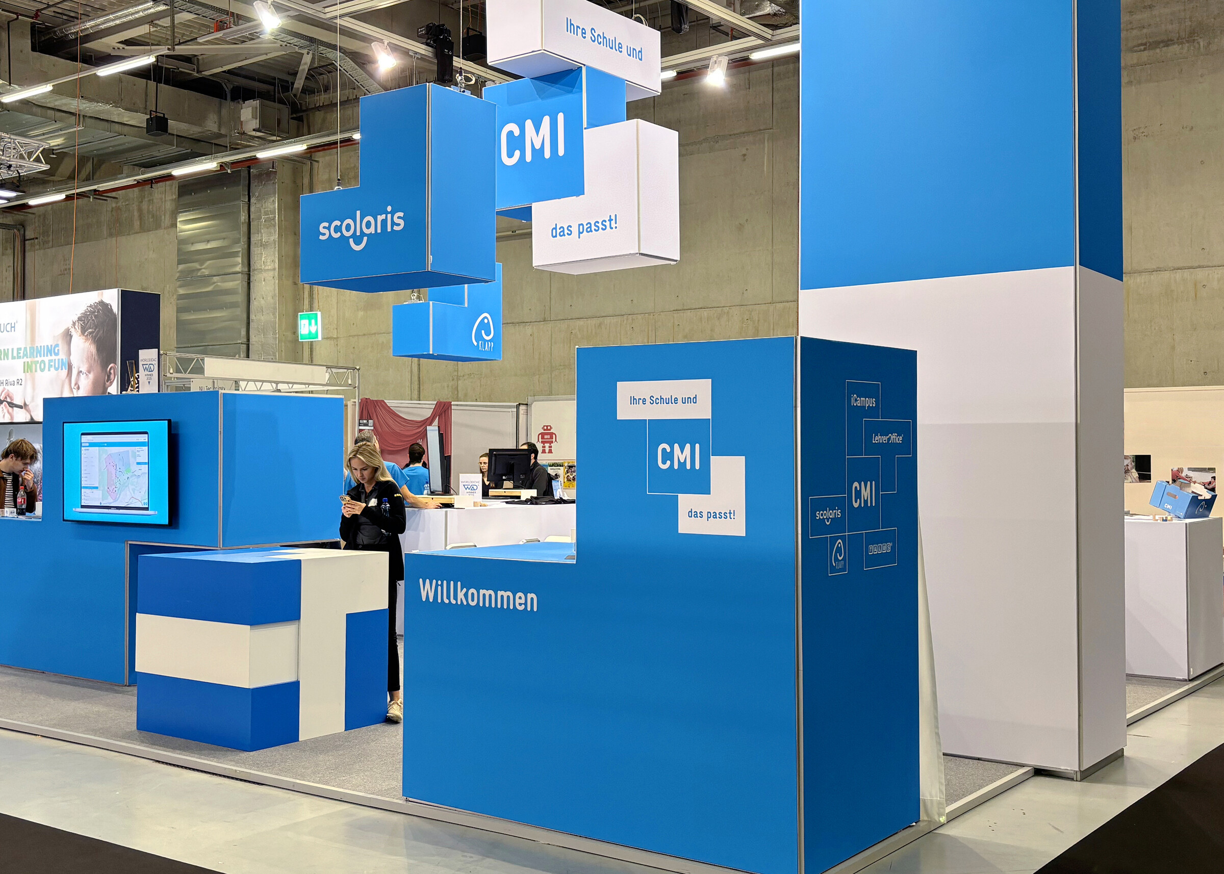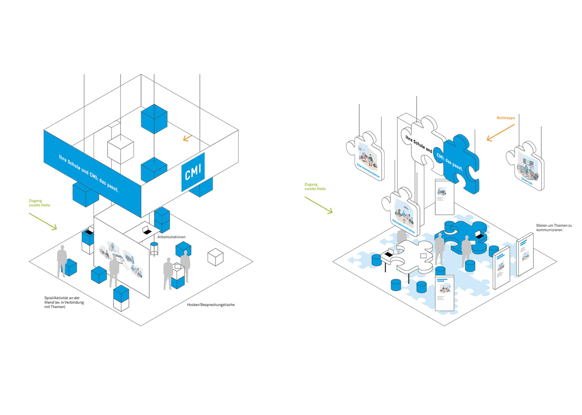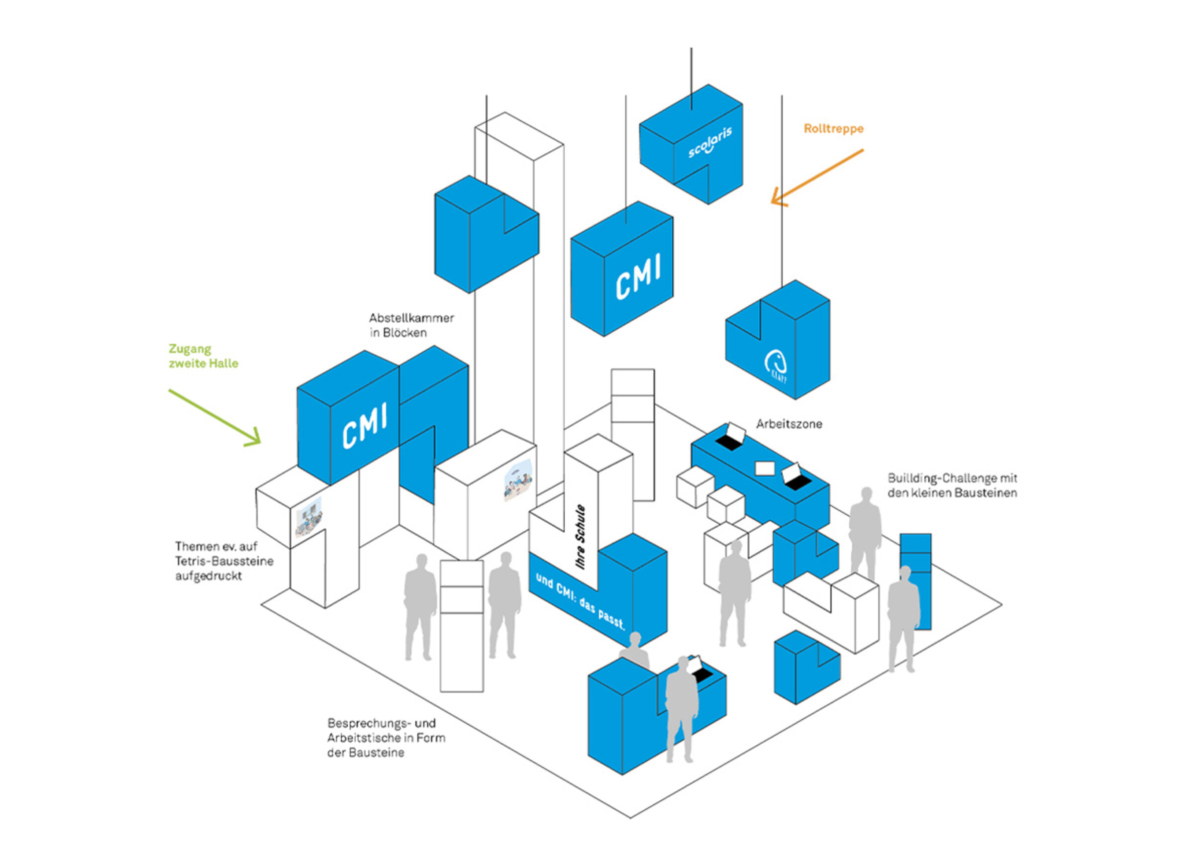 Inspiriert vom Retro-Videospielklassiker Tetris passen die Blöcke wie Puzzleteile ineinander. Der Blickfang im oberen Bereich des Messestandes, die Möblierung am Stand selbst und ein XXL-Puzzle, das vor Ort gespielt werden konnte, sind von dieser Idee abgeleitet. So setzten wir den Claim «Ihre Schule und CMI: das passt!» überzeugend bildlich um.
