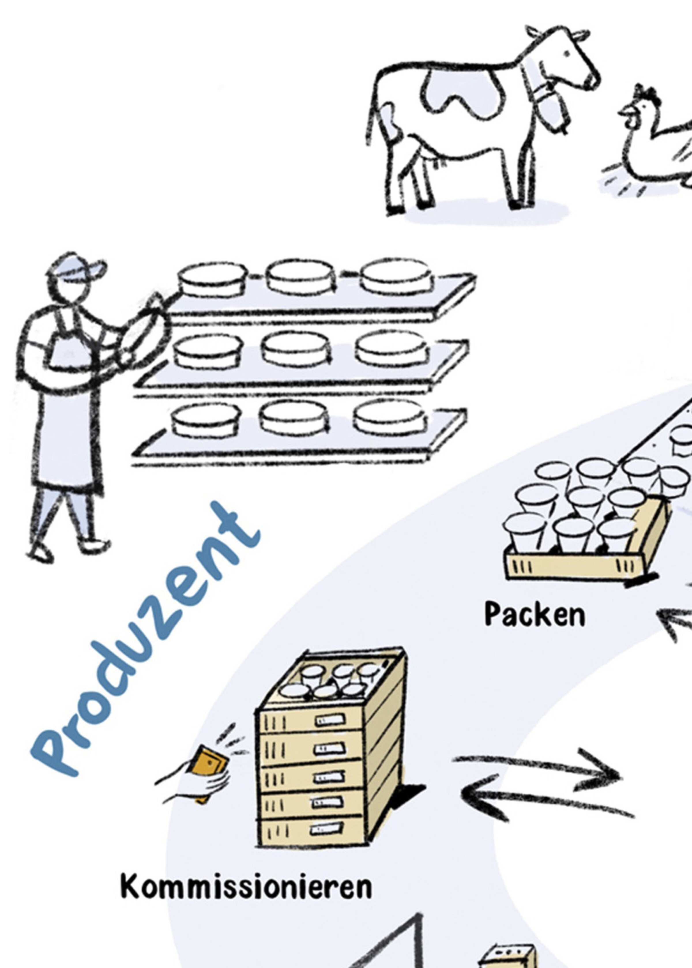 Illustrationen begleiten in der Migros Logistik den Weg von den Produzenten bis auf den Teller der Konsument:innen.
