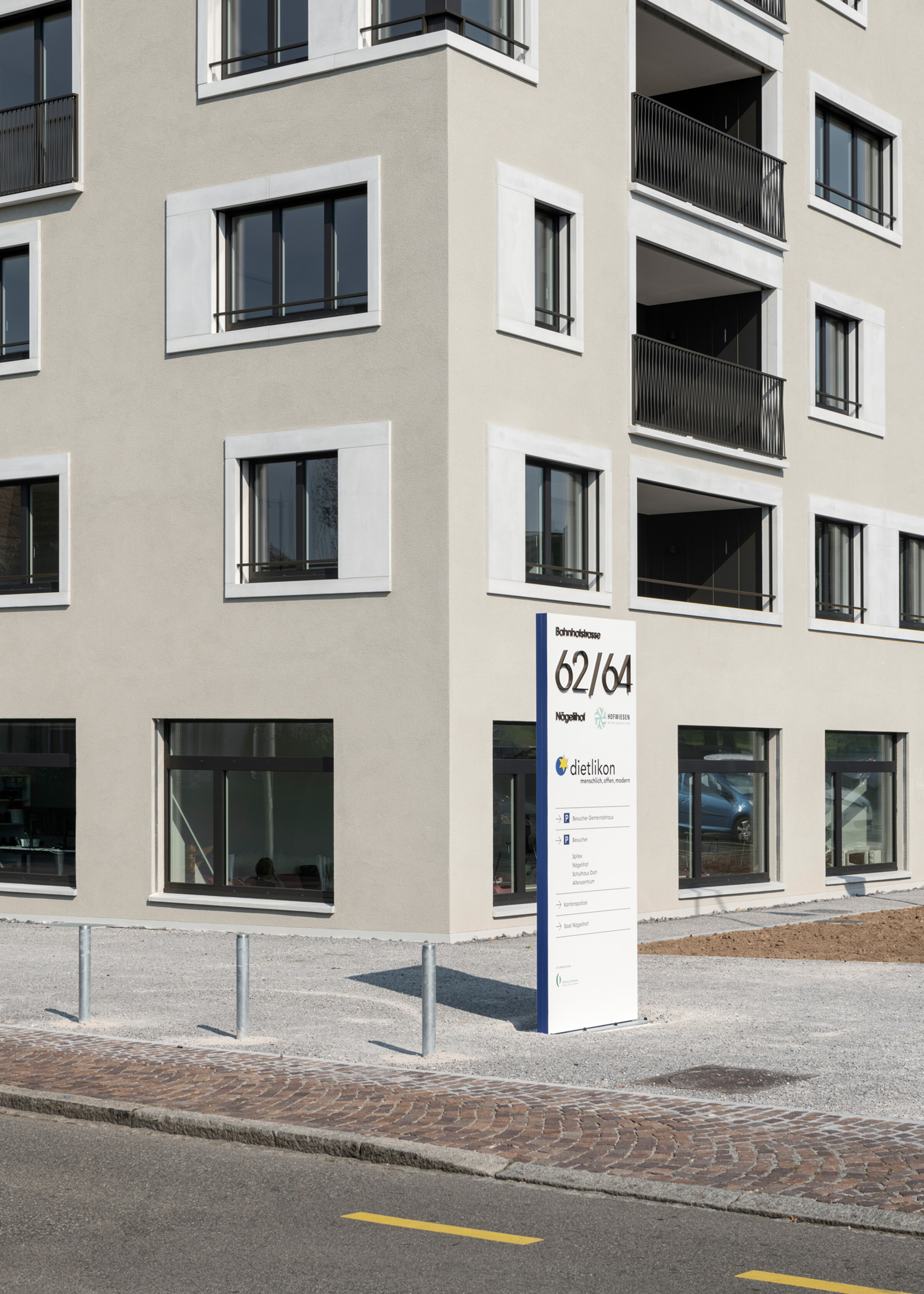 Der Neubau Nägelihof des Alterszentrums Hofwiesen überzeugt mit einer reduzierten und auf das architektonische Gesamtkonzept abgestimmten Signaletik-Lösung.