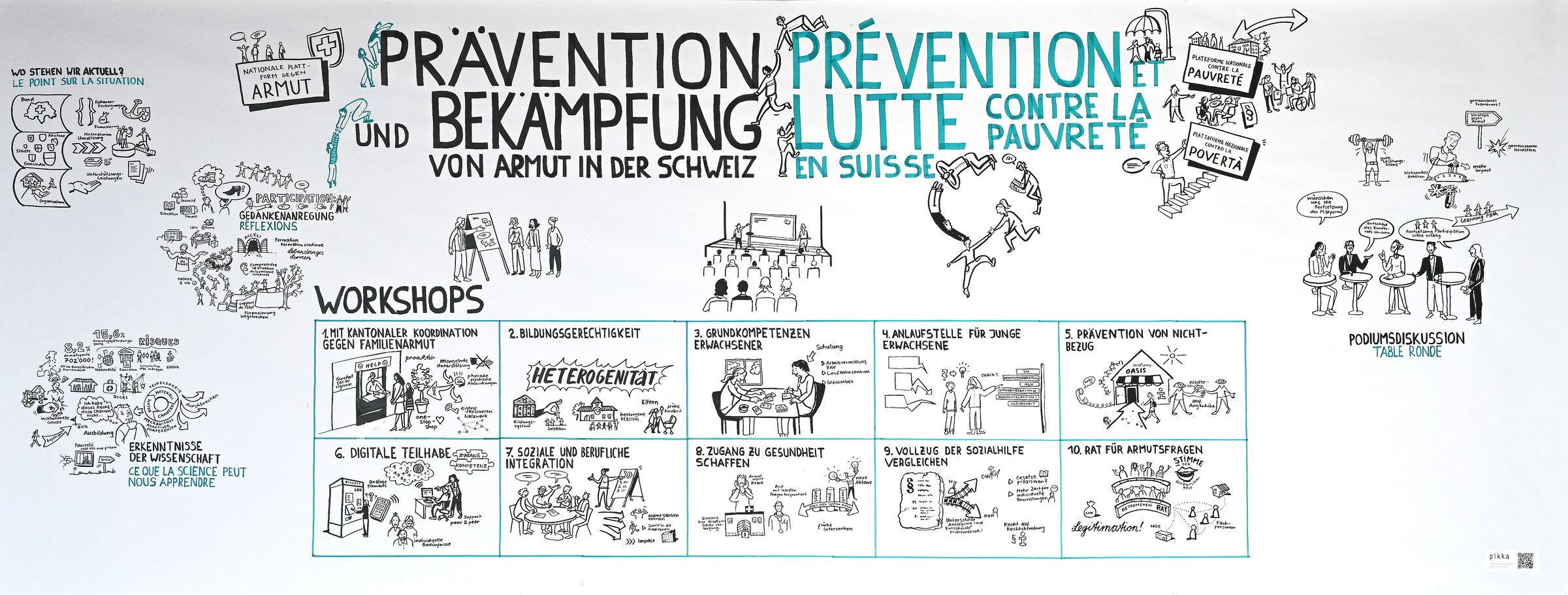Das Graphic Recording dokumentiert die lebhaften Diskussionen an der Konferenz der Nationalen Plattform gegen Armut. Siehe Bericht in der Tagesschau.