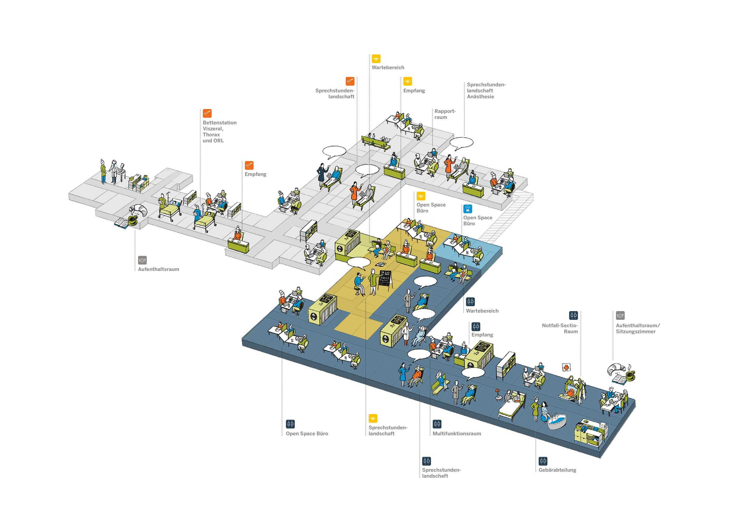 Für all diese Neuerungen gestalteten wir als Orientierungshilfe für die Mitarbeitenden eine Infografik, die sie durch die einzelnen Stockwerke führt. Ob Anästhesie, Open-Space-Büro oder Mensa – dank der interaktiven Stockwerkübersicht findet jede:r den richtigen Weg.