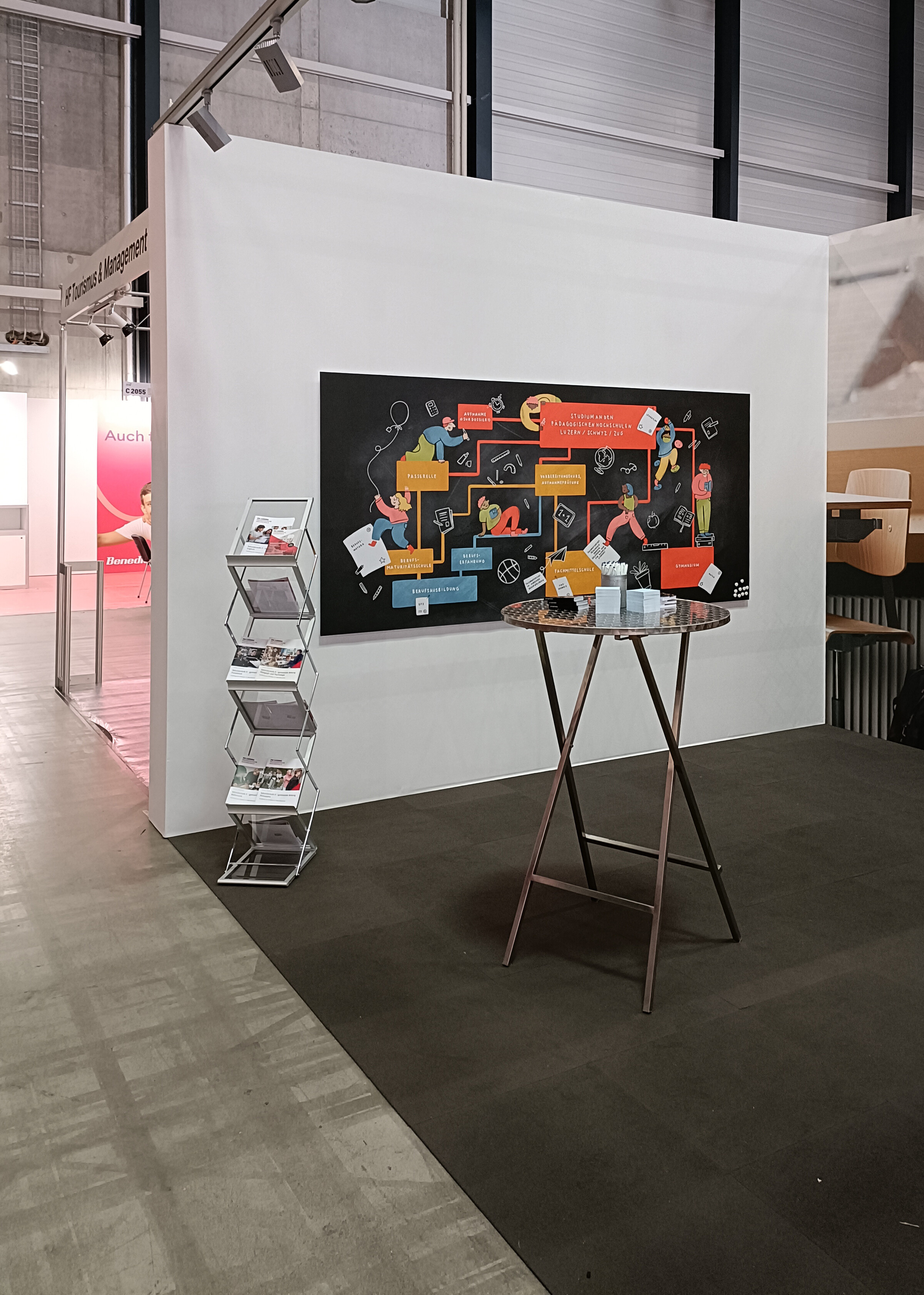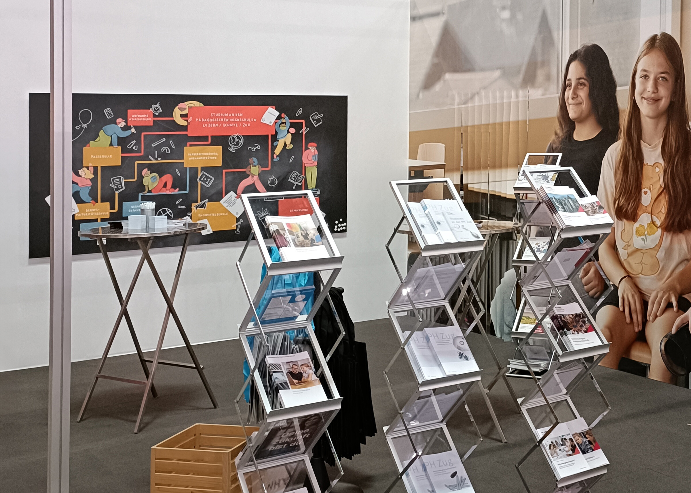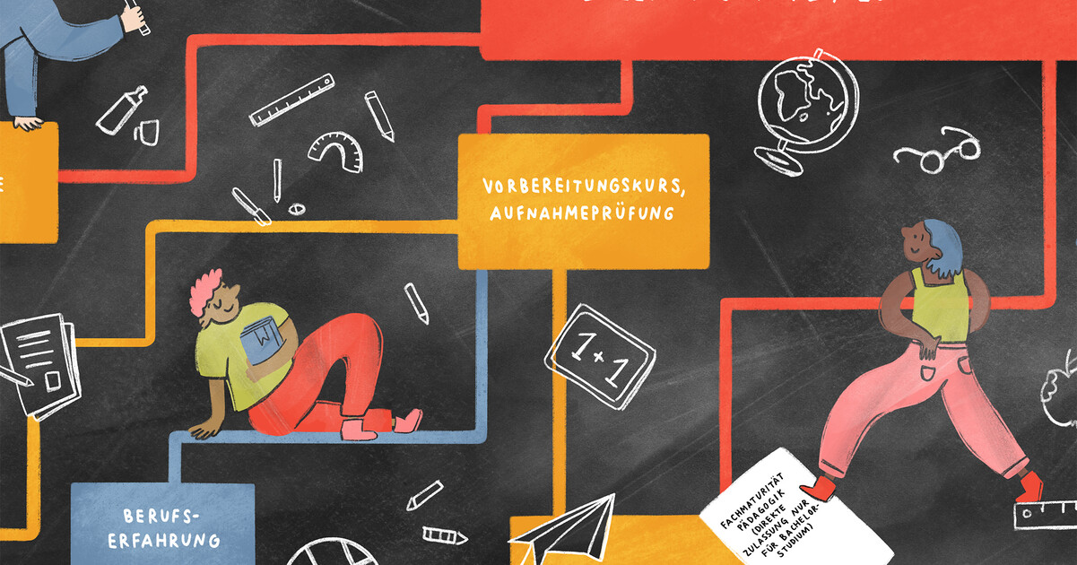 Die Pädagogischen Hochschulen präsentierten die attraktive, übersichtliche und leicht verständliche Infografik an ihrem Messestand auf verschiedenen Bildungsmessen. Sie veranschaulicht die verschiedenen Wege, die Interessent:innen an die Pädagogische Hochschule führen können. Farbcodierungen und grafische Elemente heben die unterschiedlichen Ausgangslagen und notwendigen Abschlüsse hervor. Zudem ermöglichen illustrative Elemente ein spielerisches Eintauchen ins Thema. So diente die Infografik während der Messe auch als hilfreiche Grundlage für Beratungsgespräche.