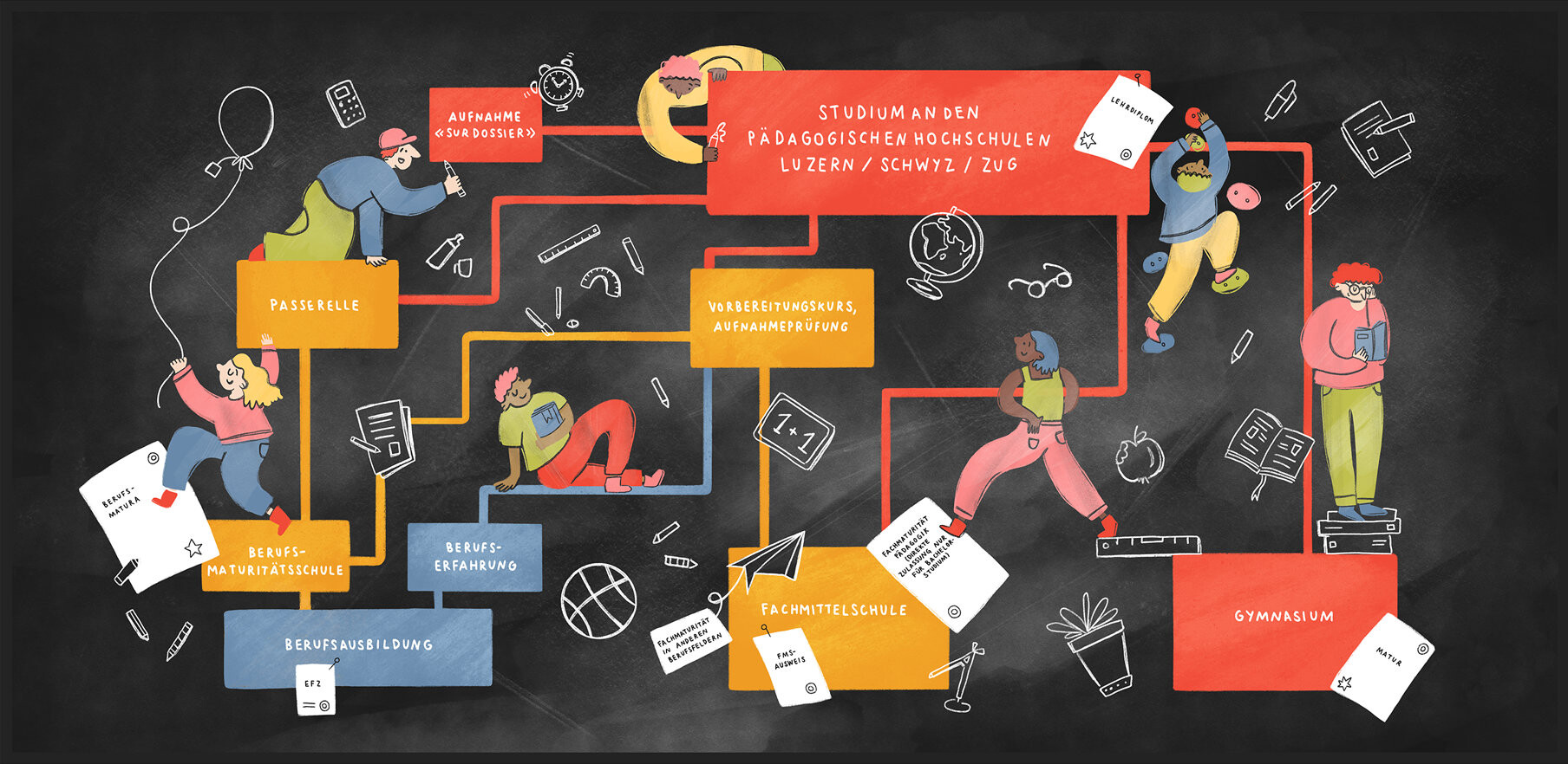 Die Pädagogischen Hochschulen Luzern, Schwyz und Zug punkten mit einer attraktiven Infografik, die sämtliche Karrierewege aufzeigt, die bis ins Studium führen.