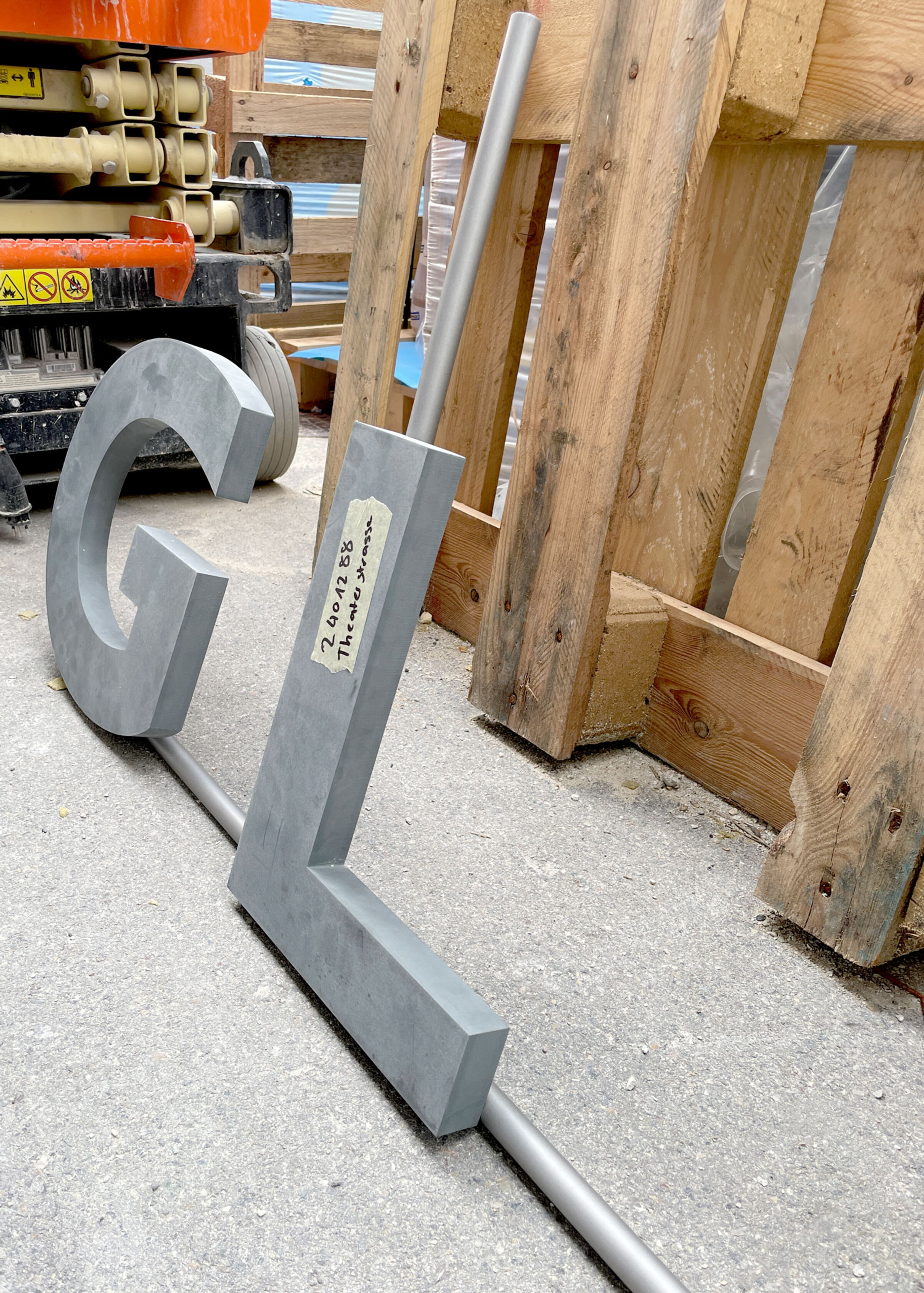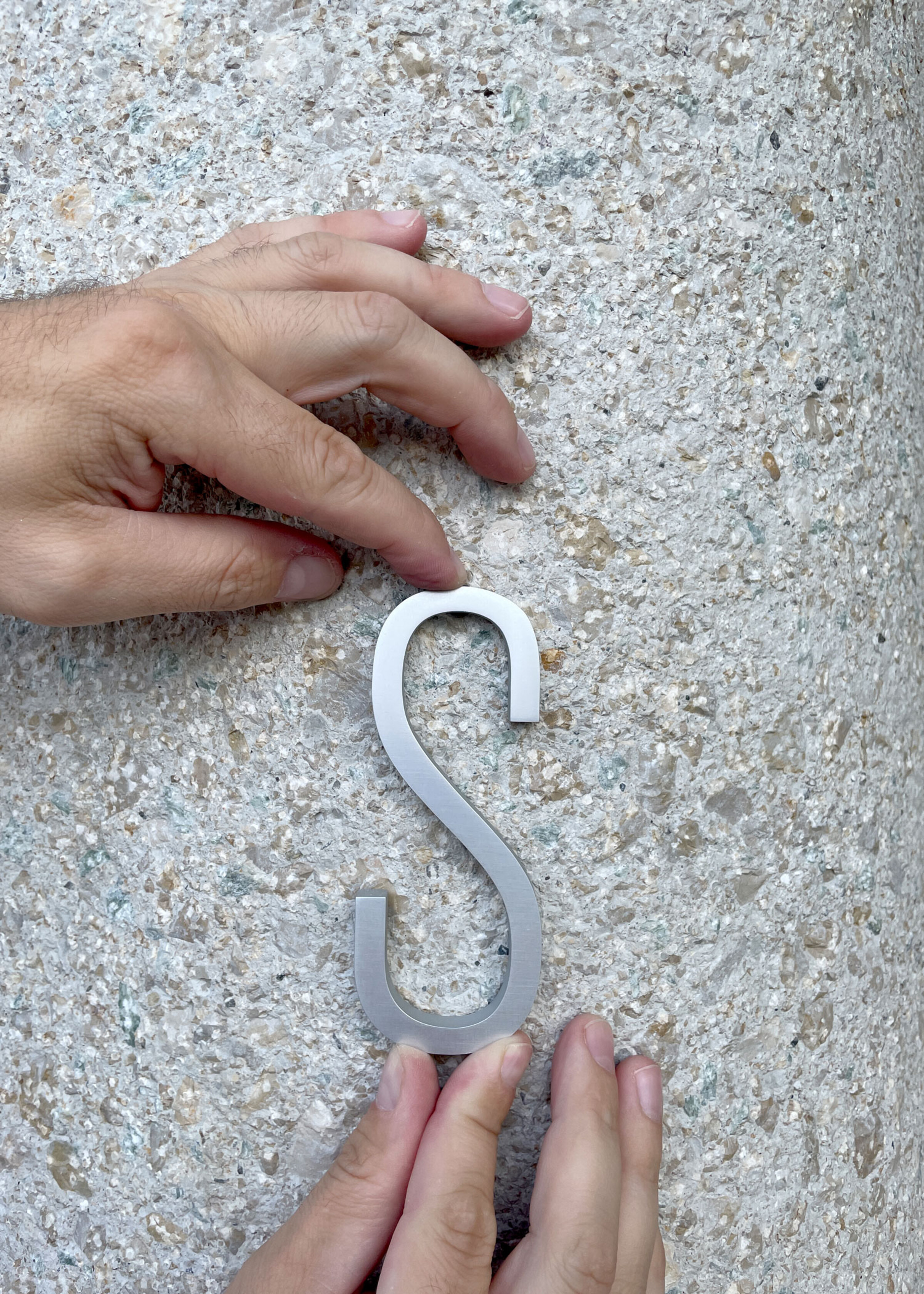 Die Kennzeichnung der Stockwerke und Mieter:innen im Treppenhaus sind auf filigranen Bügeln gestaltet. Ein elegantes und doch funktionales Beschriftungssystem. Die Signaletik wird Teil der Gebäudegestaltung.