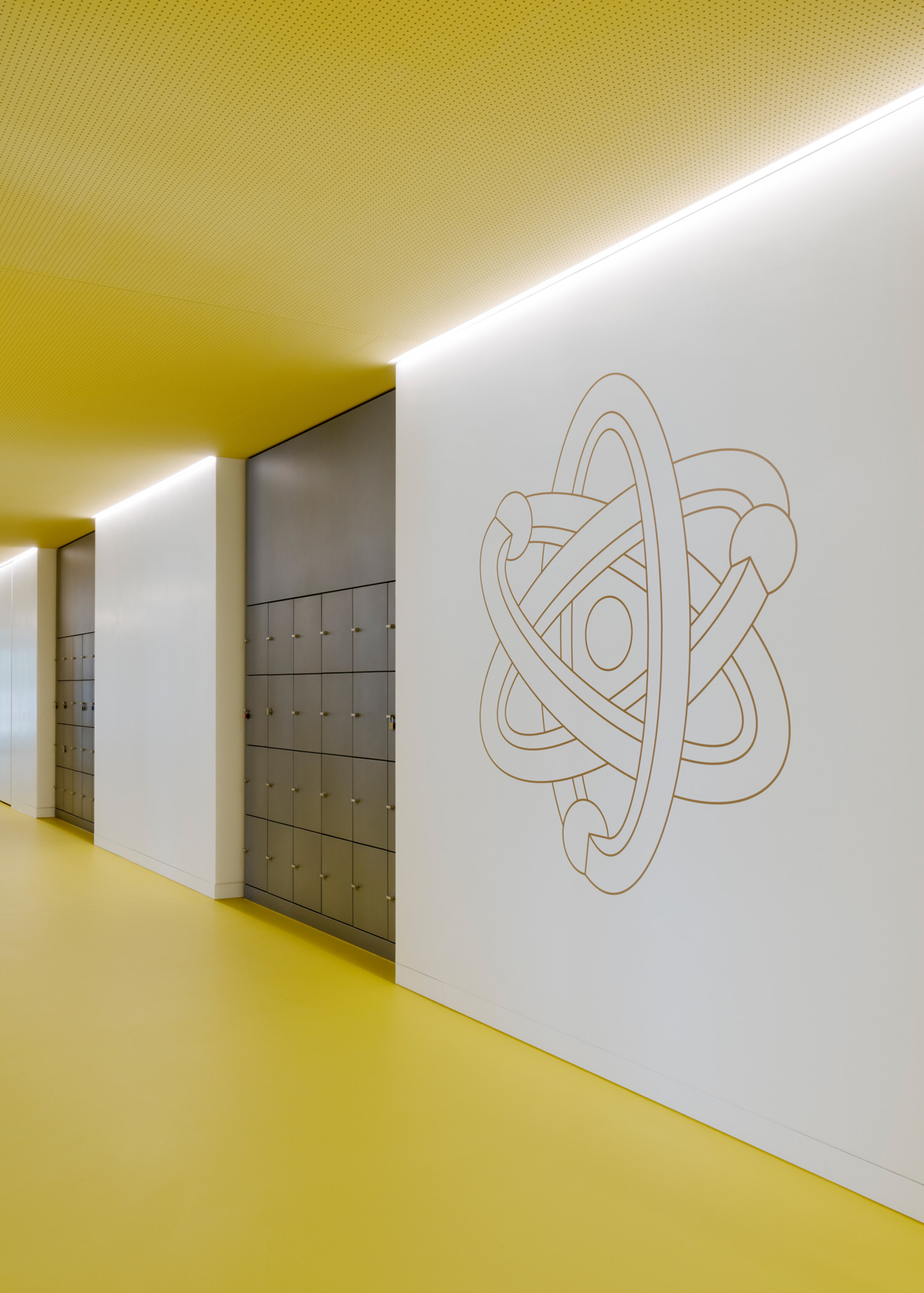 Aussen ist die Gebäudekennzeichnung aufwändig mit dreidimensionalen, per 3-D-Drucker hergestellten Buchstaben umgesetzt, deren Outlines nachts leuchten. Im Innern platzierten wir zur Kennzeichnung der Gebäudetrakte grosse Buchstaben und Icons ähnlich, aber zweidimensional direkt auf der Wand.