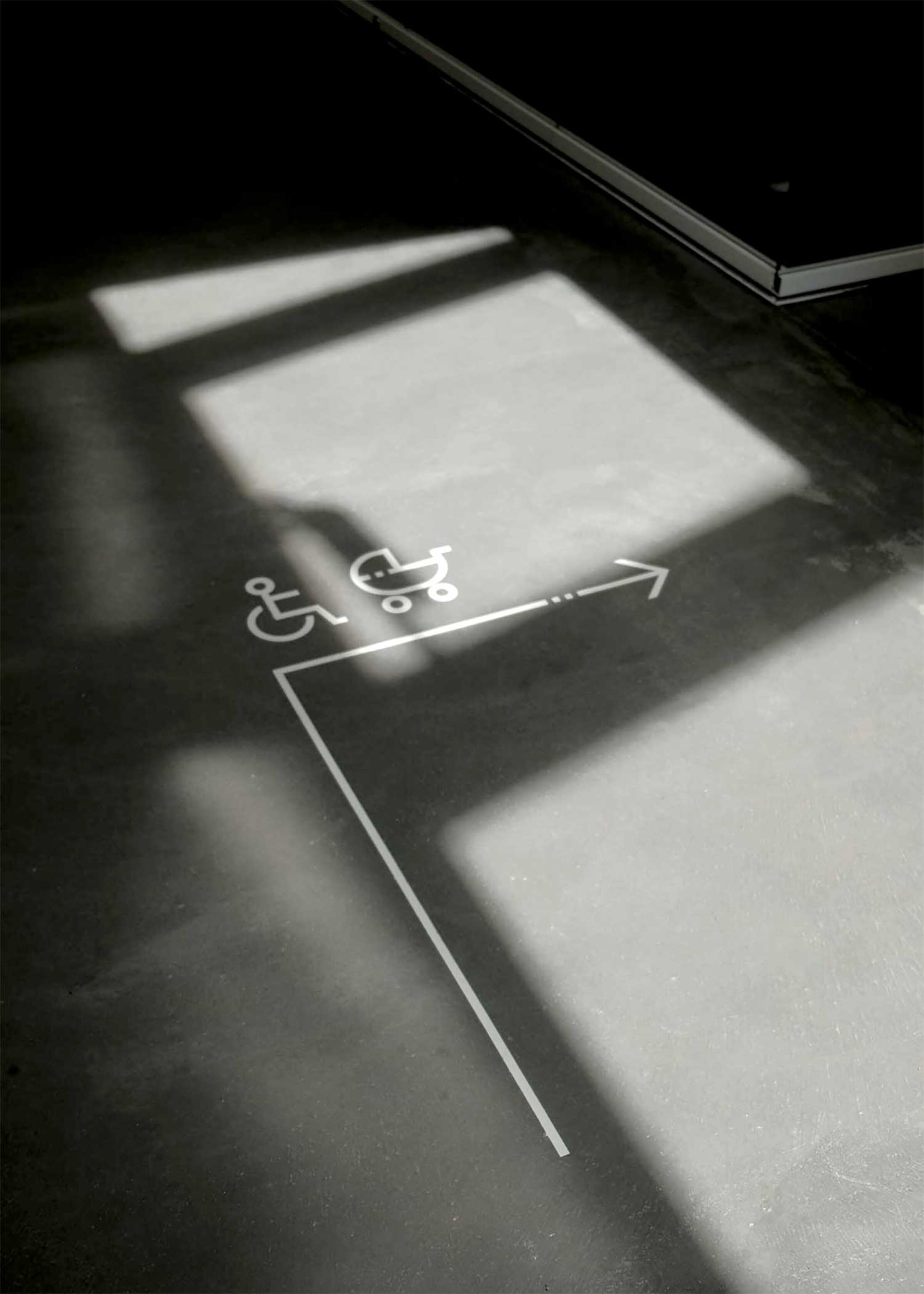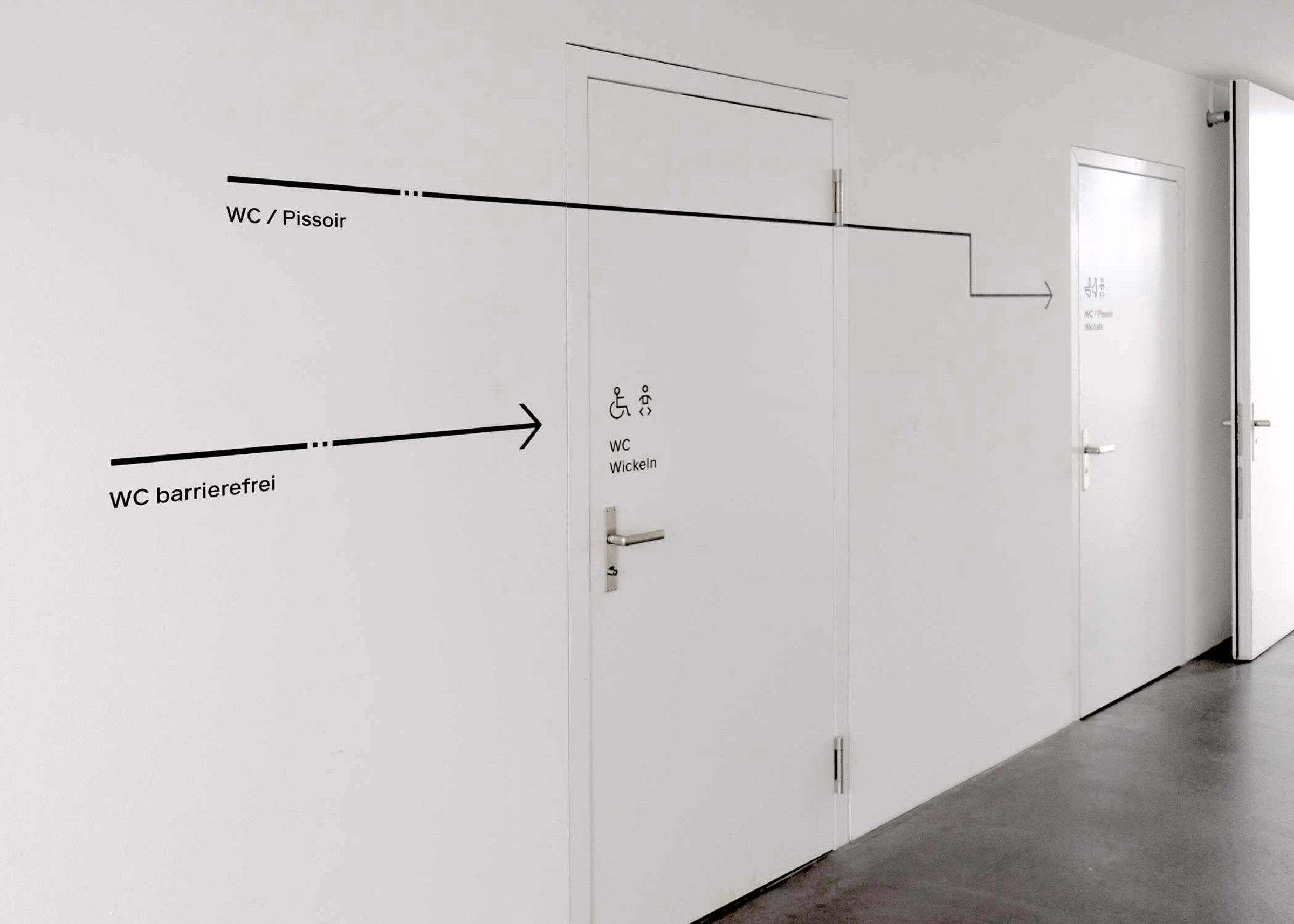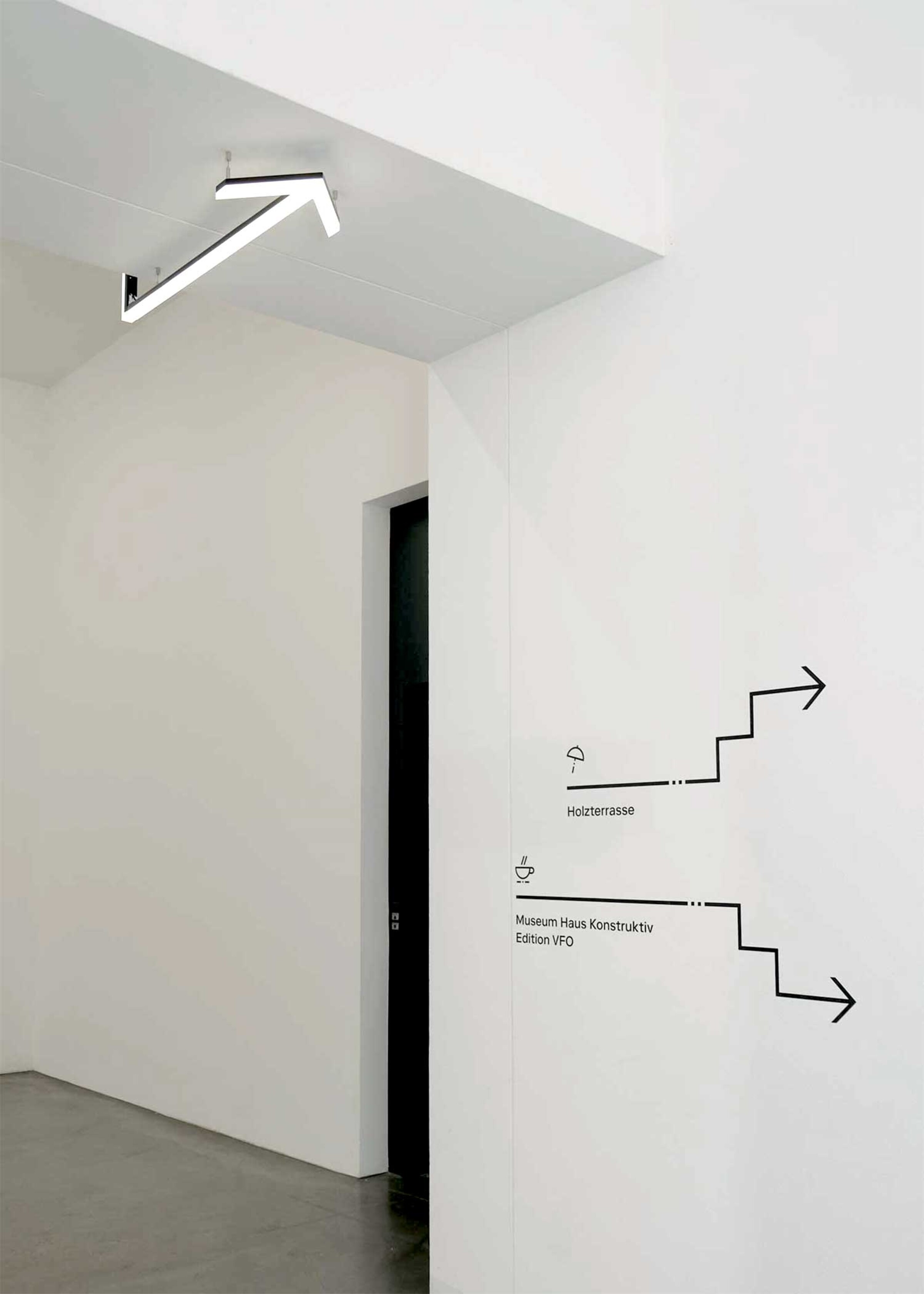 Für die Signaletik wurde eine eigene Ikonografie entwickelt. Die gut lesbaren und schnell erfassbaren Piktogramme lassen sich beliebig auflisten und erweitern. So kann flexibel auf die unterschiedlichen Ziele im Haus reagiert werden. Das Zeichenvokabular stimmt sich formal auf die Pfeile und Piktogramme ab.