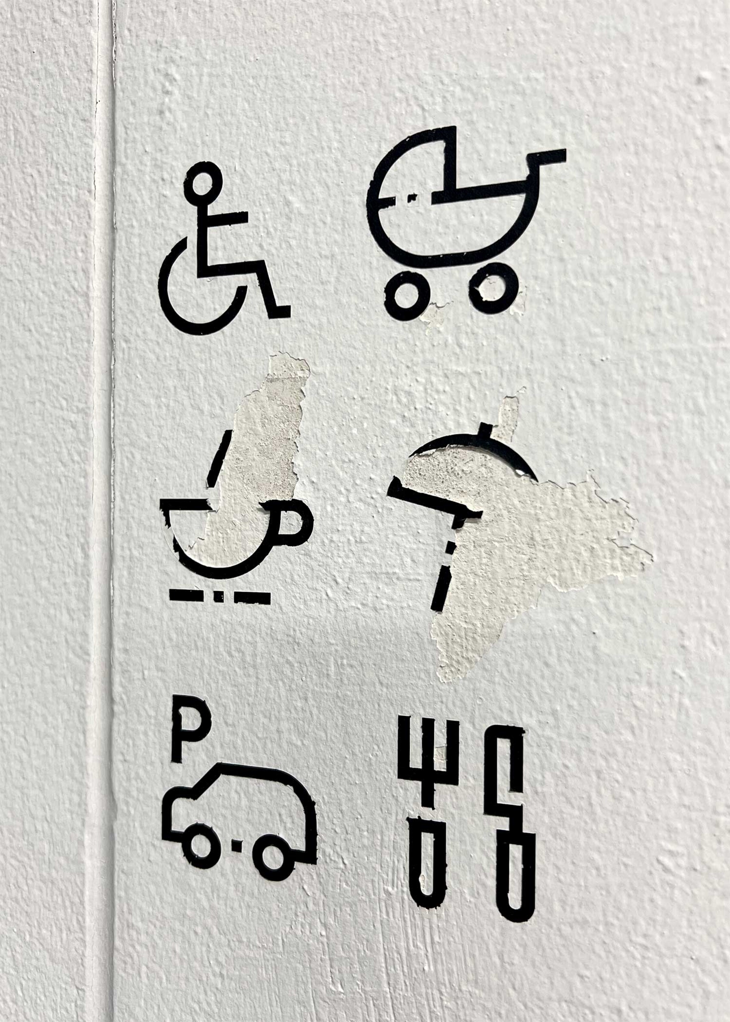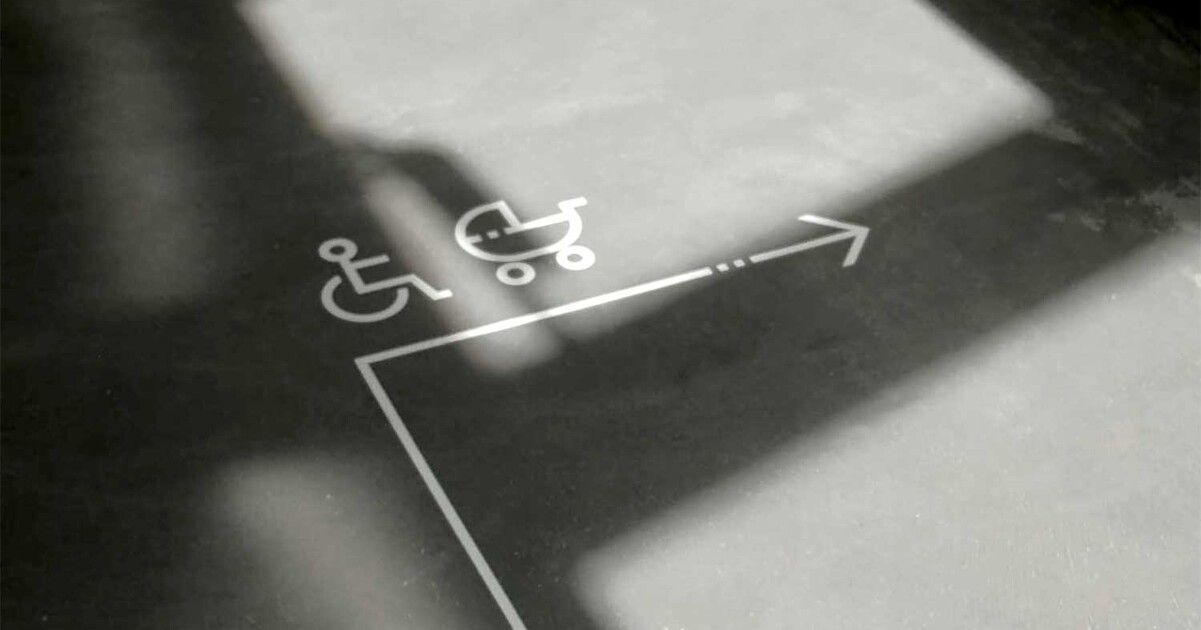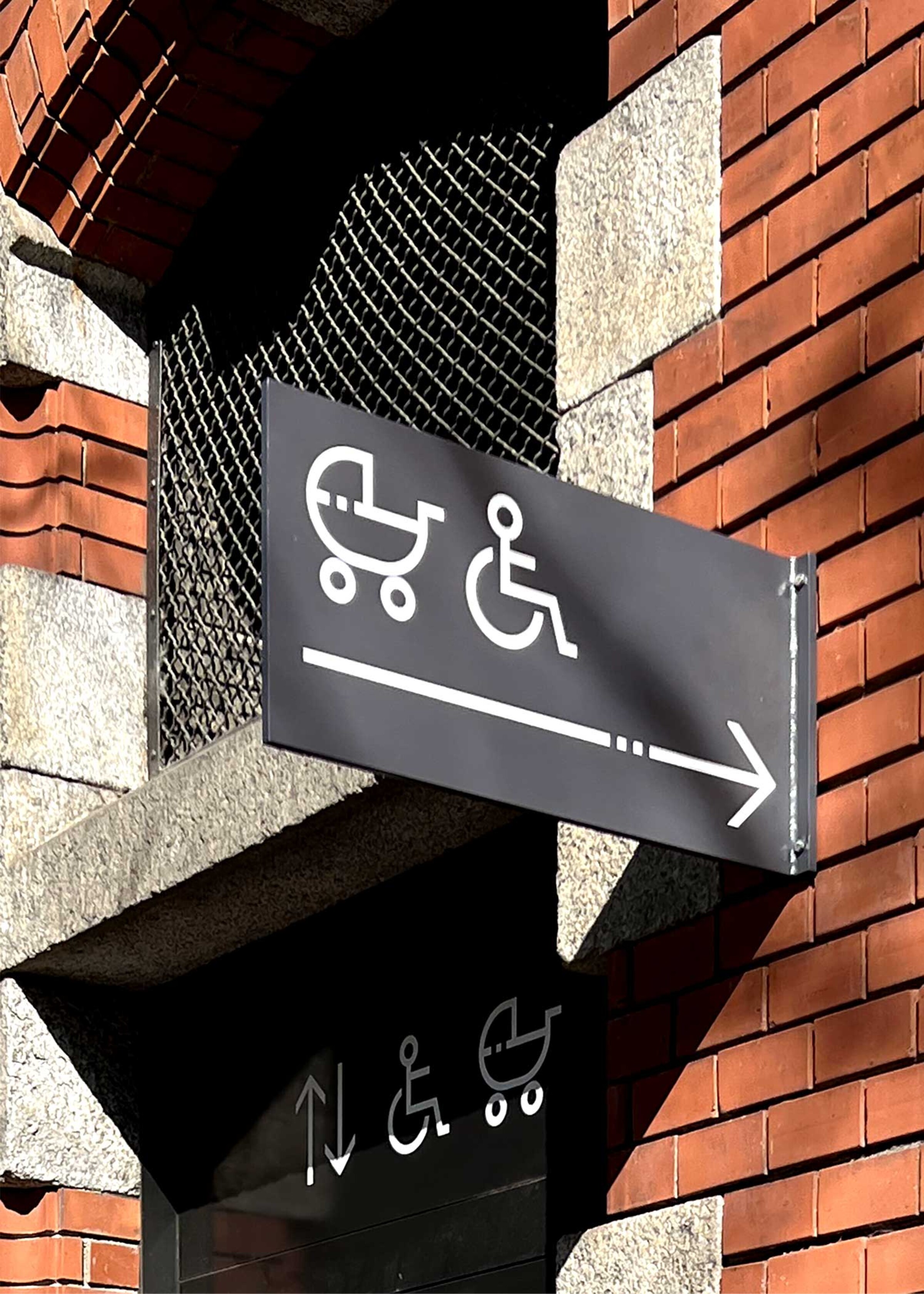 Für die Signaletik wurde eine eigene Ikonografie entwickelt. Die gut lesbaren und schnell erfassbaren Piktogramme lassen sich beliebig auflisten und erweitern. So kann flexibel auf die unterschiedlichen Ziele im Haus reagiert werden. Das Zeichenvokabular stimmt sich formal auf die Pfeile und Piktogramme ab.