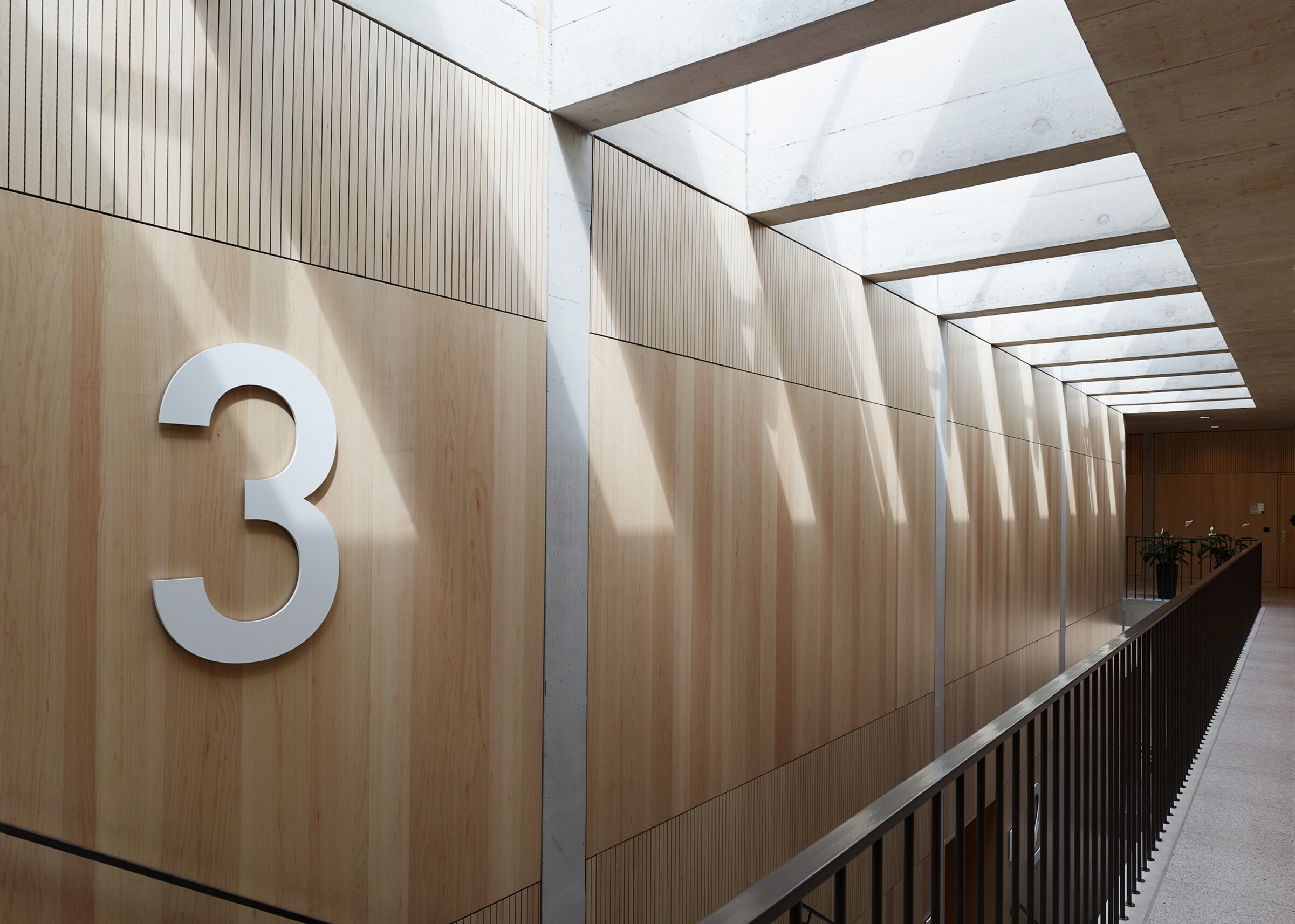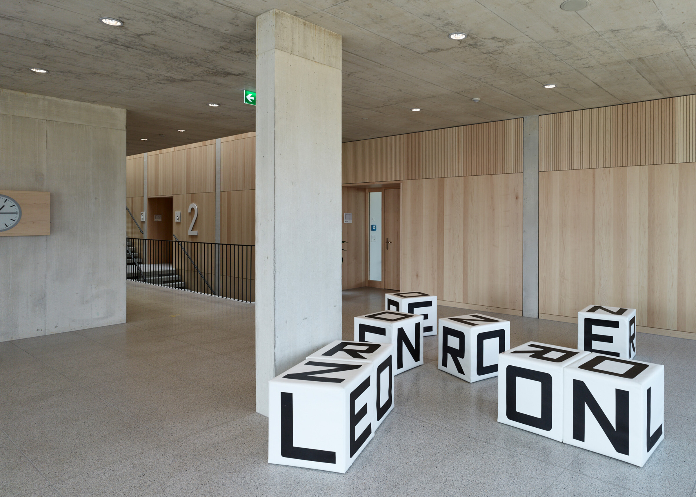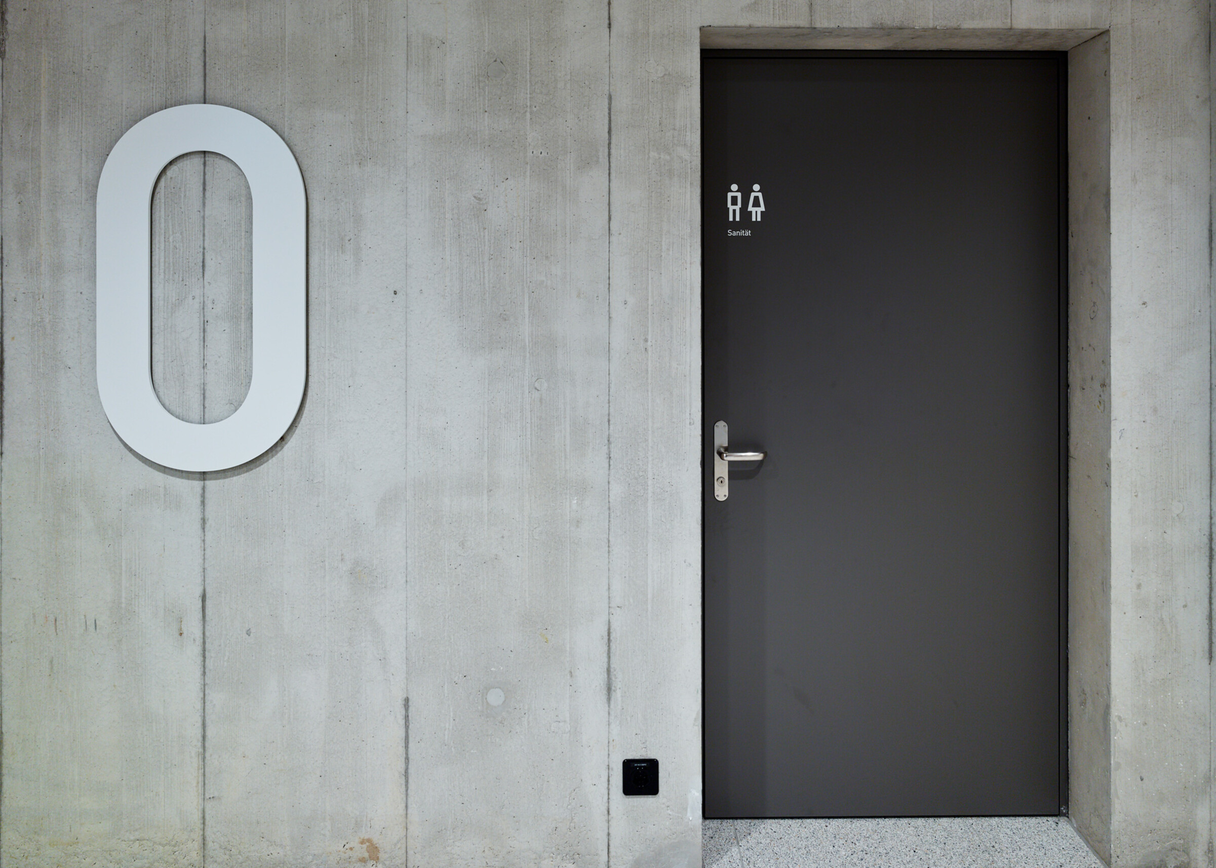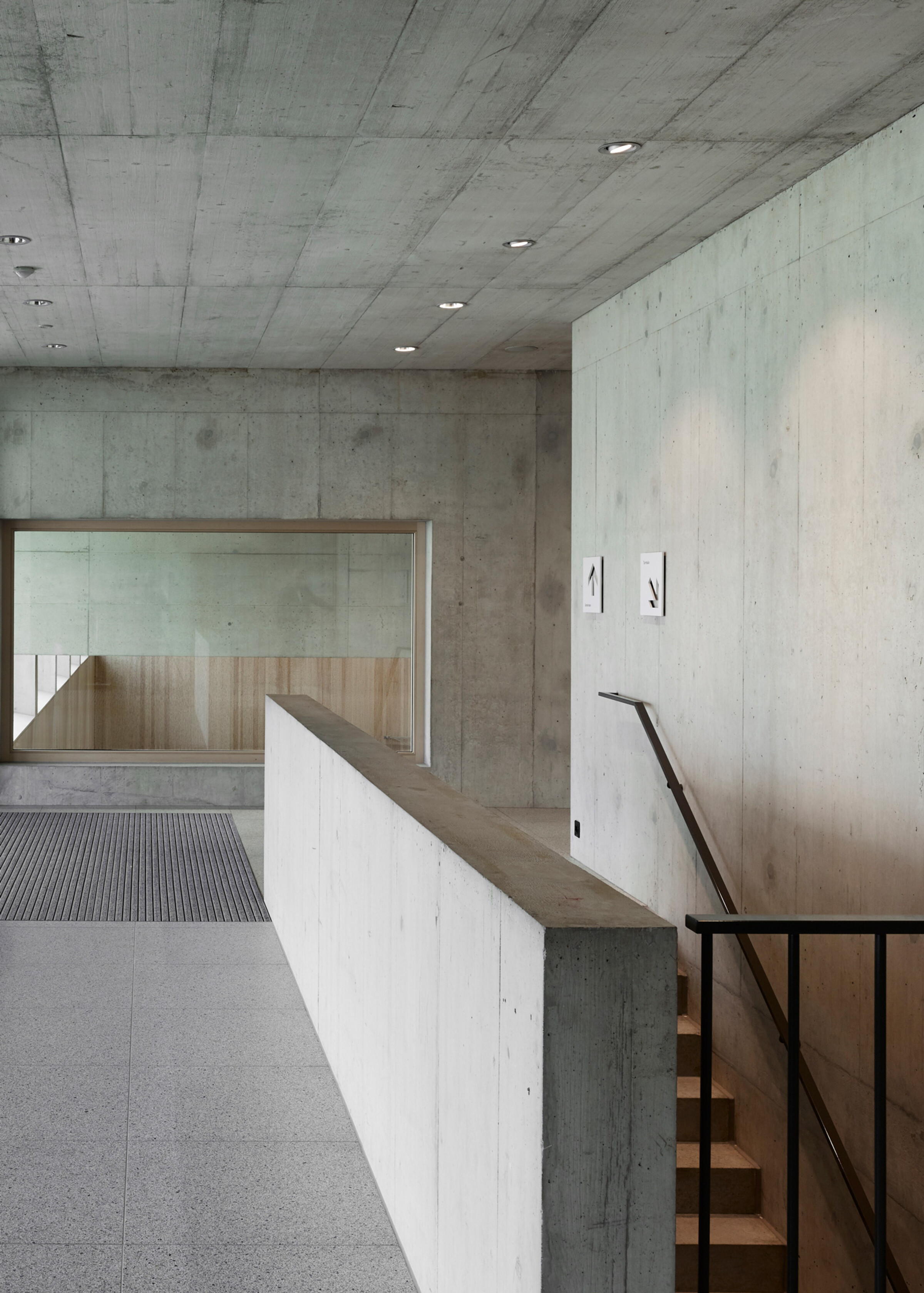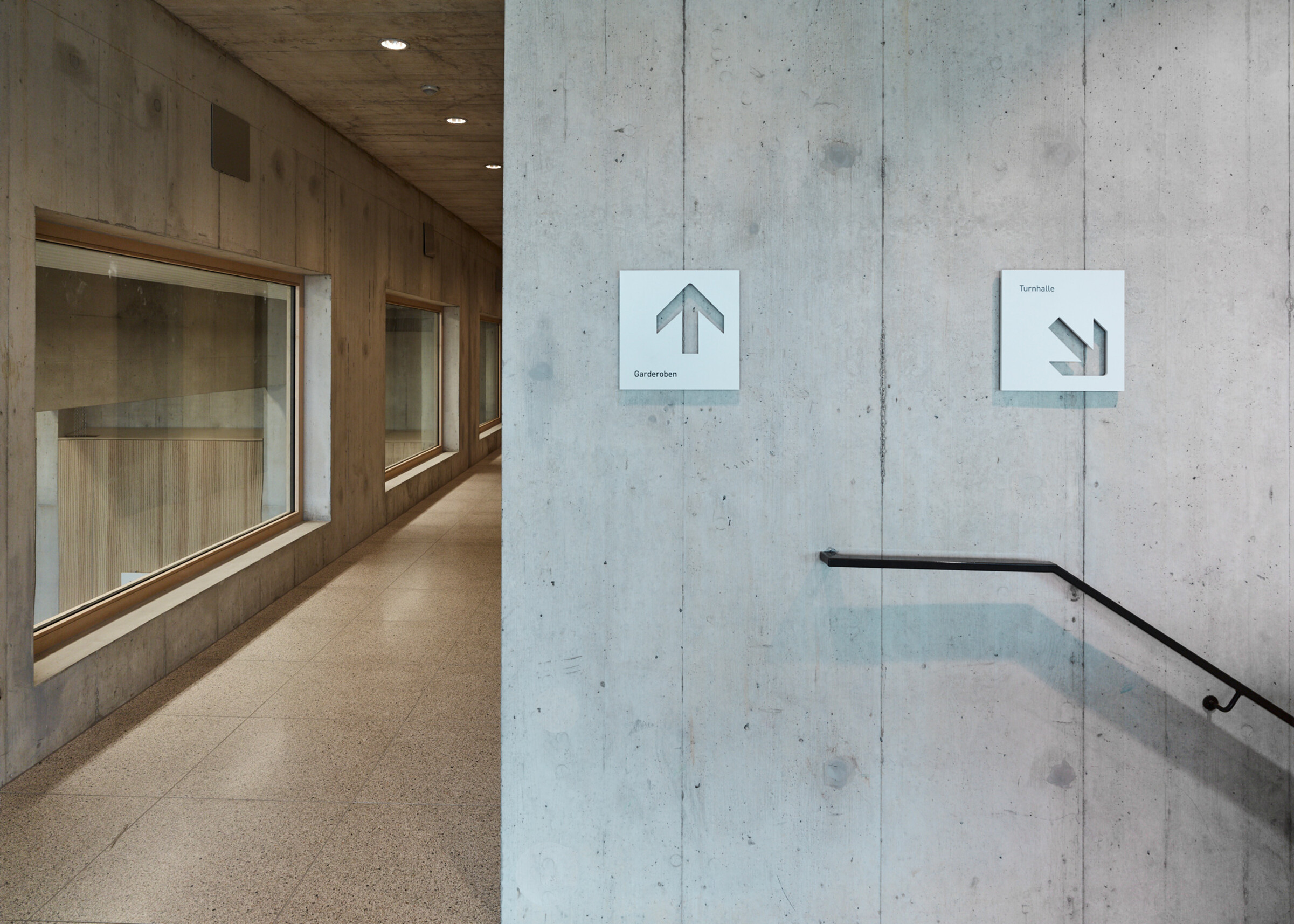 Diese Elemente sind dank dezent gewählter Materialisierung harmonisch in die Architektur integriert. Das speziell entwickelte Schilder-System sucht mit positiv-negativ Formen ebenfalls den Bezug zu den bereits vorhandenen Materialien im Innenraum.