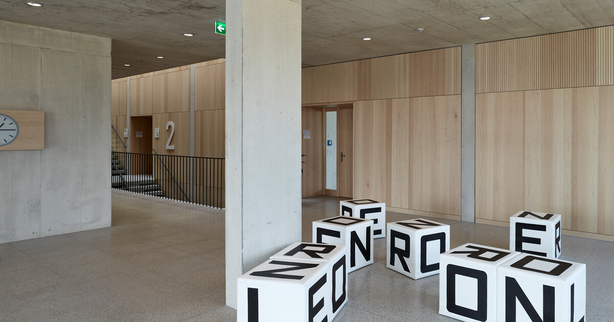 Die Signaletikelemente für die Gebäudebeschriftung auf dem Schulareal Looren in der Gemeinde Maur sind von einer quadratischen Grundform abgeleitet.