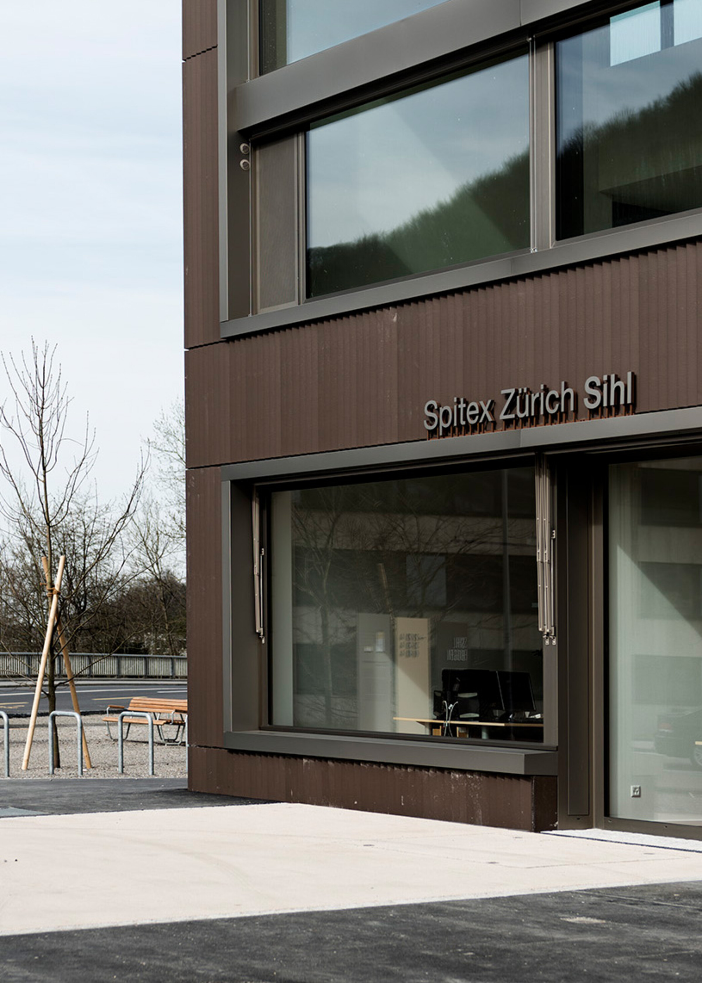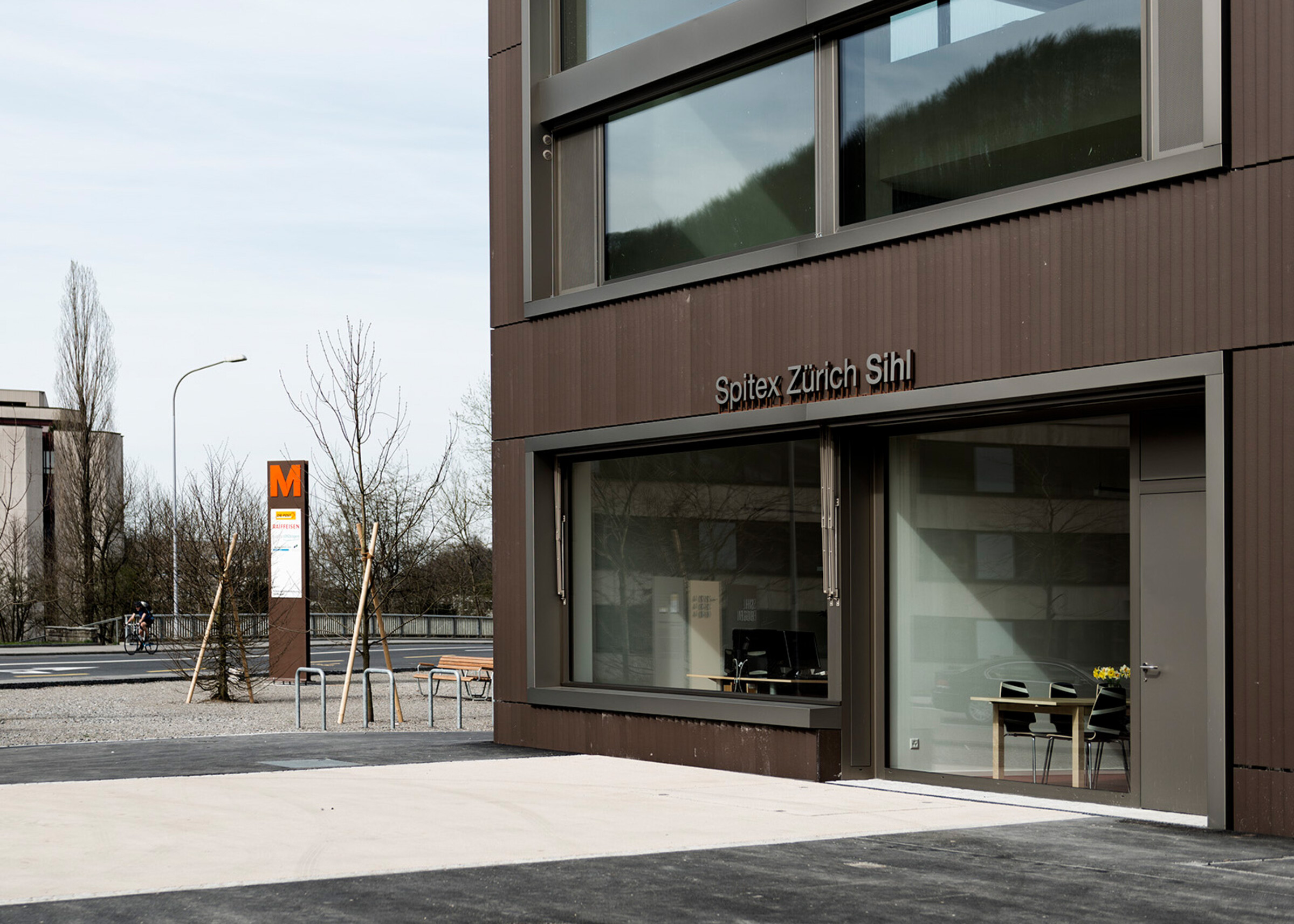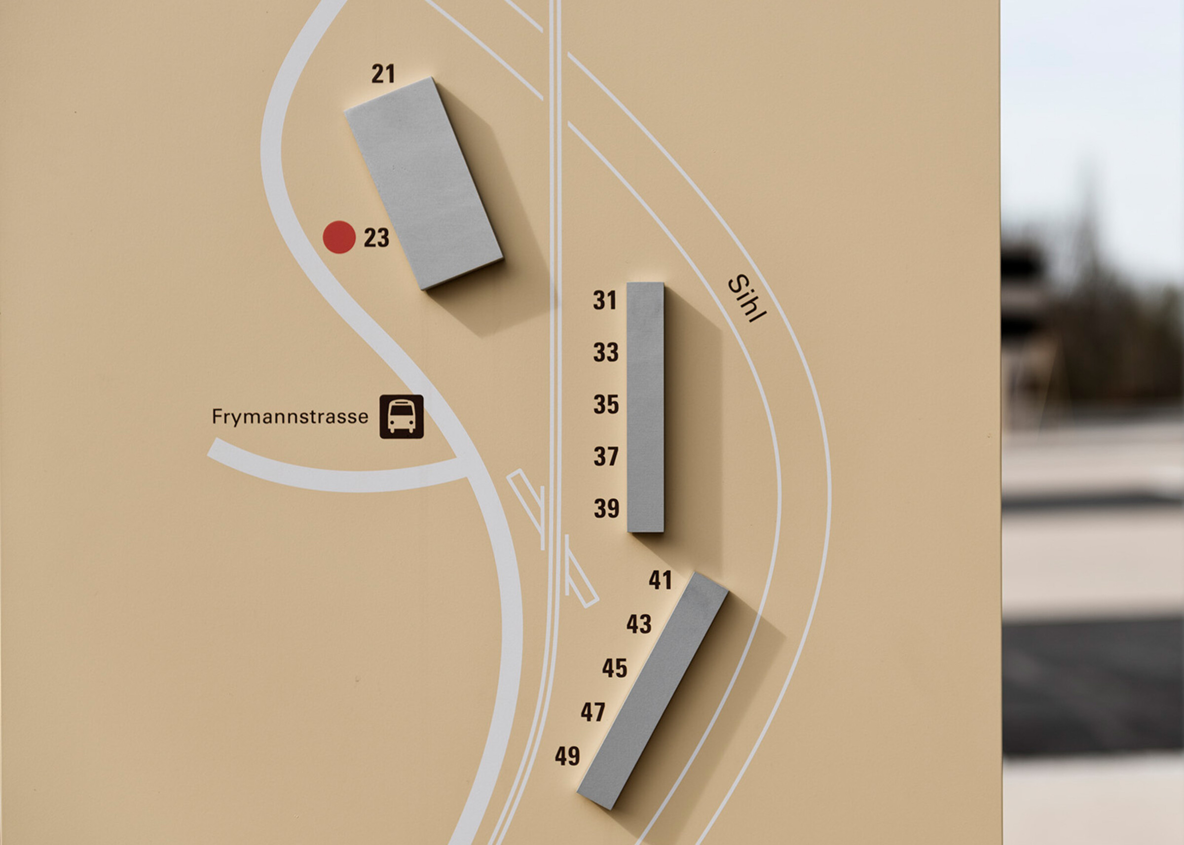 Die Überbauung «Sihlbogen» mit über 220 Wohnungen und Gewerbeflächen liegt direkt an der Sihl in Zürich-Leimbach und orientiert sich an den Nachhaltigkeitsprinzipien der 2000-Watt-Gesellschaft. Ein auf die Architektur abgestimmtes Signaletik-Konzept mit speziellen Kennzeichnungselementen weist Bewohner:innen und Besucher:innen den Weg.
