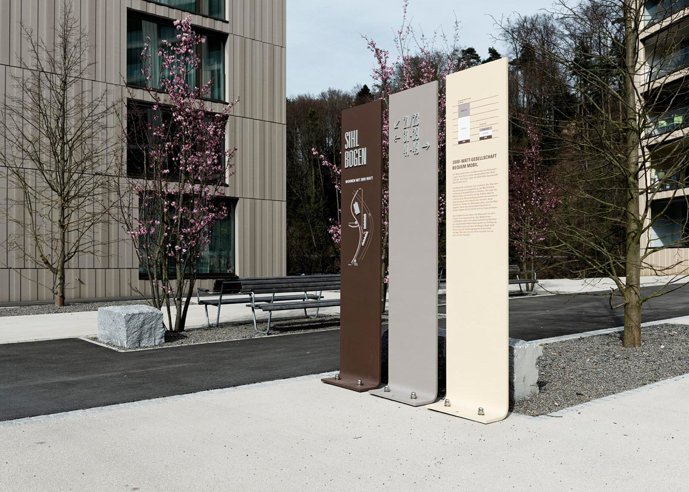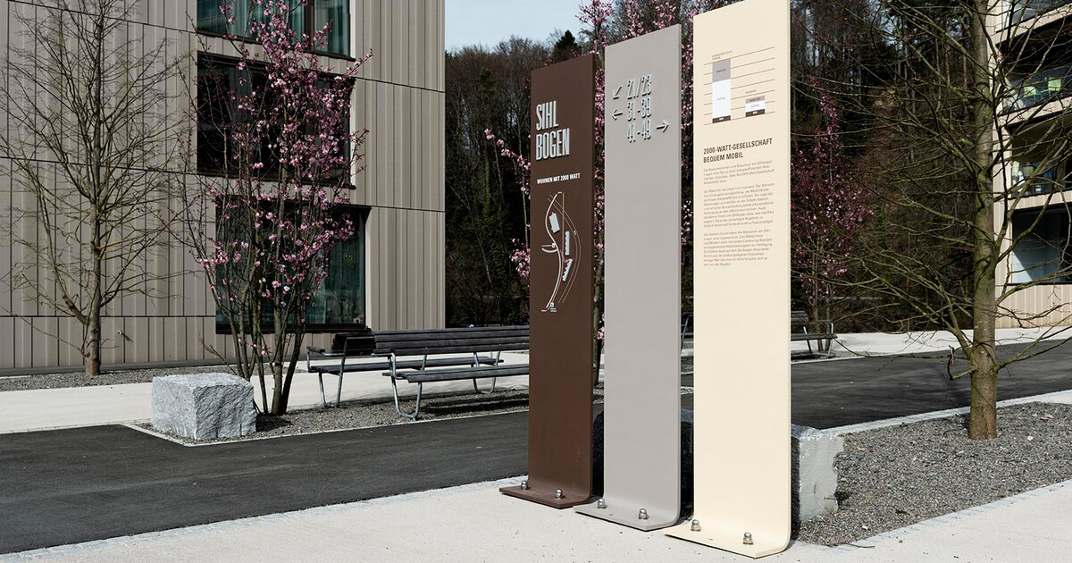 Die Signaletik auf dem 21'000 Quadratmeter grossen Areal Sihlbogen und in den drei Gebäuden umfasst Fern- und Arealkennzeichnungselemente, Wegleitungen, Stockwerksübersichten sowie Wohnungs- und Raumkennzeichnungen. Im Aussenbereich stellt die Konstruktion der Stelen durch den Abbug der Aluminiumplatten einen Bezug zum Sihlbogen her. Auf den Dreier-Stelen finden sich neben einem Situationsplan und der Wegleitung Informationen zur 2000-Watt-Gesellschaft und zur Überbauung Sihlbogen.