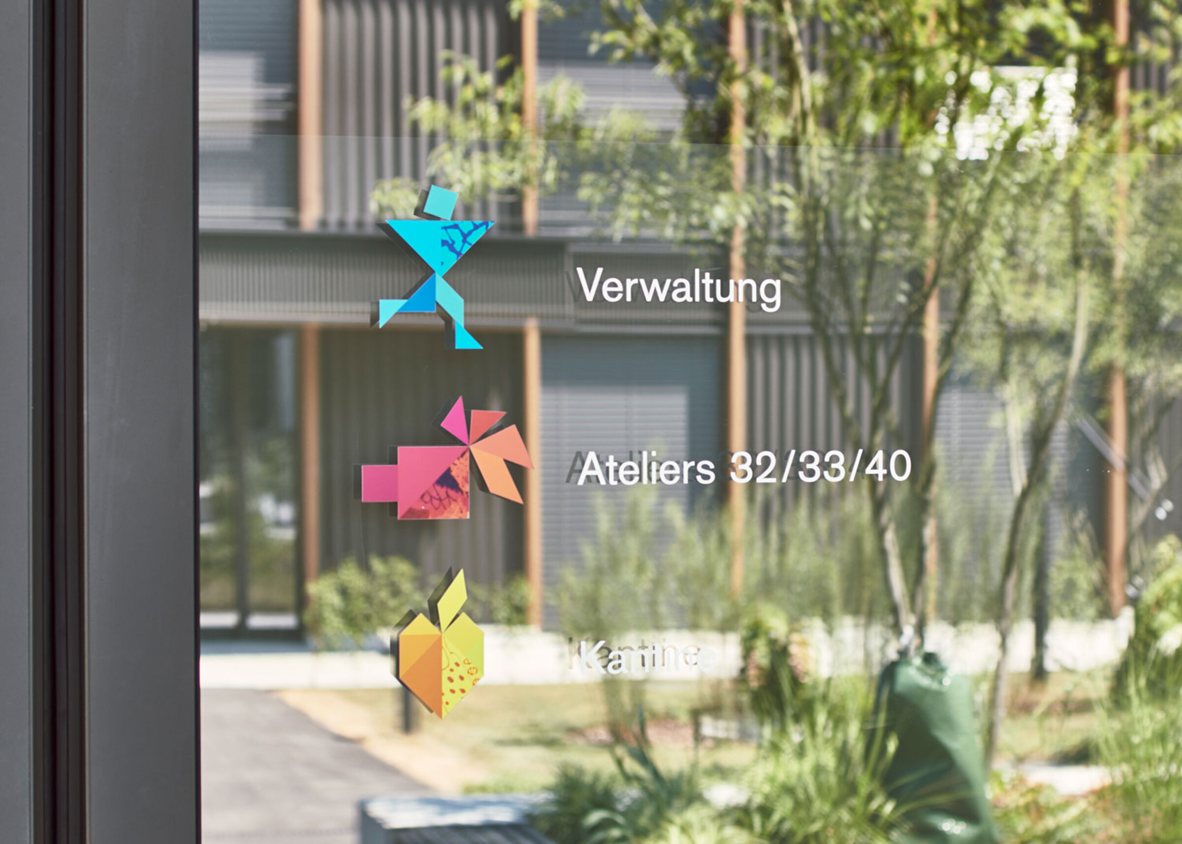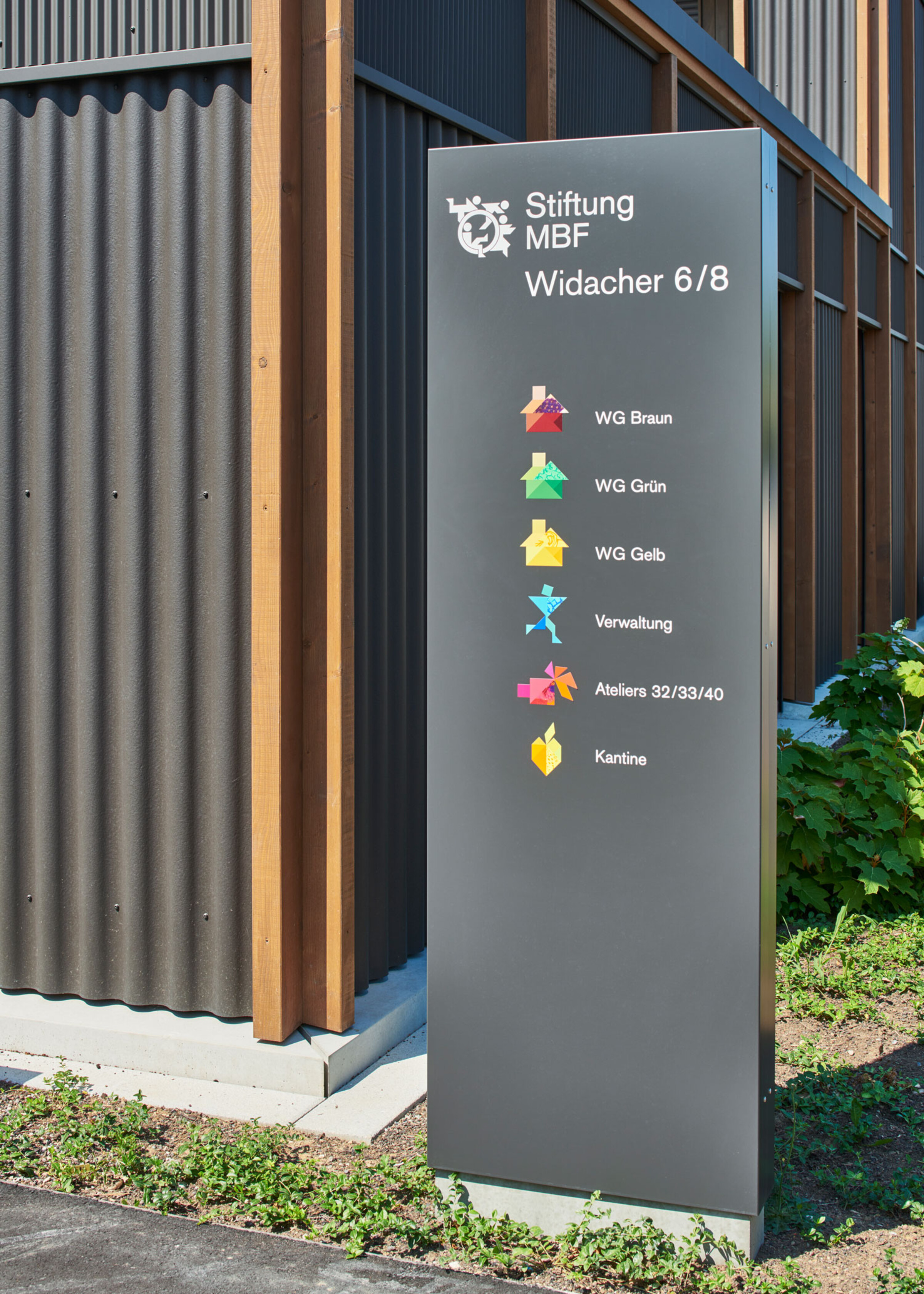 Unsere Aufgabe war es, eine modulare Signaletik für die neuen und bestehenden Gebäude der Stiftung MBF zu gestalten. Wir haben das visuelle Konzept der Stiftung aufgenommen und weiterentwickelt: Die charakteristischen Farben und Origami-Elemente finden sich nun auch in der Beschriftung wieder.