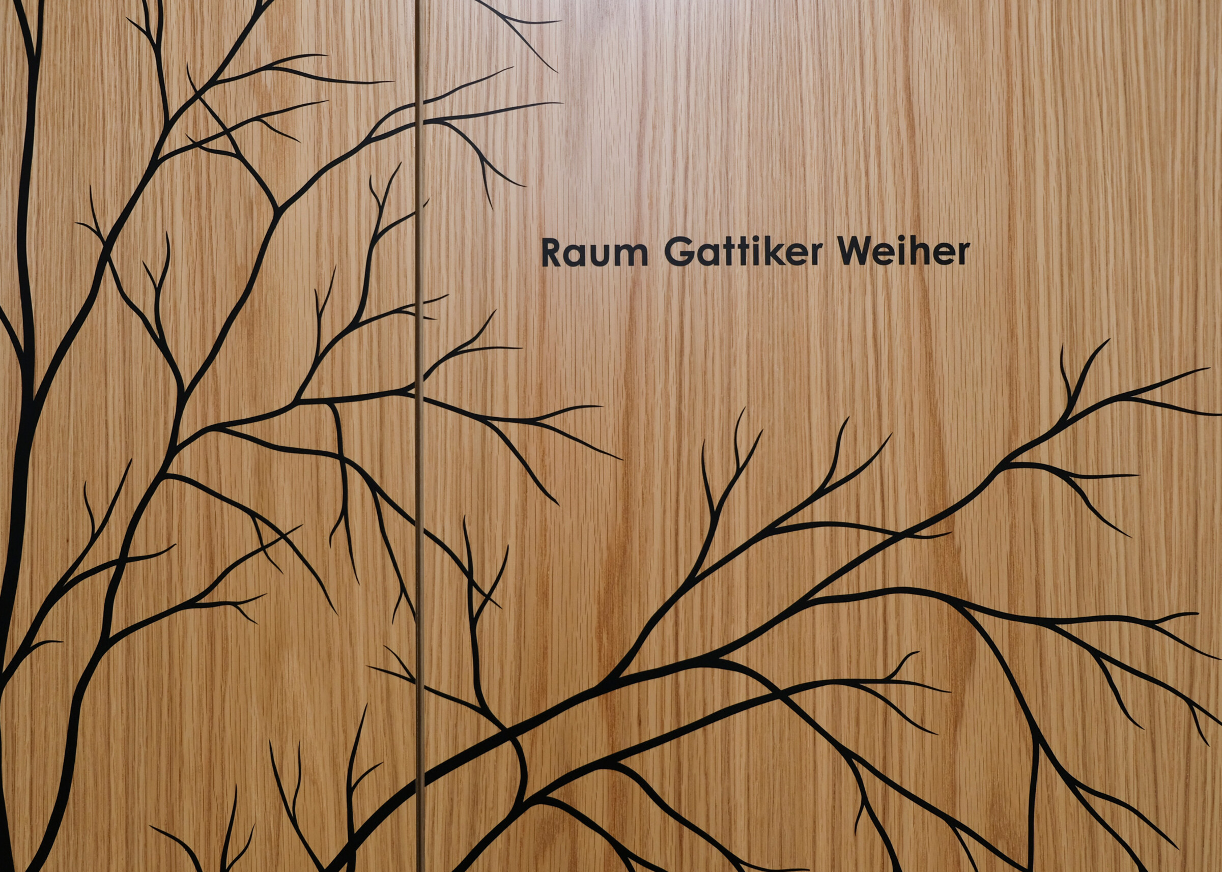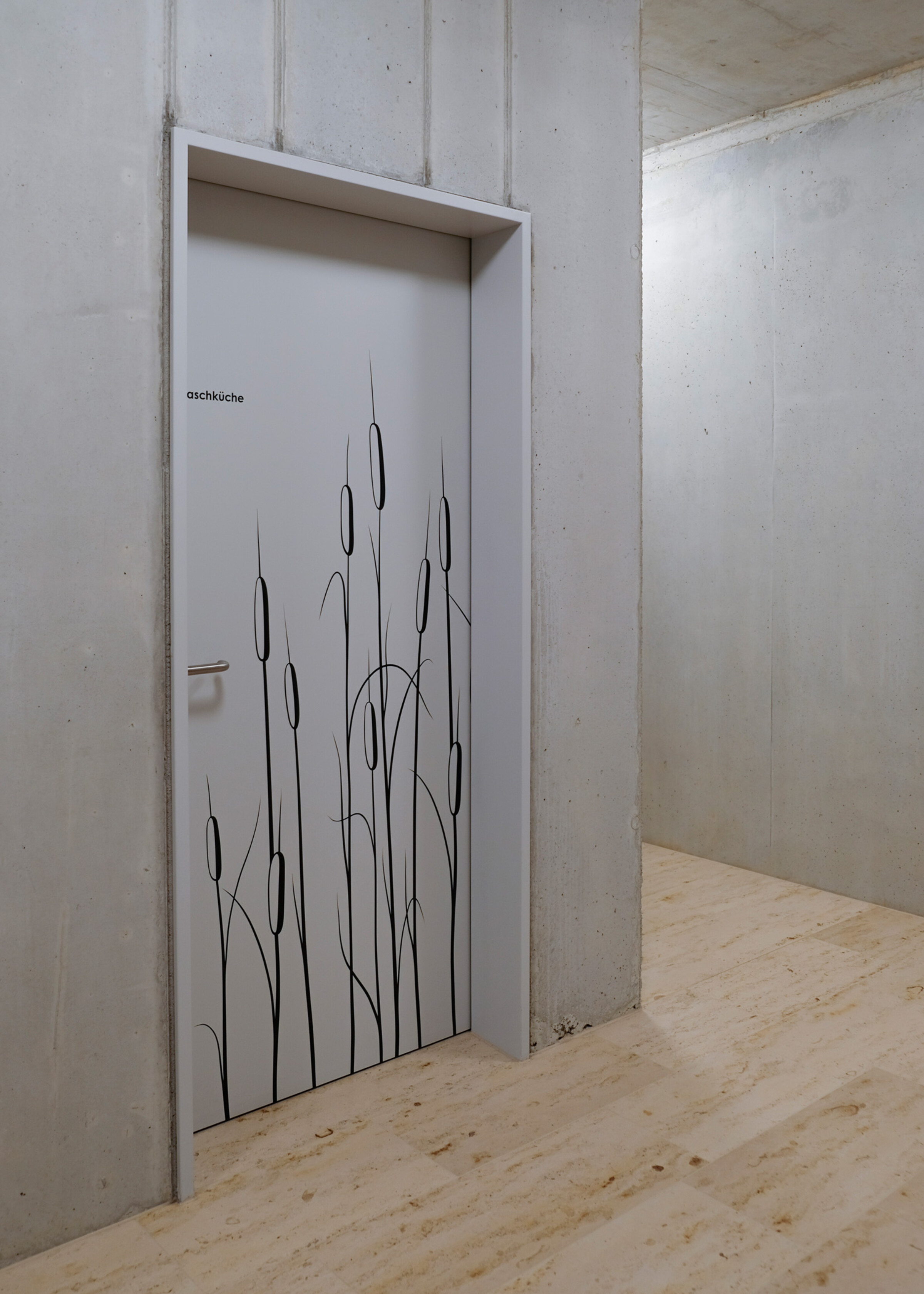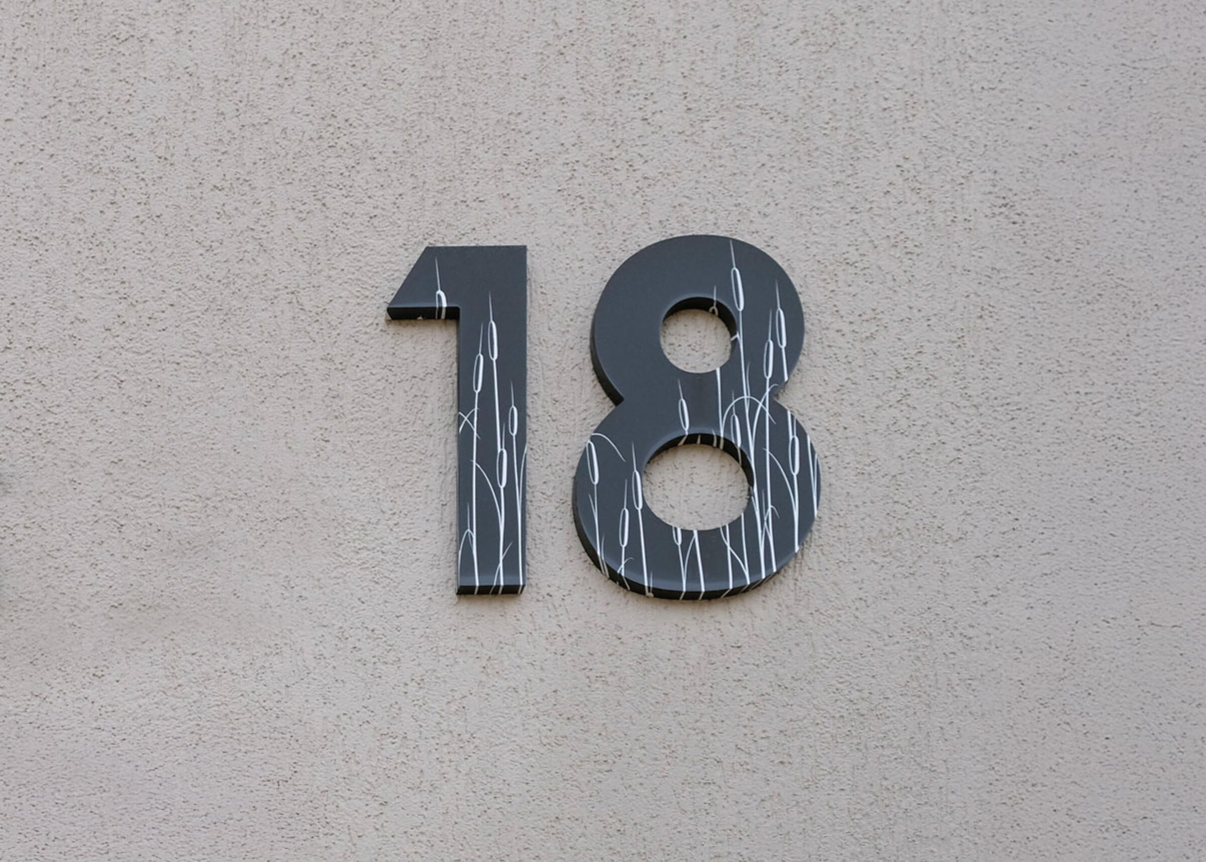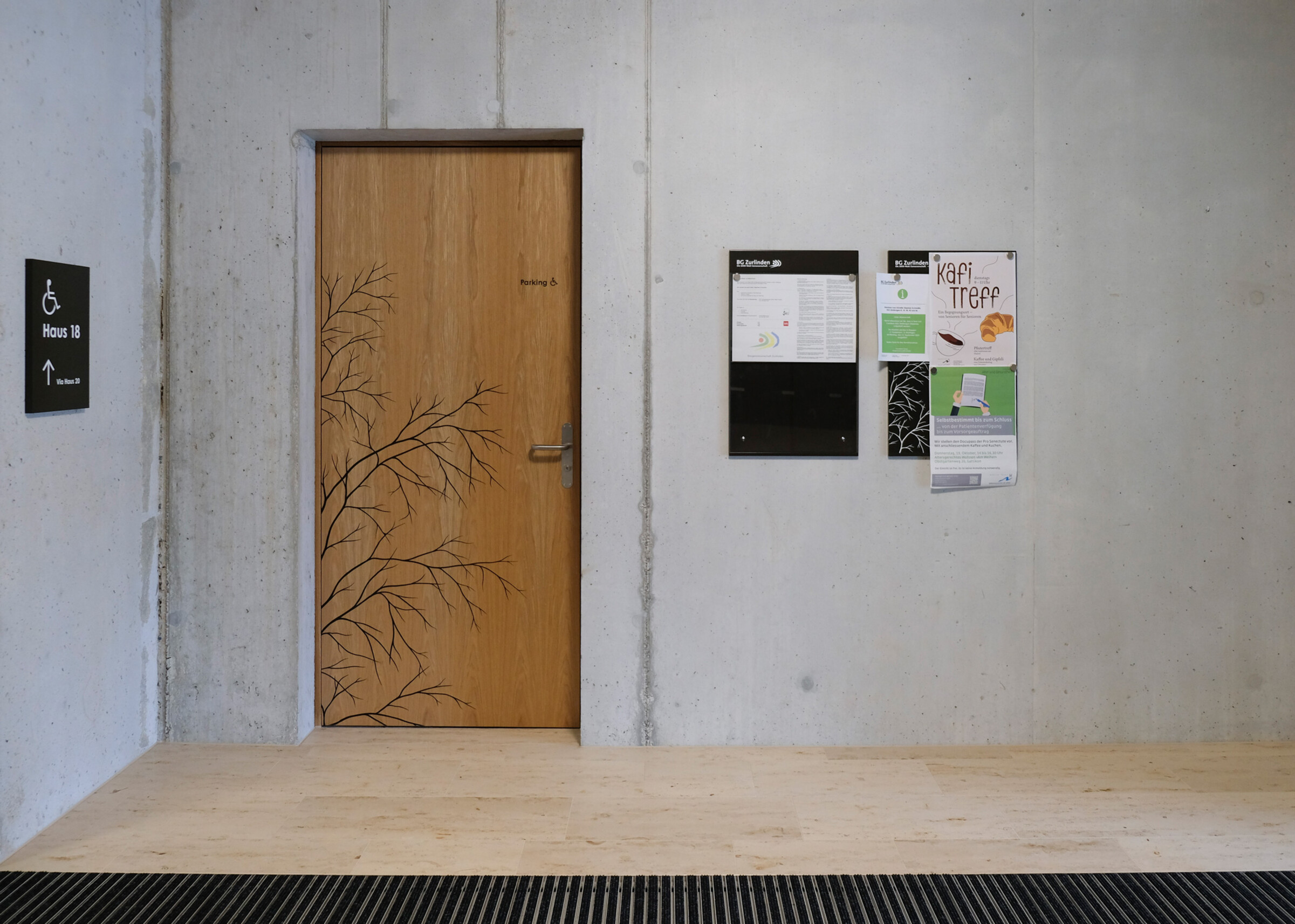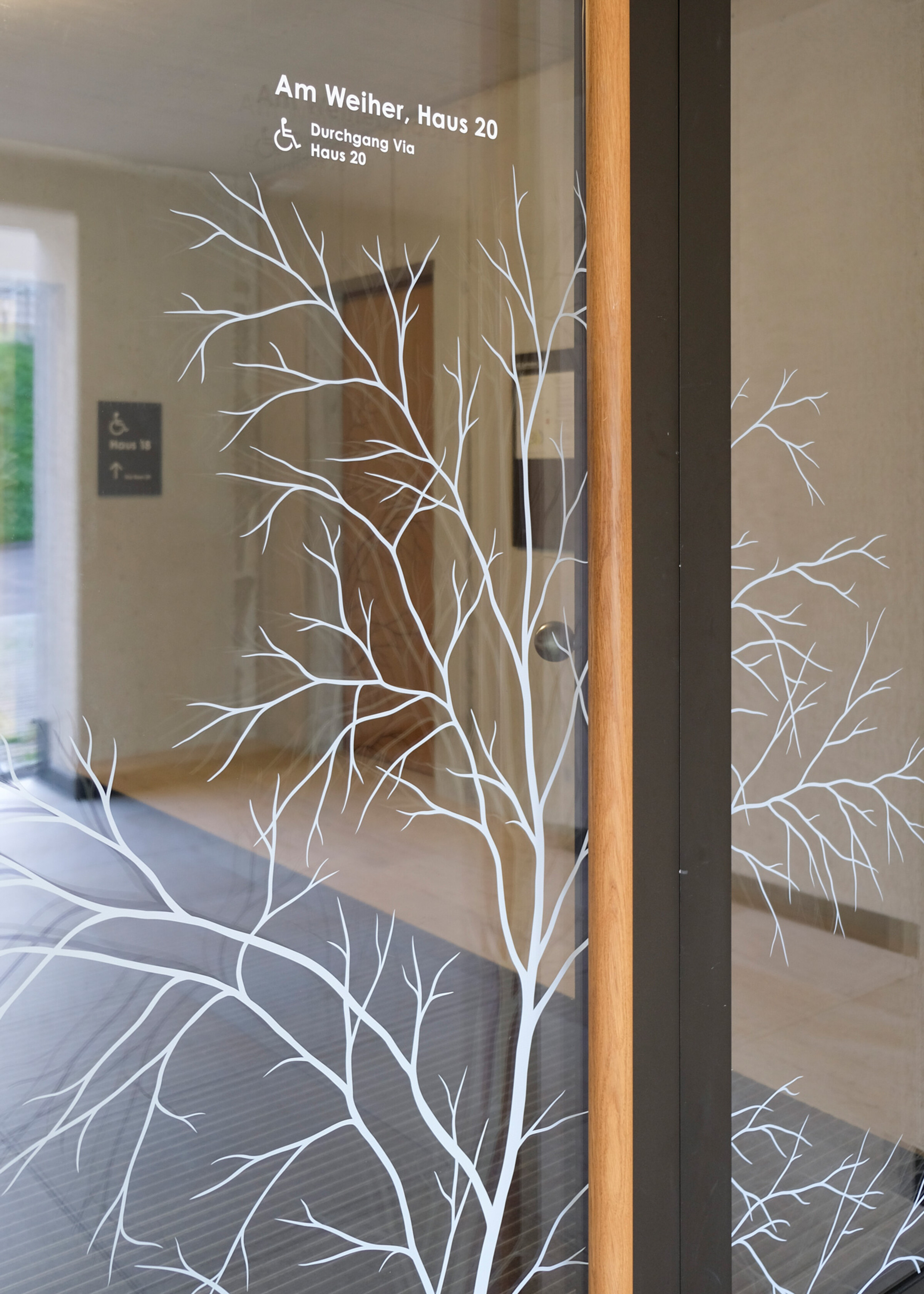 Für die Signaletik in der altersgerechten Wohnsiedlung am Weiher in Gattikon illustrierten wir zwei Muster, die die beiden Häuser unterscheidet. Inspiriert von der umgebenden Natur und dem nahegelegenen Weiher erhält das Haus 18 ein Rohrkolben-Muster und das Haus 20 ein Baummuster.