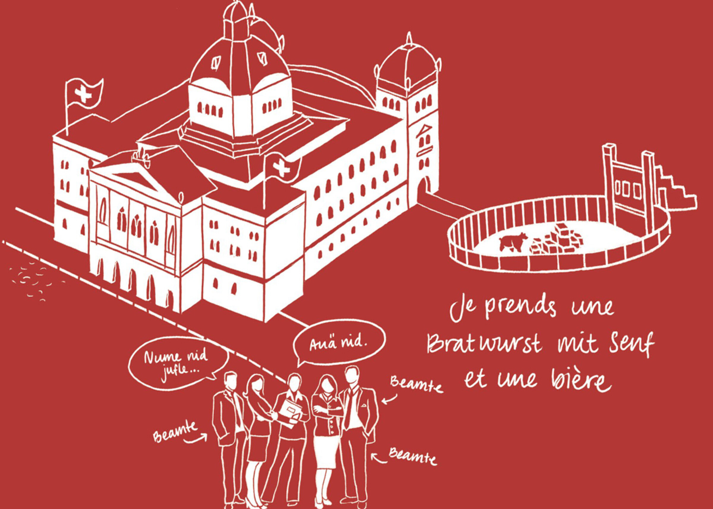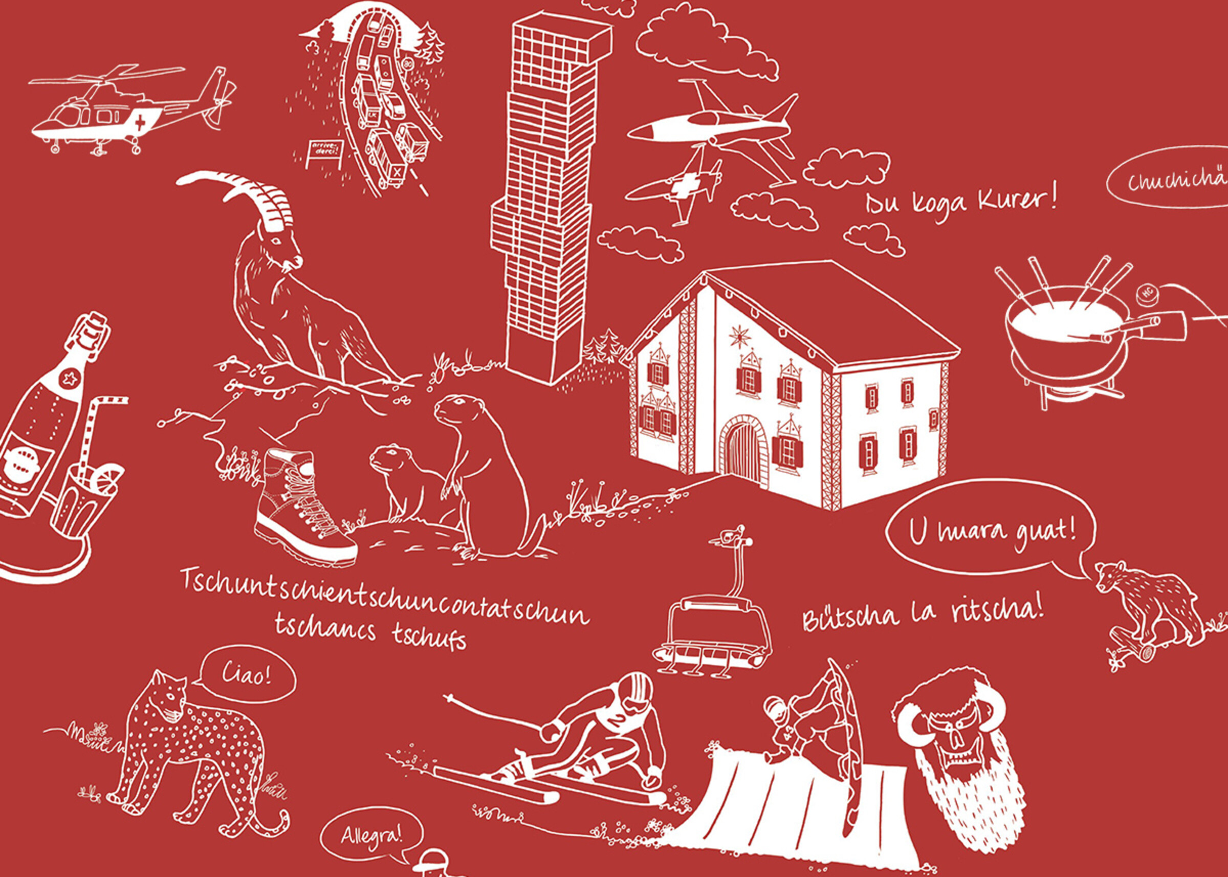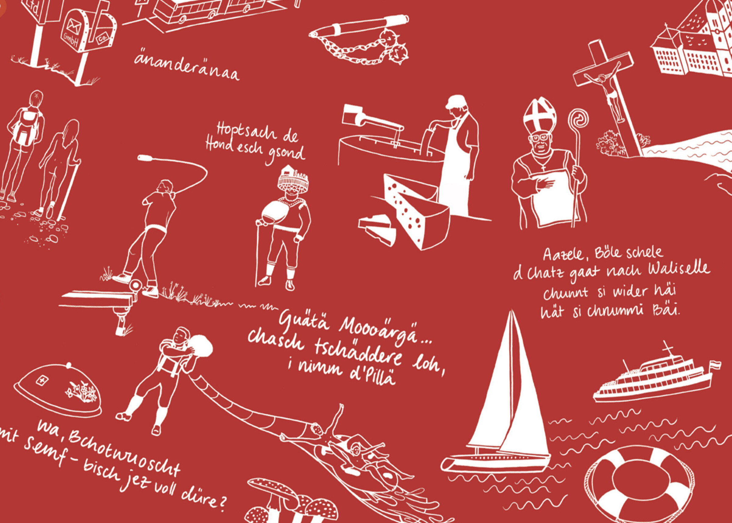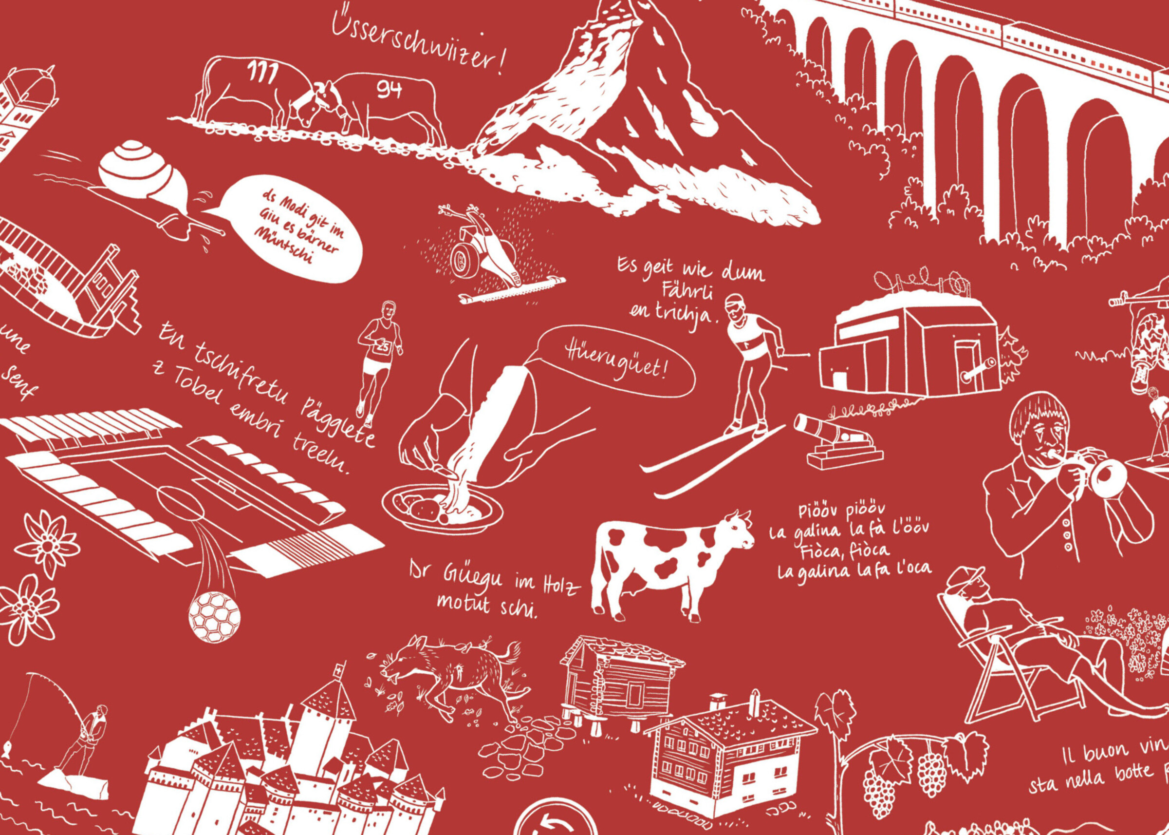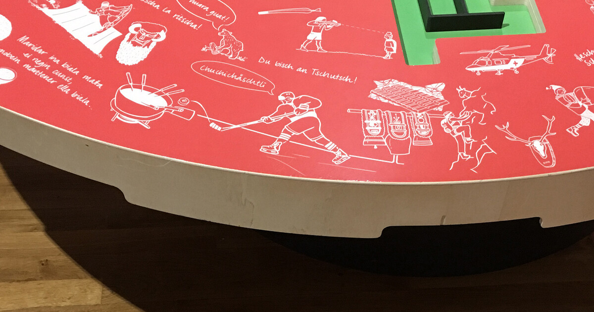 Die locker skizzierten Illustrationen visualisieren Vorurteile, die innerhalb der Schweiz über die einzelnen Kantone und Regionen verbreitet sind. Indem die Besucher:innen diese spielerische Herausforderung gemeinsam lösen, setzen sie sich aktiv mit dem Thema auseinander. Dieses Exponat realisierten wir in enger Zusammenarbeit mit den Szenografen der Dauerausstellung im Eingangsbereich des Museums.