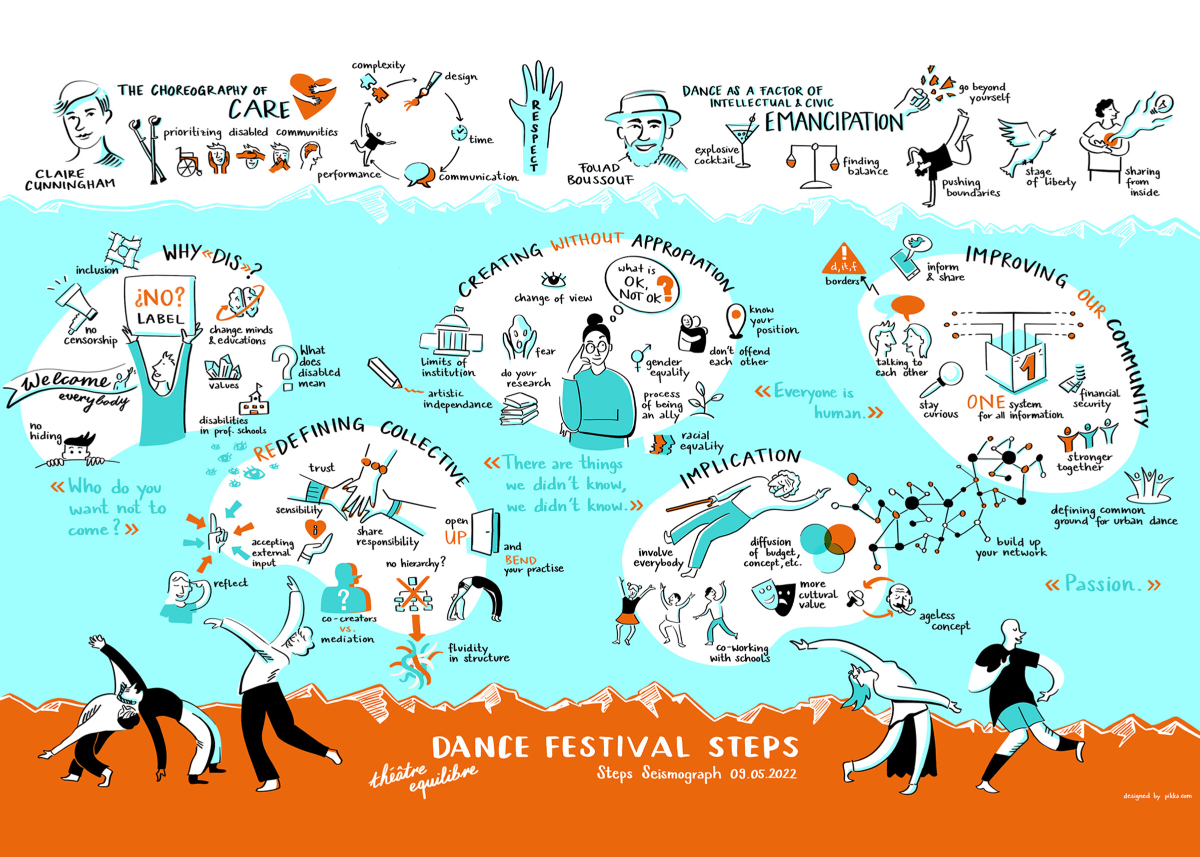 Im Auftrag des Migros-Kulturprozent ist am Tanzfestival Steps in Fribourg ein lebendiges Graphic Recording entstanden, das die aktuelle Themen und Diskussionen der Schweizer Tanzszene einfängt.