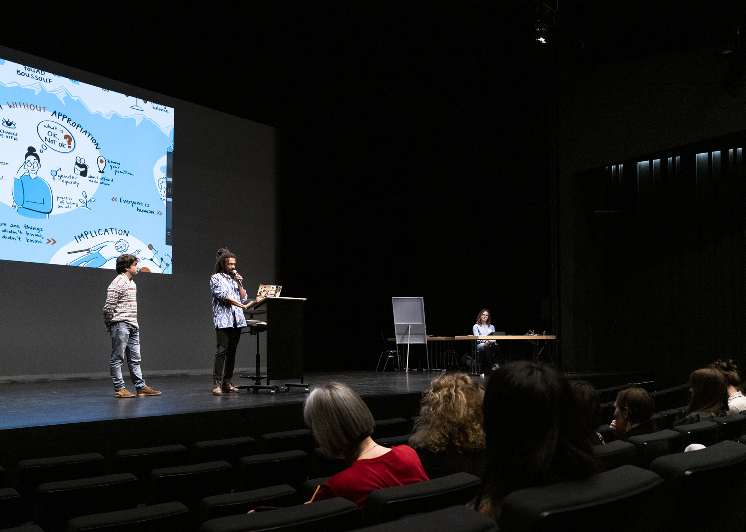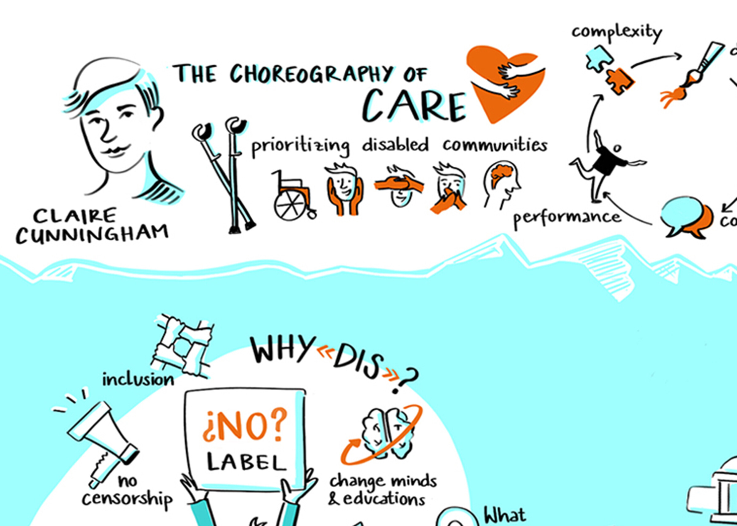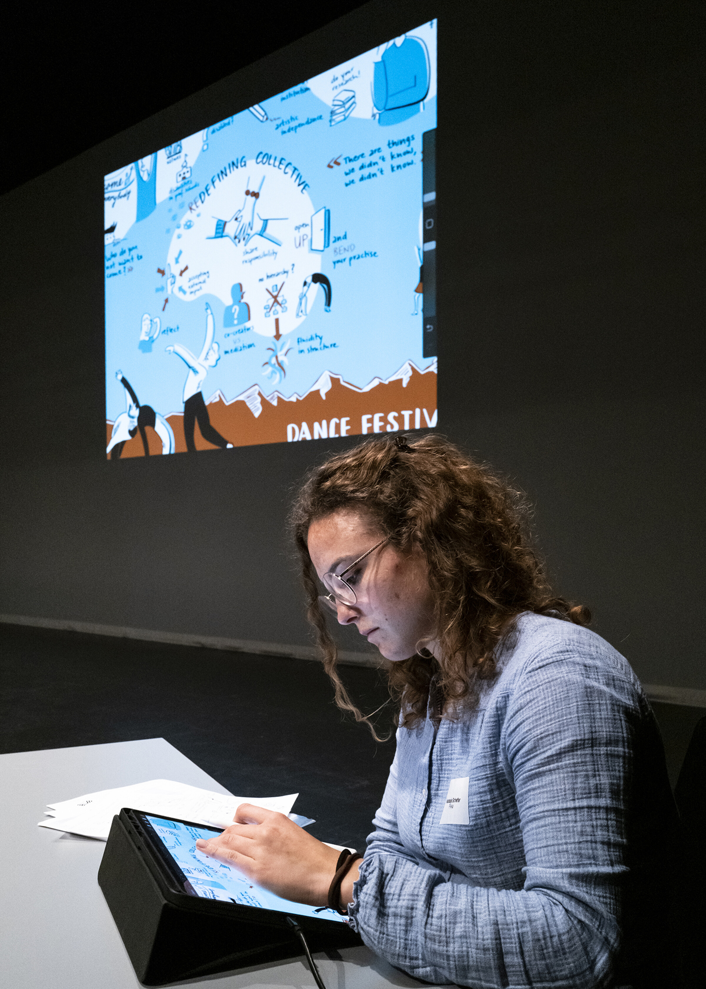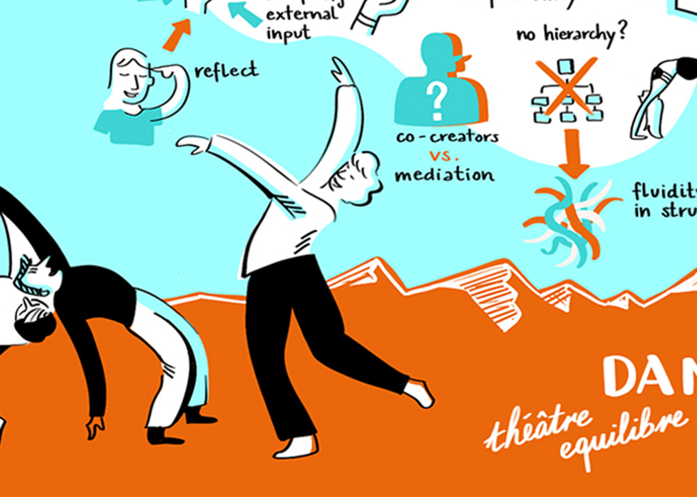 Begegnungen, Wissenstransfer, Vorträge und Reflexionen: Die ganztägige Konferenz im Théâtre Equilibre in Fribourg lud ChoreografInnen und TänzerInnen zum aktiven Austausch ein. Nebst Referaten von renommierten ChoreografInnen trafen sich die Tanzschaffenden in Gruppen und tauschten sich über selbst bestimmte Themen aus. Die erarbeiteten Diskussionspunkte hielten wir als Take-away für die Teilnehmenden in einem lebendigen Graphic Recording fest.