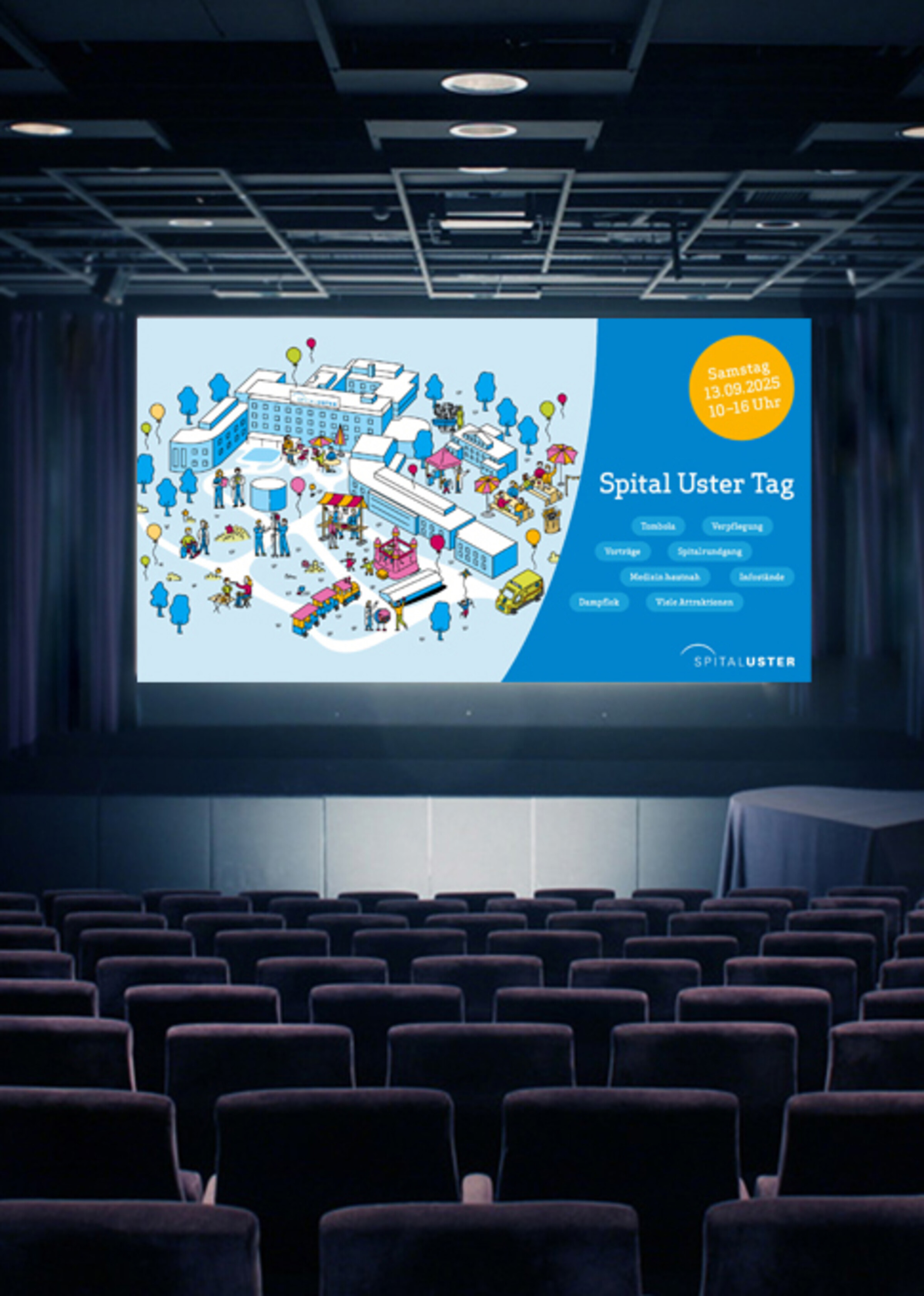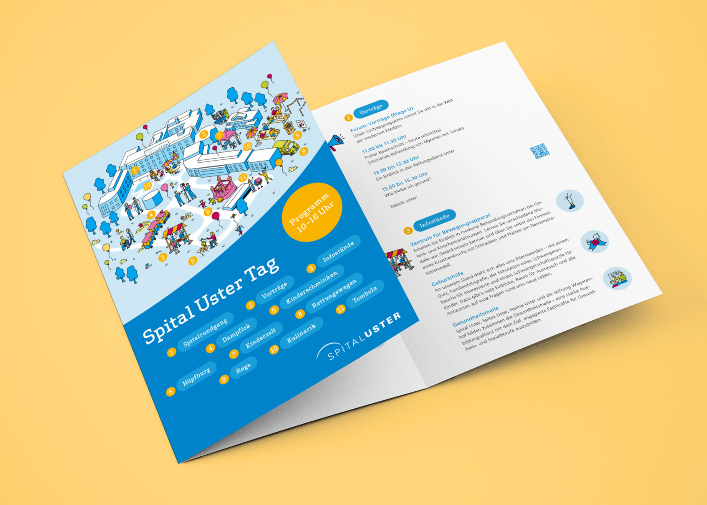 Wir haben die zahlreichen Programmpunkte auf dem Spitalgelände als lebendige Szene umgesetzt – mit einem Bild, das spielerisch informiert und verbindet. Ergänzend dazu entstanden Icons, ein einheitliches Layoutsystem mit begleitenden Gestaltungselementen und diverse Medienumsetzungen.