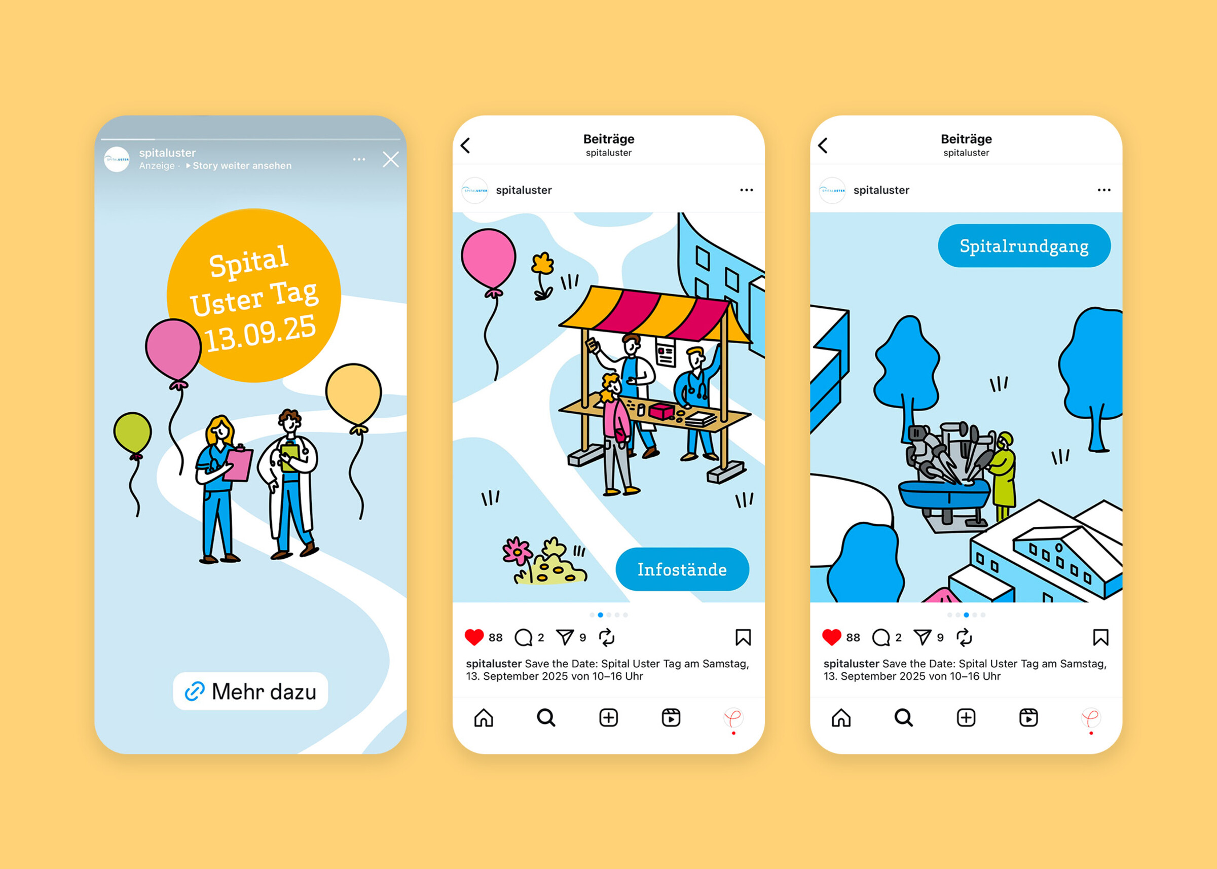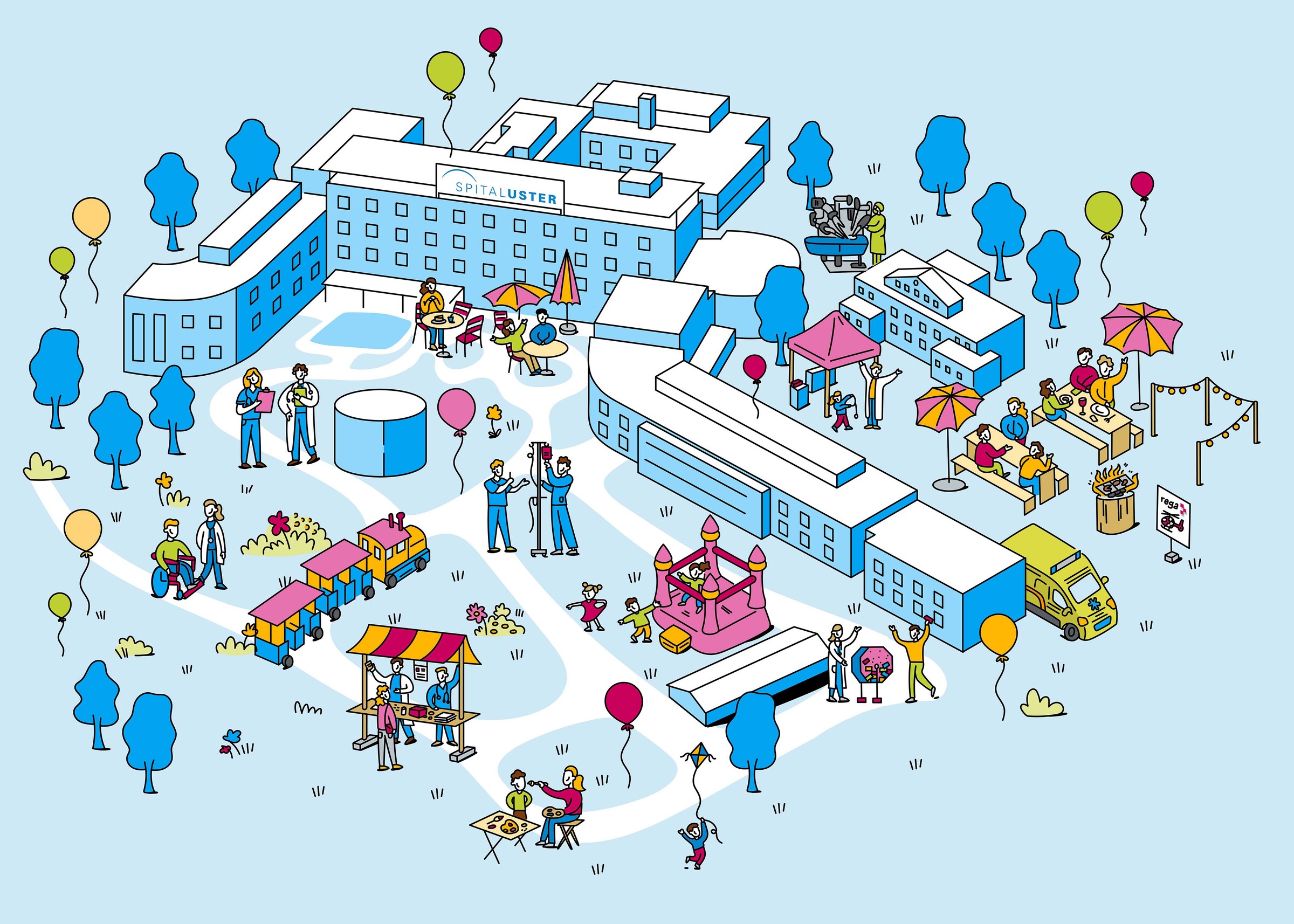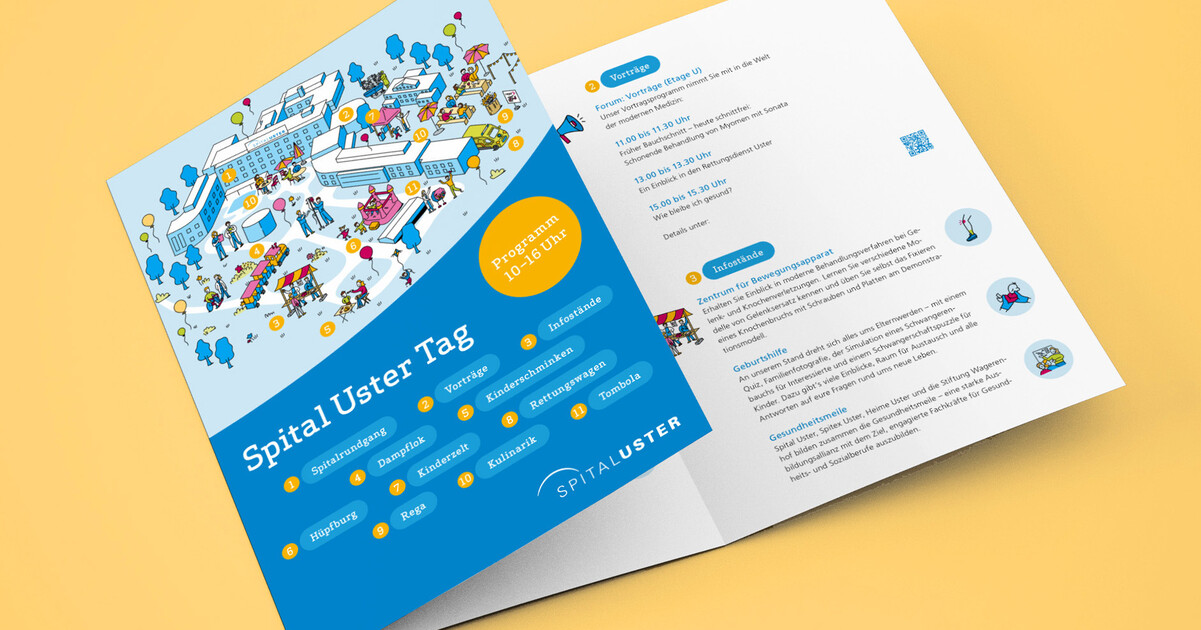 Mit einem Blick erfassen, was wo passiert – und dabei die kleinen, liebevollen Details entdecken: Das Wimmelbild zum Tag der offenen Tür im Spital Uster macht Lust auf den Anlass und hilft, sich mit Leichtigkeit zurechtzufinden. Es bildet das Herzstück eines visuellen Auftritts, der sich durch verschiedene Medien zieht.