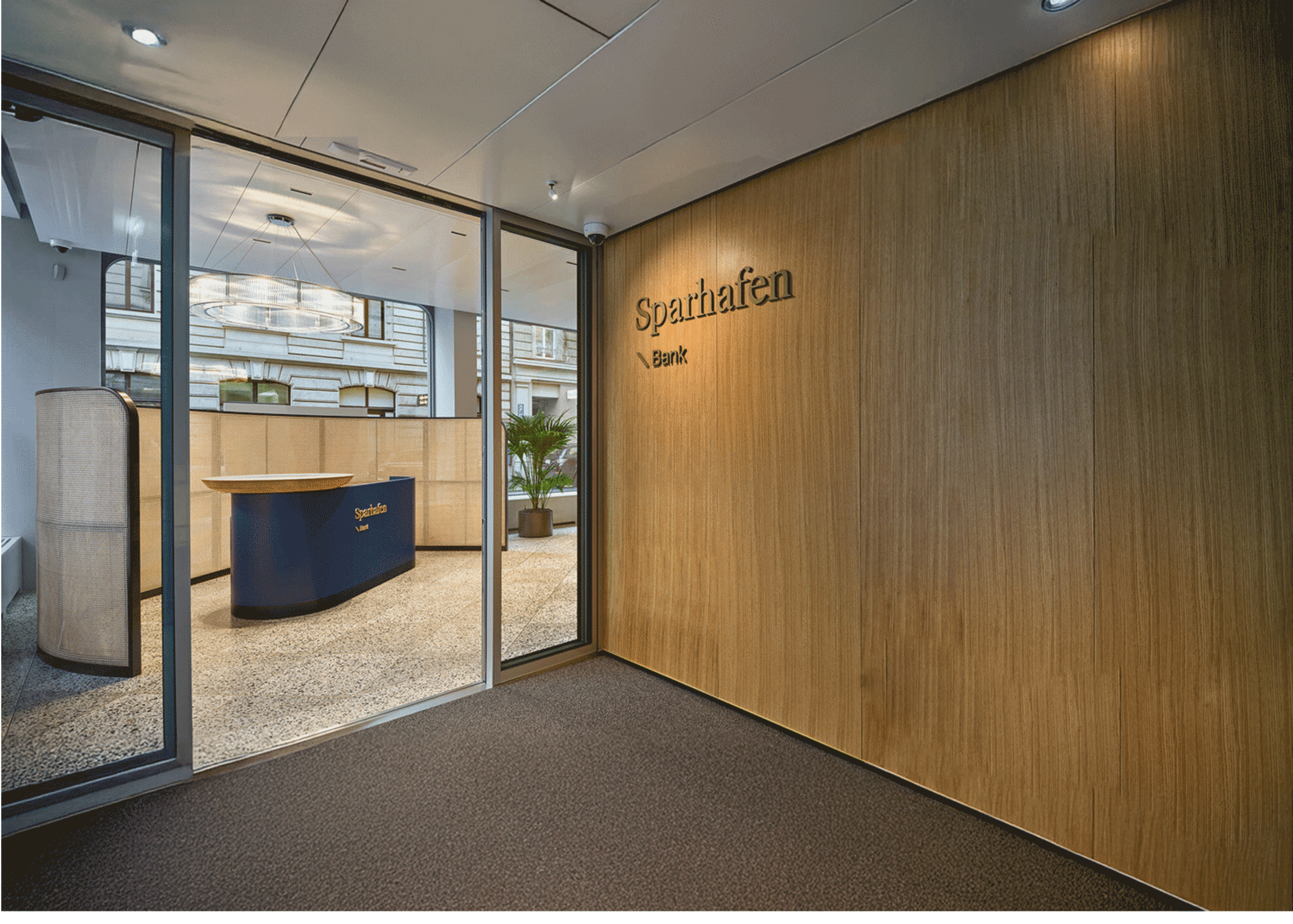 Die Signaletik verbindet klassische Typografie mit einer zeitgemässen, dezenten Gestaltung. Sie leitet Kund:innen durch die Bank und fügt sich nahtlos in die hochwertige Materialität der Innenarchitektur ein. So entsteht ein Leitsystem, das nicht nur funktional, sondern auch atmosphärisch zum besonderen Charakter der Sparhafen Bank beiträgt.