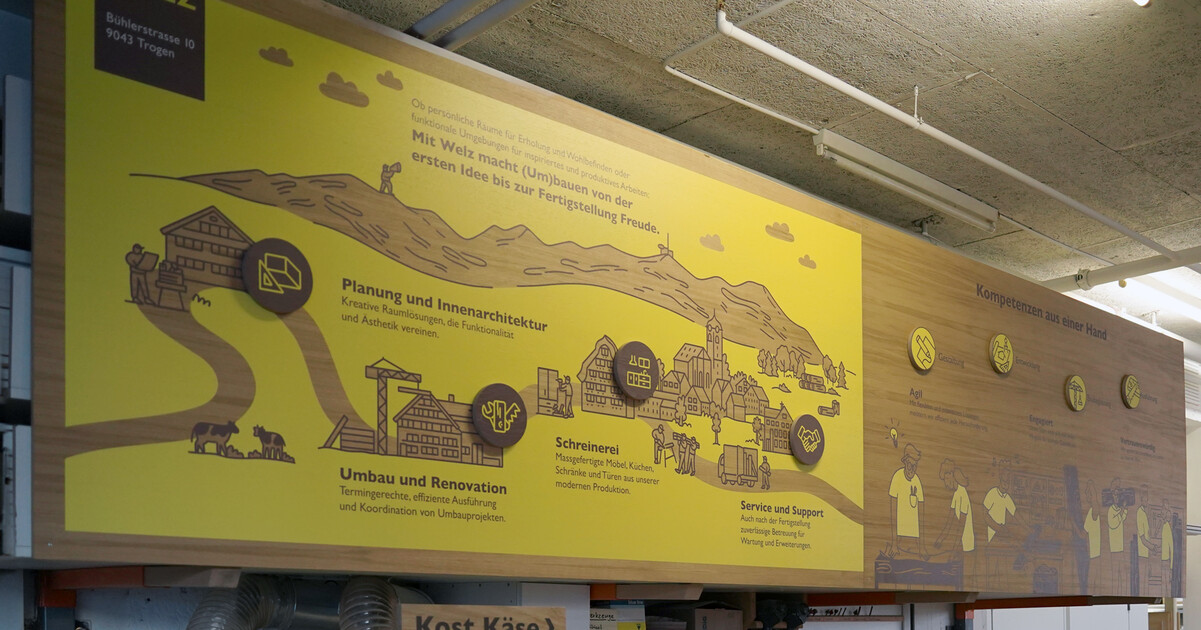 Klar visualisiert und passend zum Unternehmen auf eine grosse Holzplatte gedruckt: So präsentiert sich die Vision der Schreinerei Welz. Direkt an der Werkstattwand bleiben die Werte und Leitsätze für die Mitarbeitenden präsent und nachhaltig in Erinnerung.
